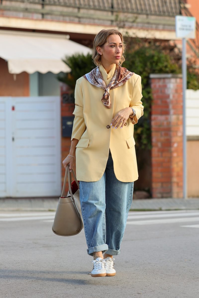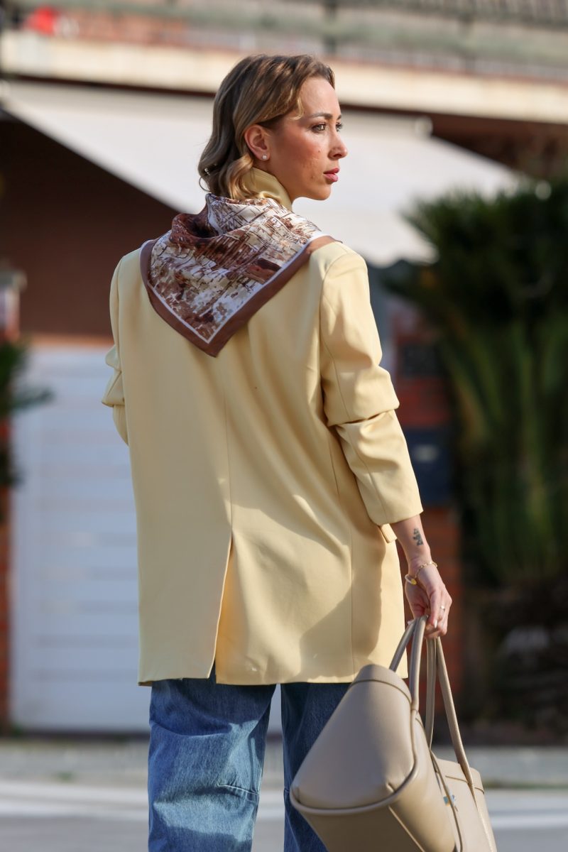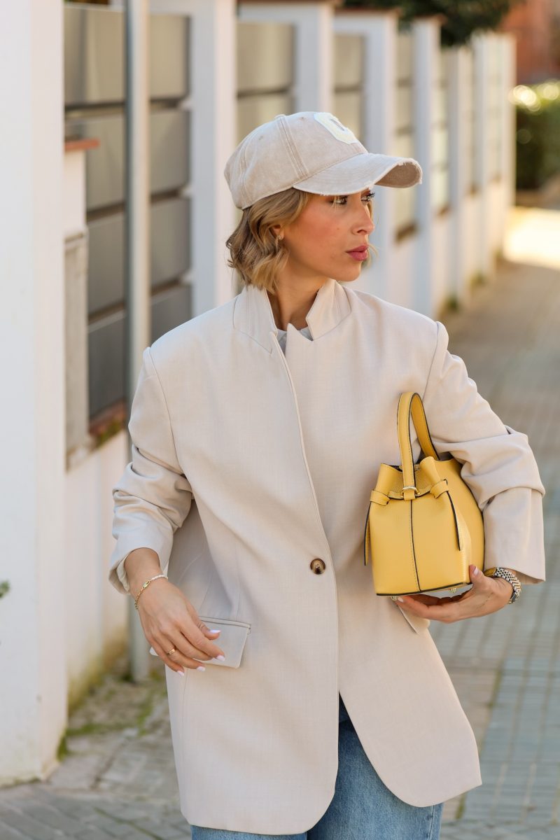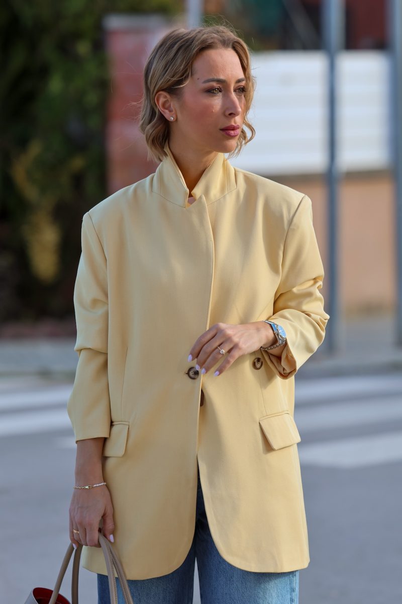 Americana de corte oversize, con diseño relajado y estructura ligera. Presenta cierre frontal, bolsillos y un fit cómodo que aporta un aire actual y versátil.