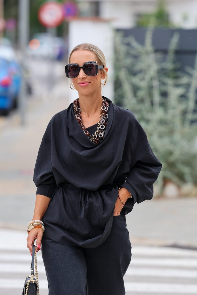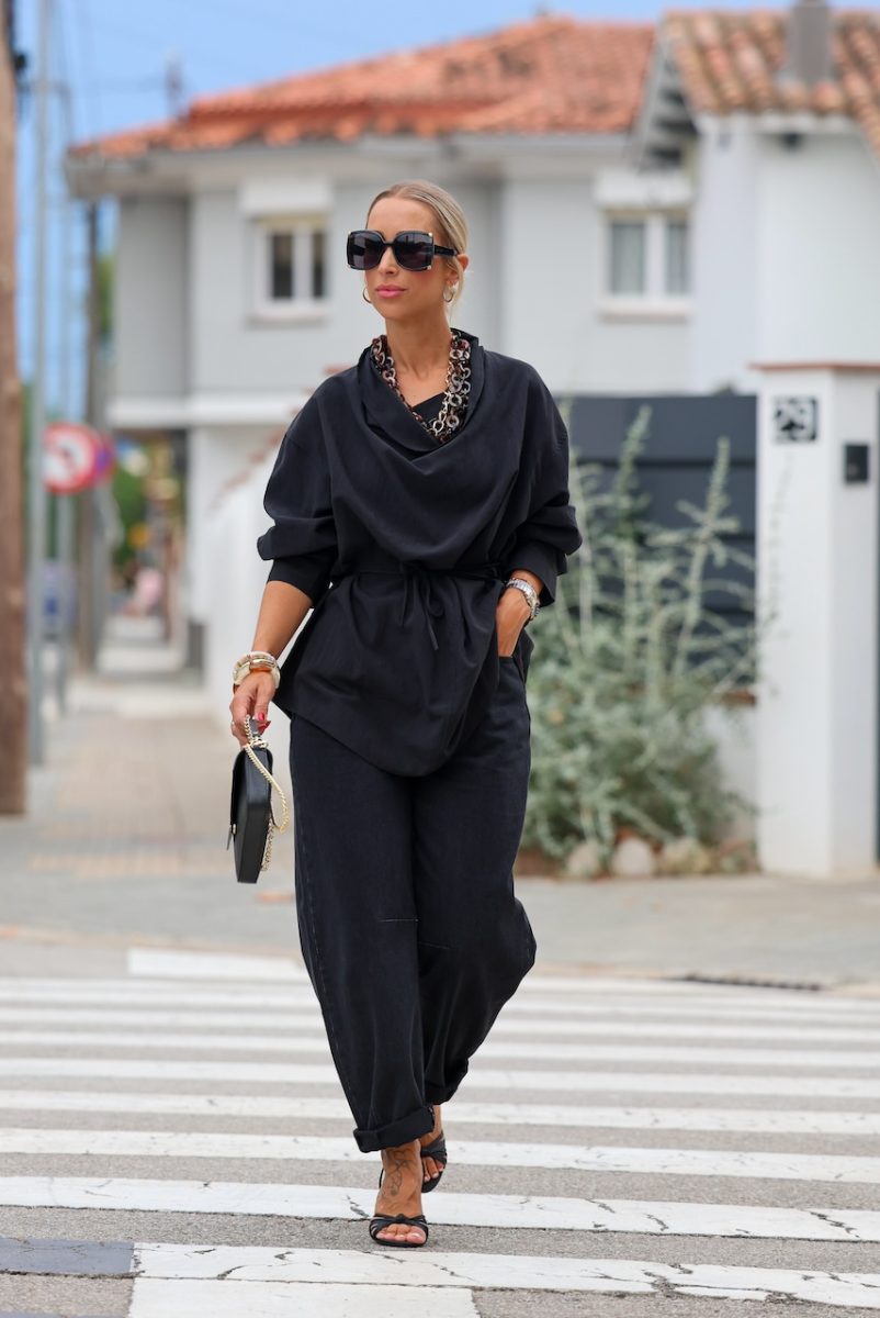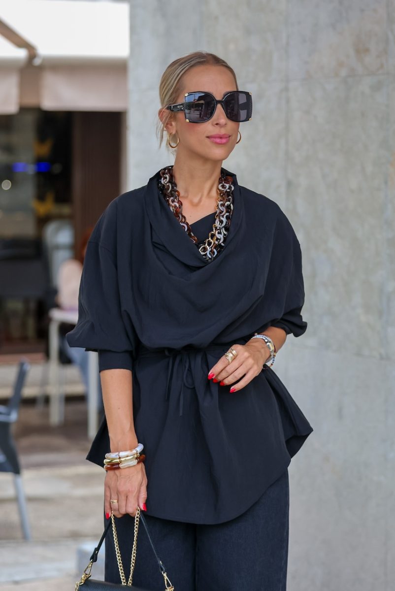 Blusa de color NEGRO con cuello drapeado y cinturón. Corte suelto, con caída ligera y mangas largas. Cuello drapeado, que aporta un toque sofisticado. Detalle del cinturón fino a juego para ajustar a la cintura y realzar la silueta. Talla única. Hada talla L.