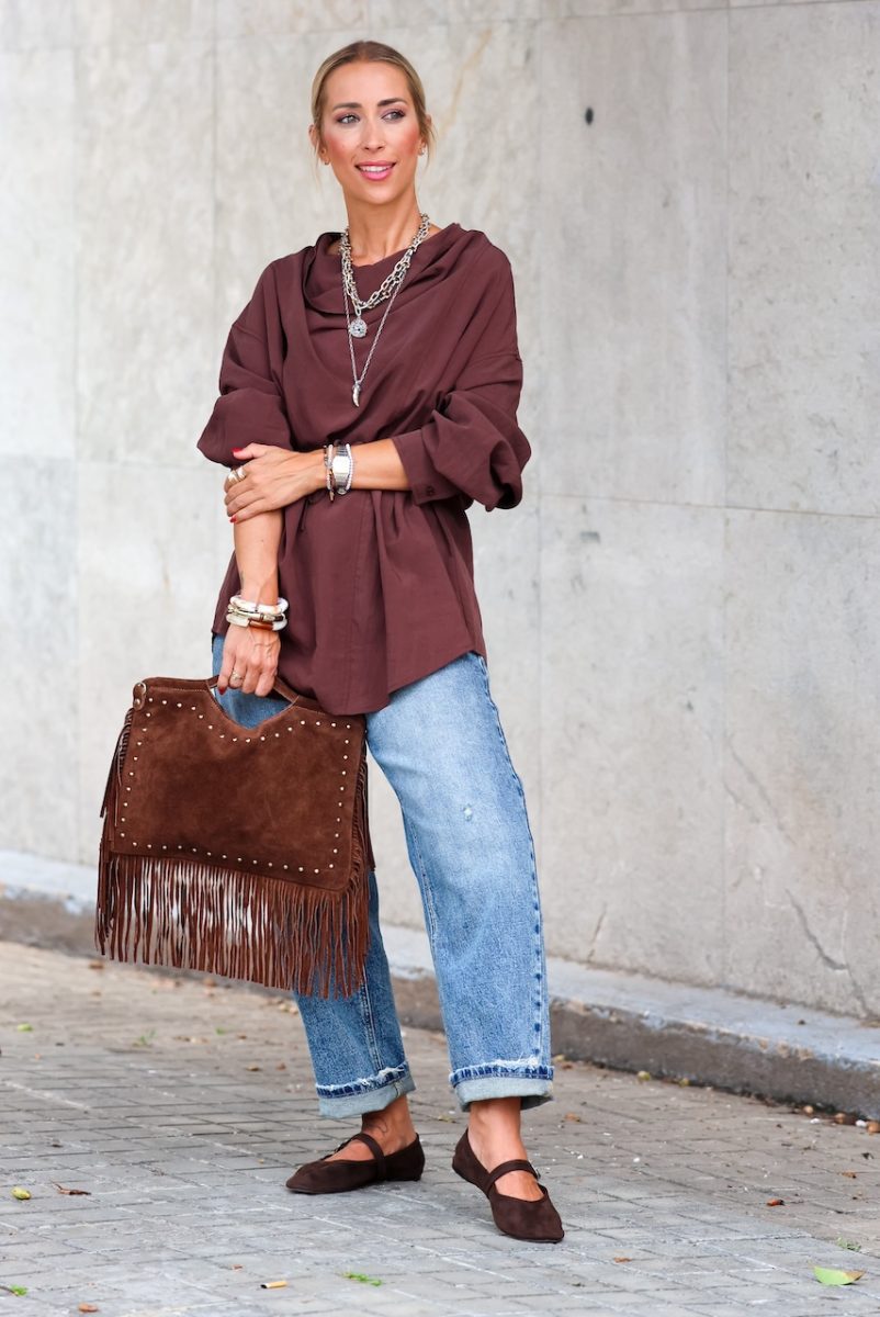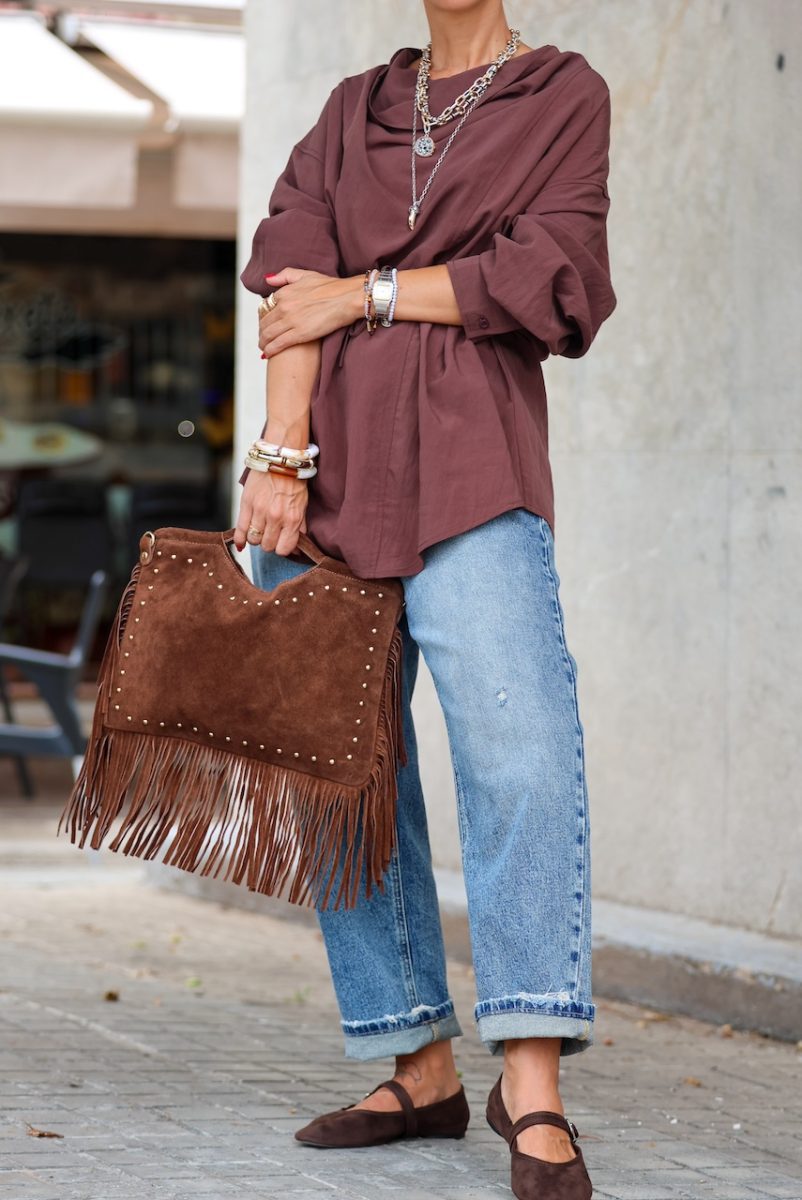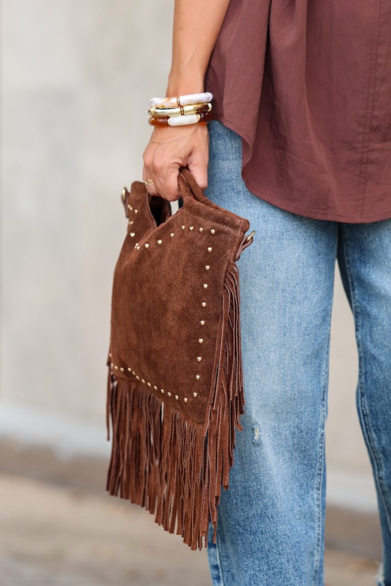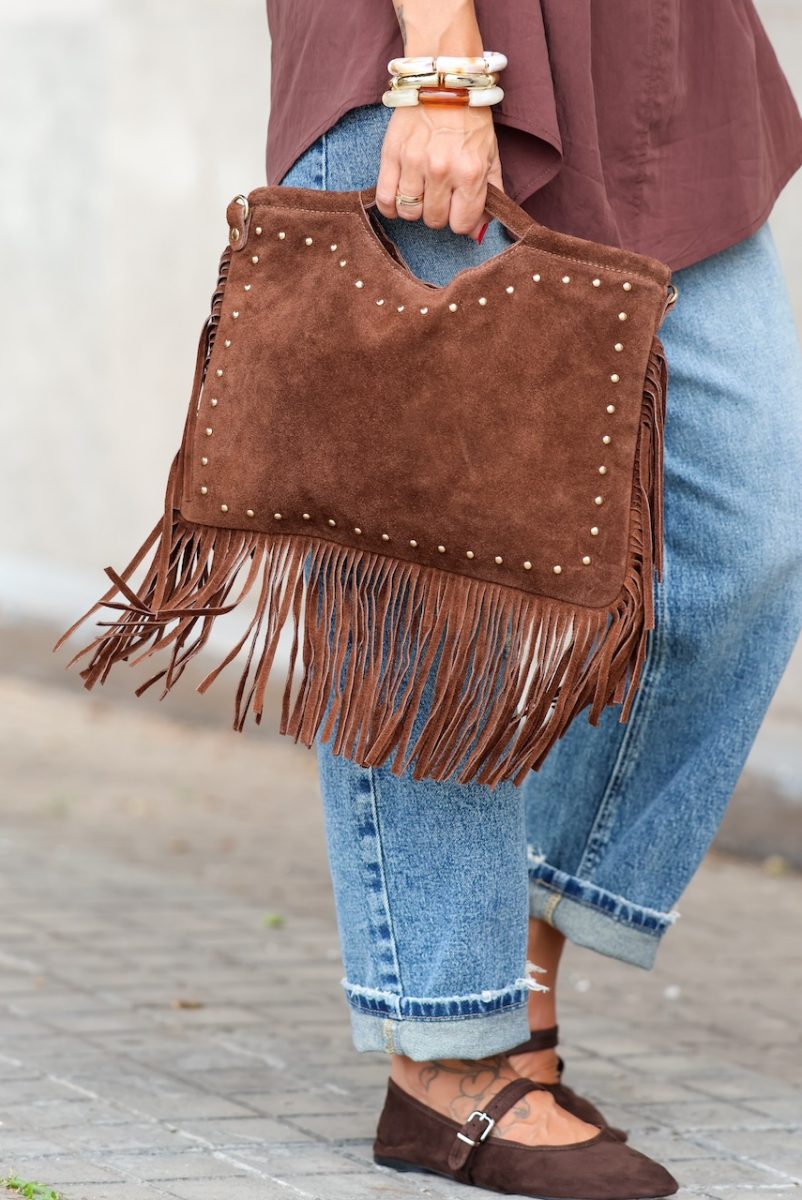 Bolso de piel con tachas doradas tipo carpeta con asa pequeña y opción de bandolera. Cierre con cremallera.