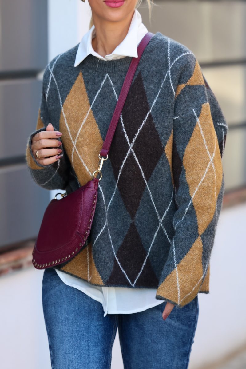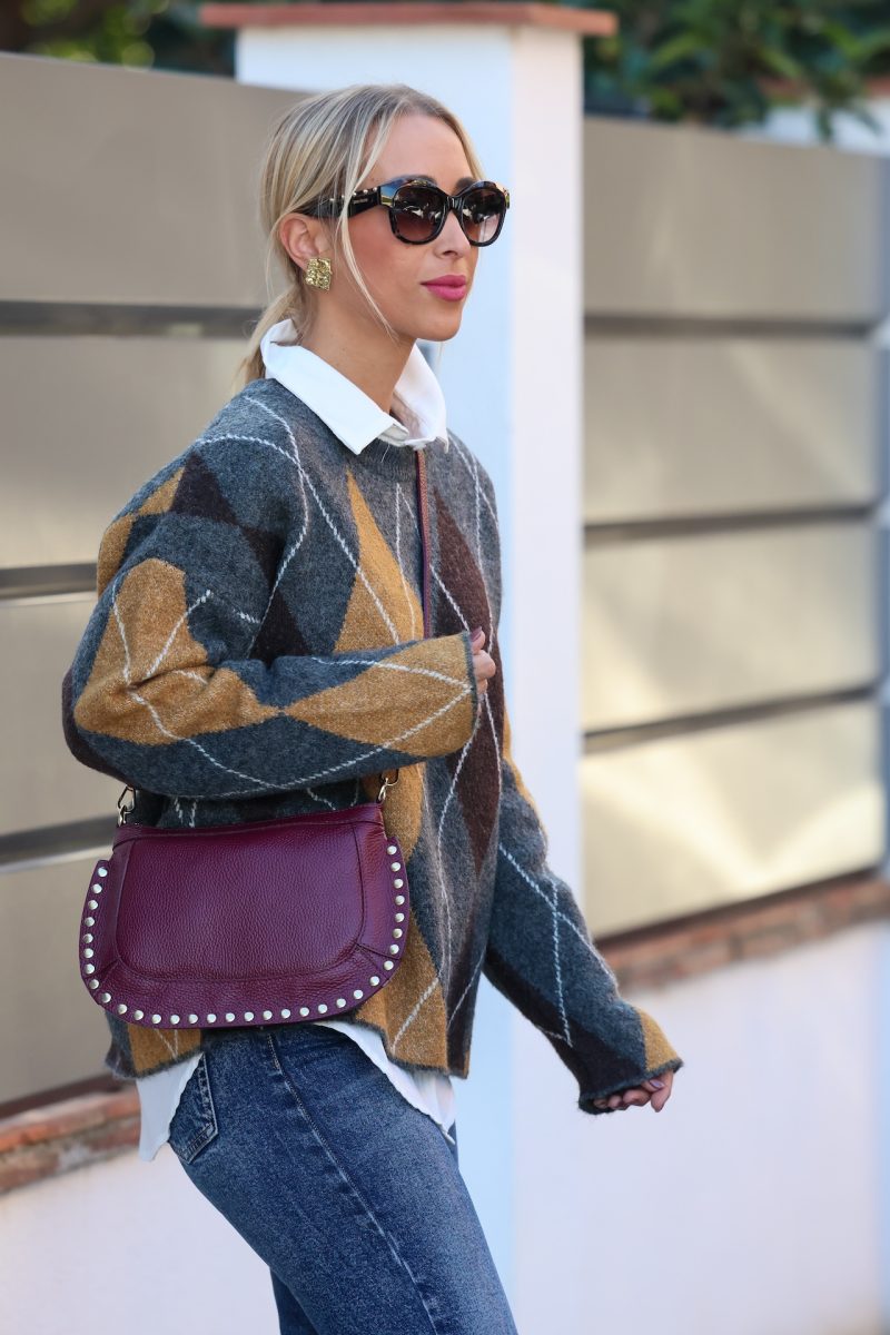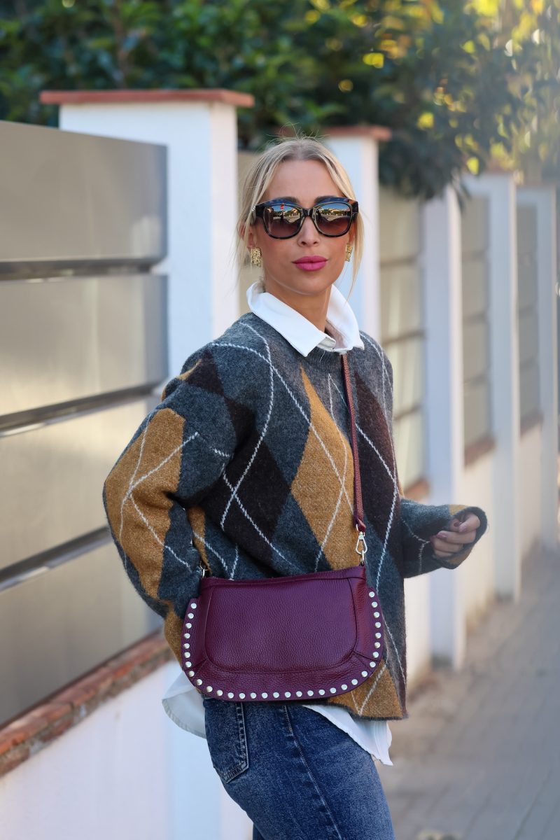 Bolso tipo bandolera en color burdeos con detalles de tachuelas en el borde. Un diseño versátil y con mucho estilo, perfecto para elevar tus looks de día y de noche. Incluye correa ajustable.