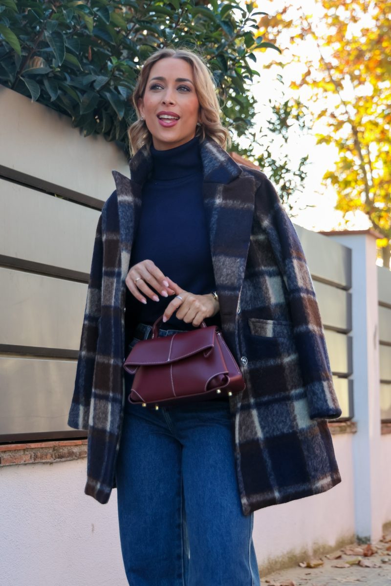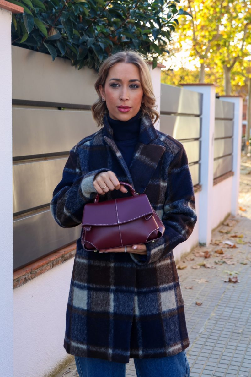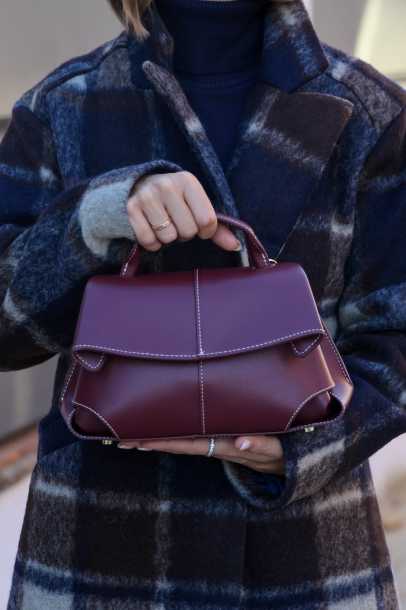 Bolso mini en piel burdeos, estructurado y con diseño geométrico que aporta un toque sofisticado a cualquier look. Compacto, elegante y muy combinable, es el accesorio ideal para elevar tus outfits de otoño e invierno.
