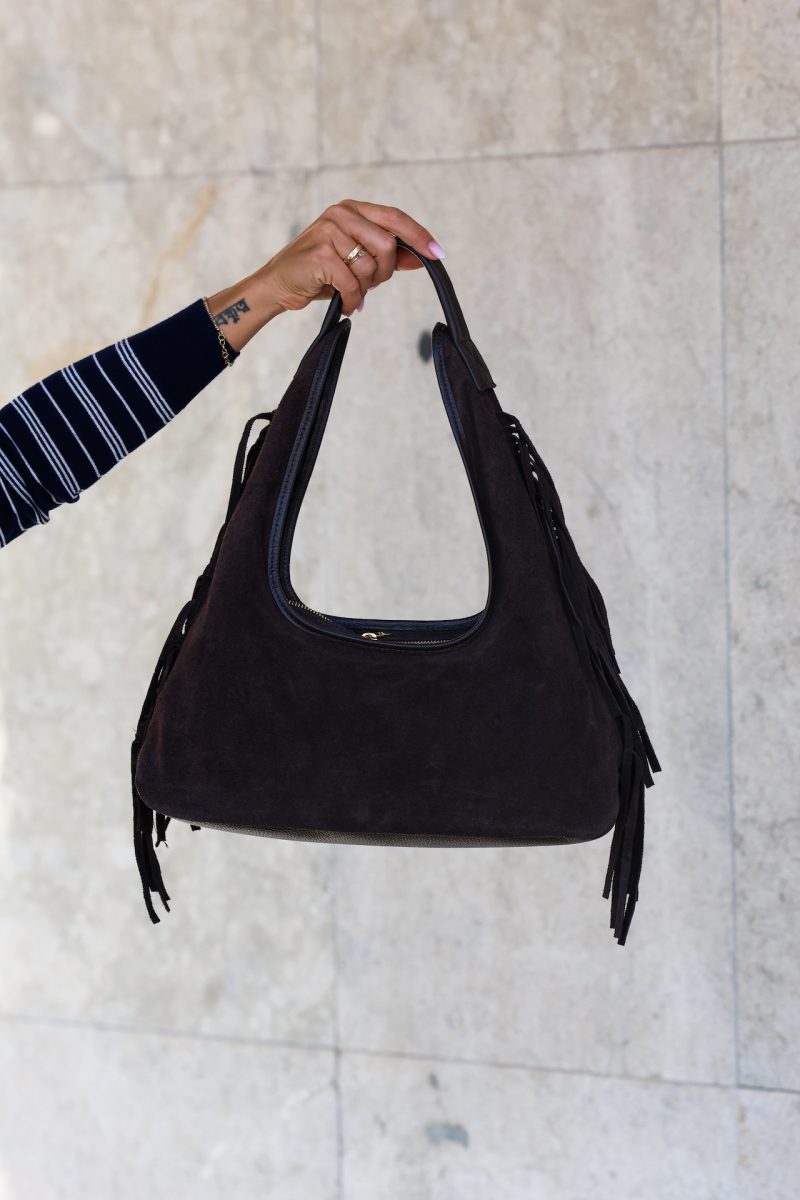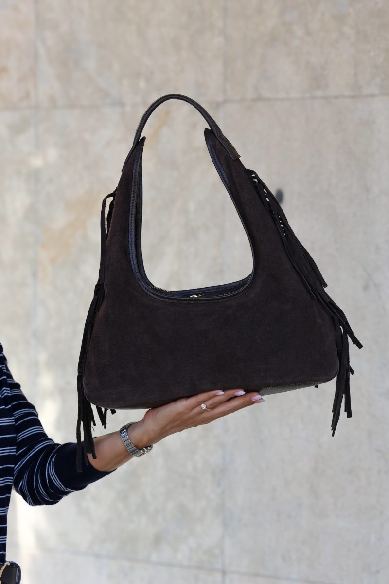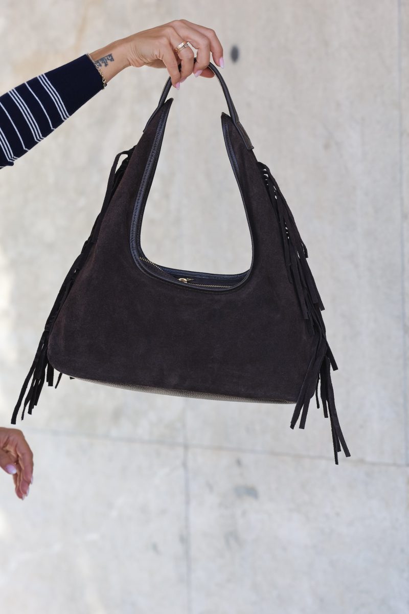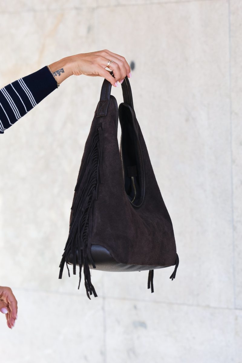Bolso media luna de piel con flecos, cierre con cremallera.