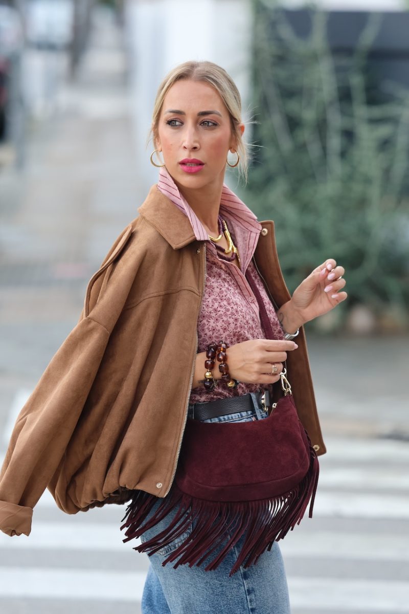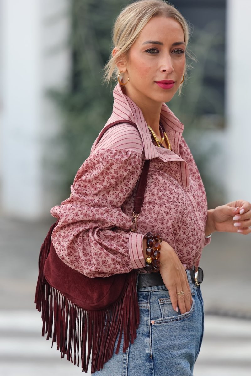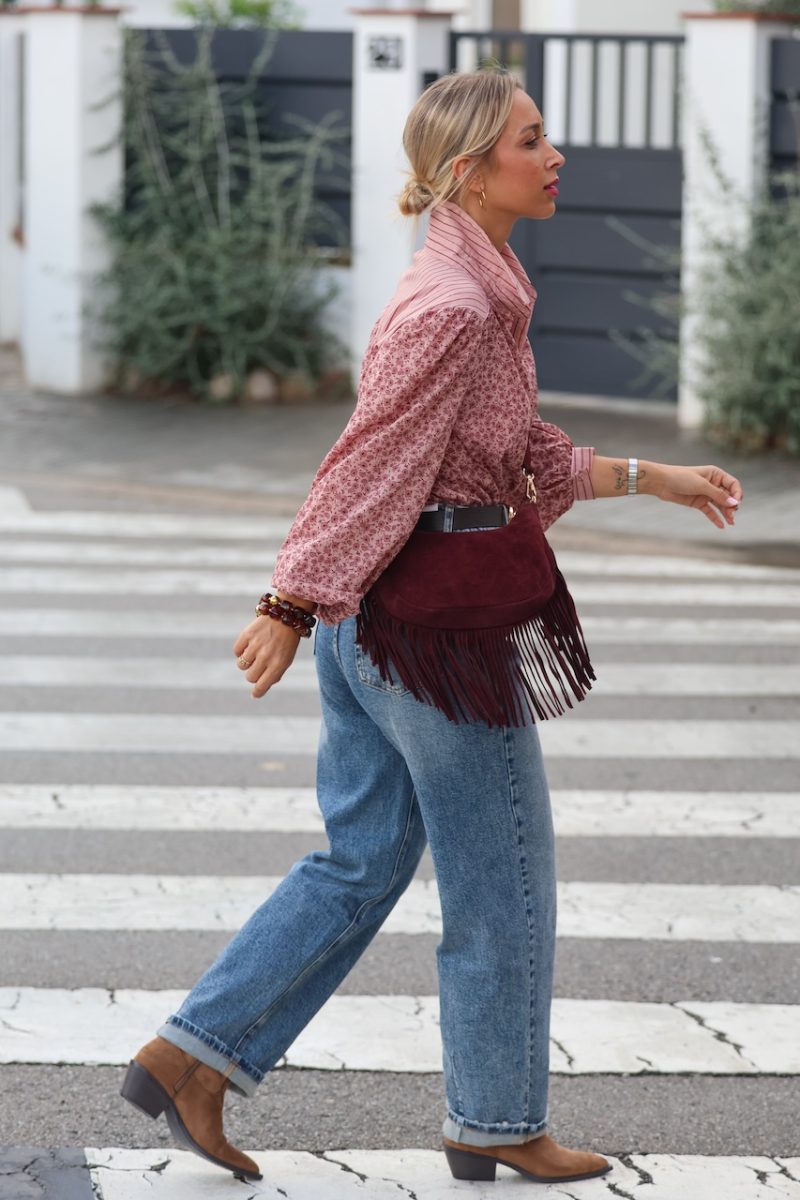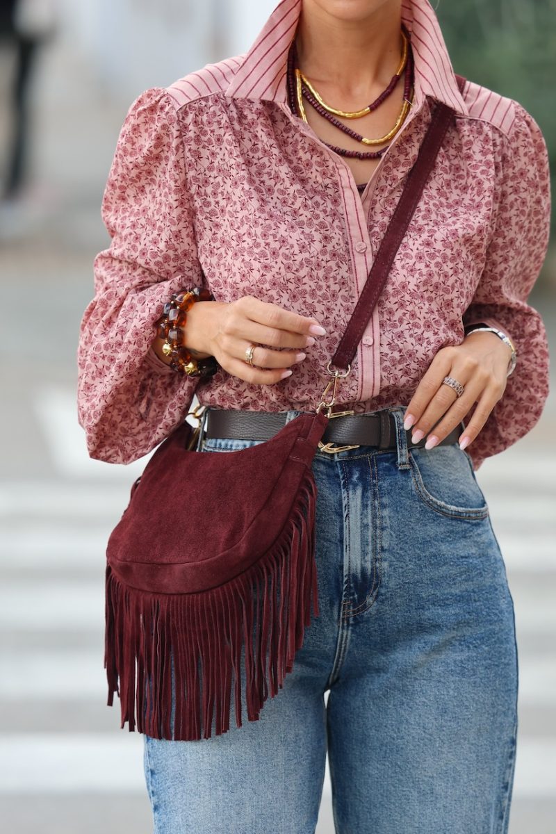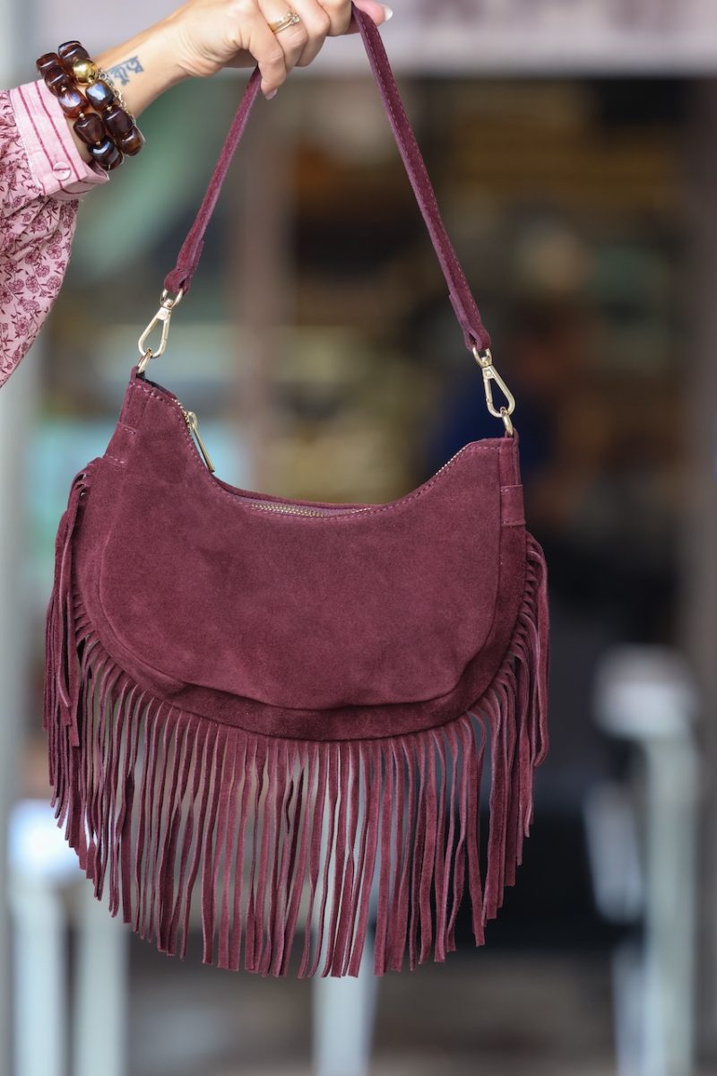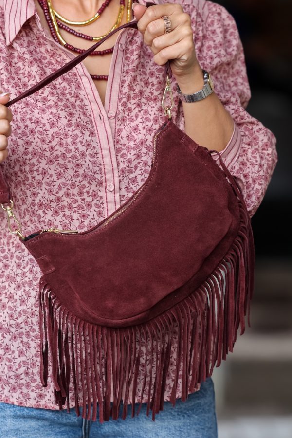 Bolso media luna de piel con flecos en color burdeos. Lleva dos correas de diferentes tamaños, una pequeña ideal para llevarla en el hombro y otra para llevarla tipo bandolera. Cierre de cremallera, forro interior y cremallera lateral. Si lo quieres en otro color, nos los puedes solicitar.