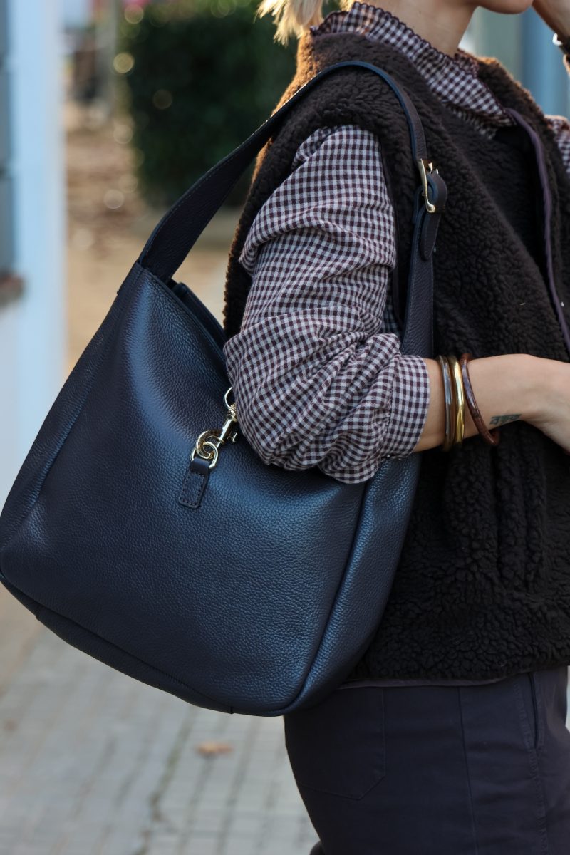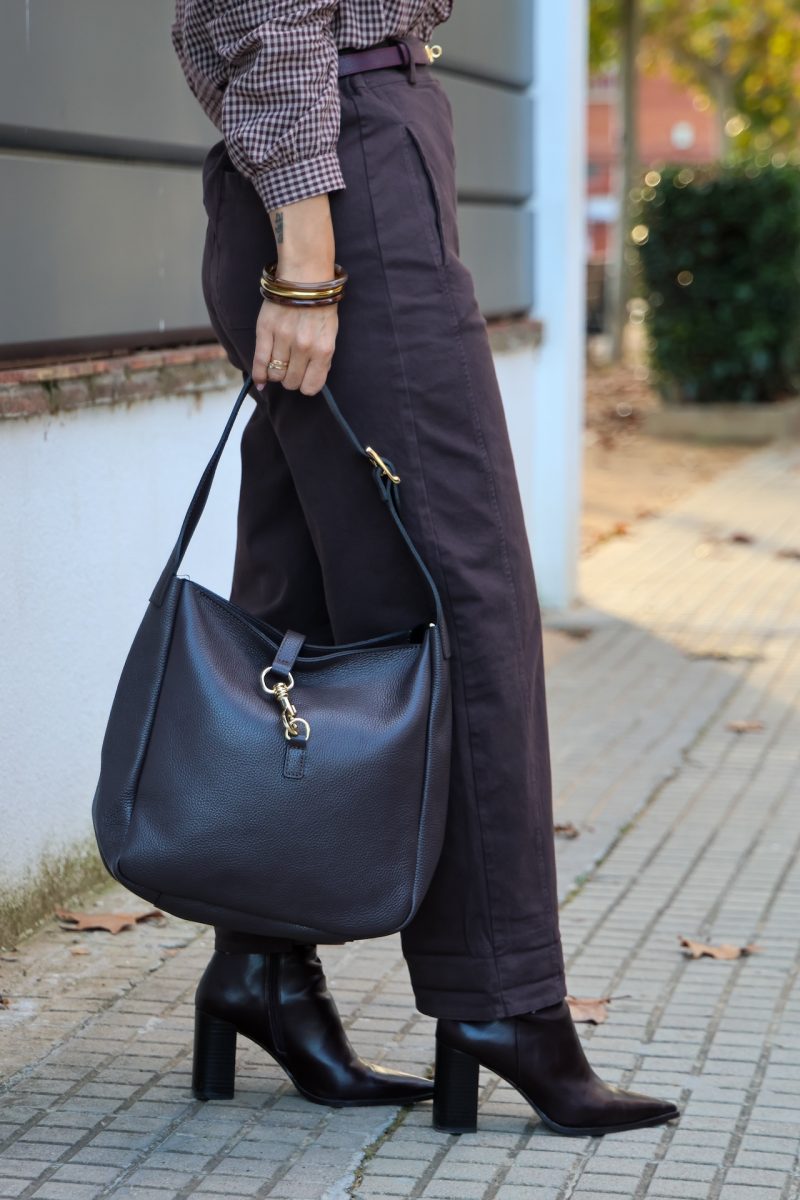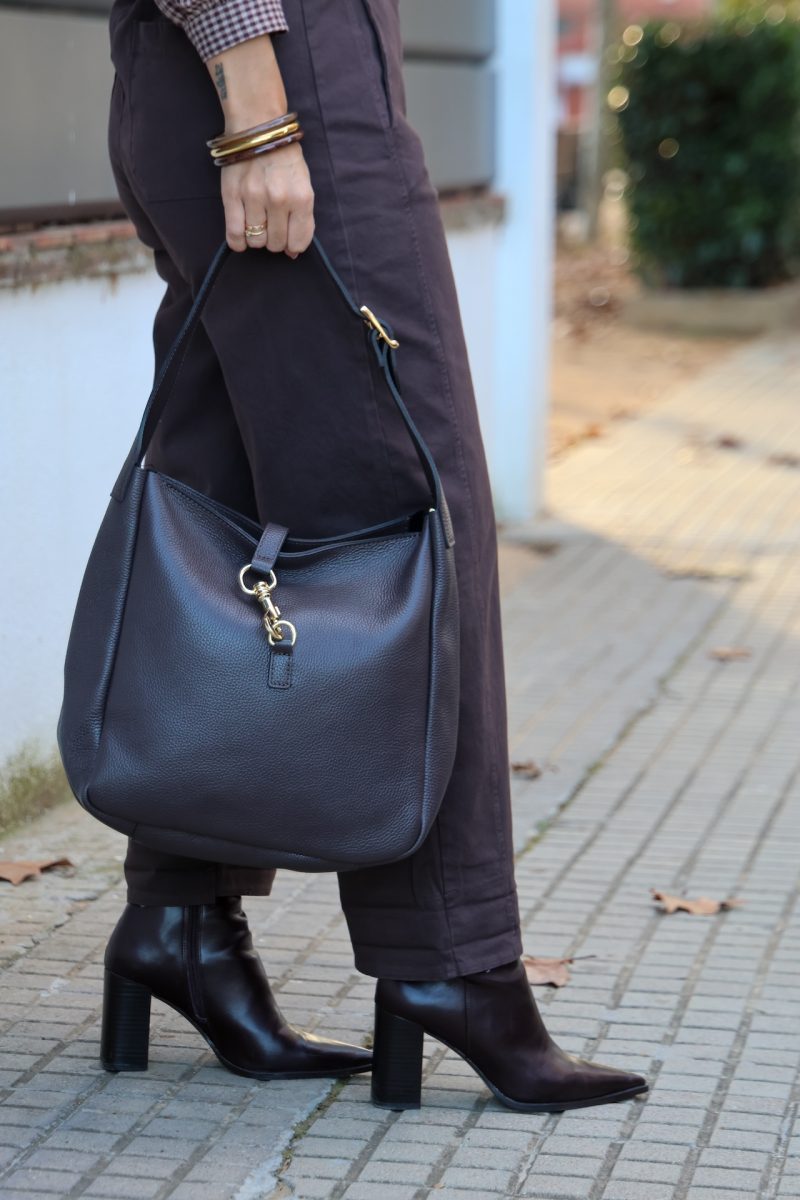 Este bolso de piel marrón combina practicidad y elegancia en una silueta amplia y flexible, perfecta para el día a día. Su textura natural y los detalles metálicos dorados aportan un toque de sofisticación sin renunciar a la comodidad.