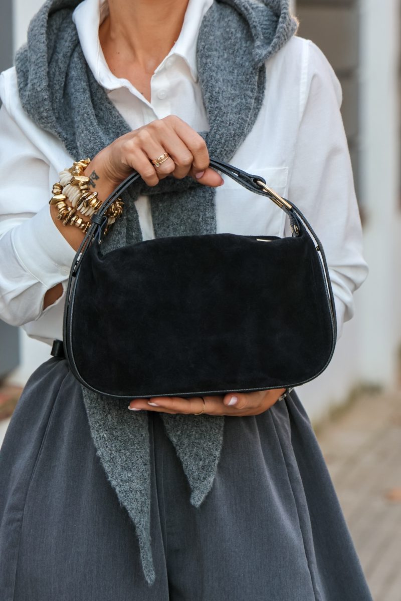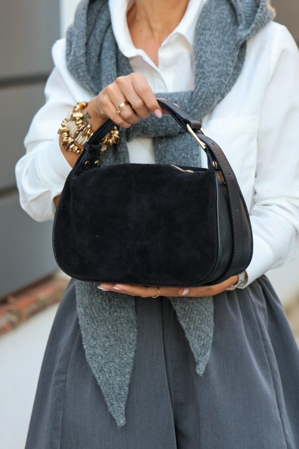 Este bolso en piel negra combina elegancia, funcionalidad y diseño atemporal. Su silueta estructurada y minimalista lo convierte en el complemento perfecto para cualquier ocasión, desde el día a día hasta una cena especial.