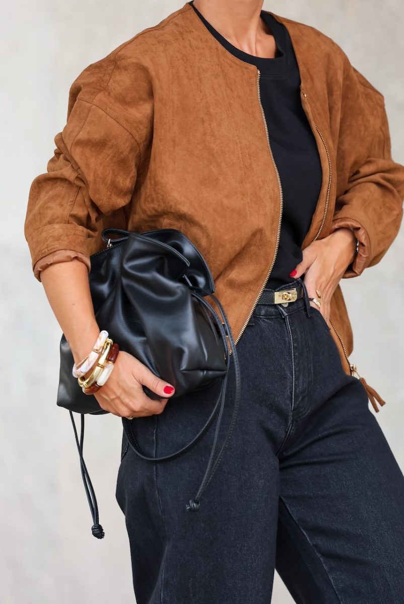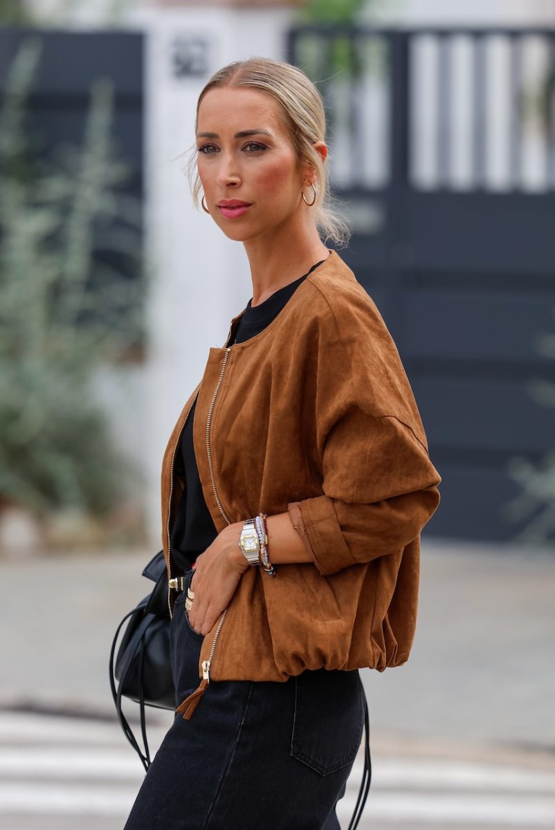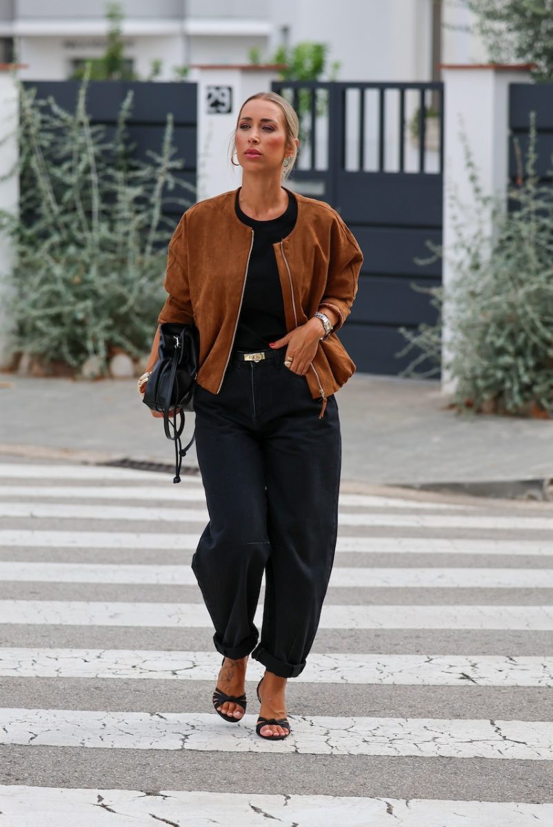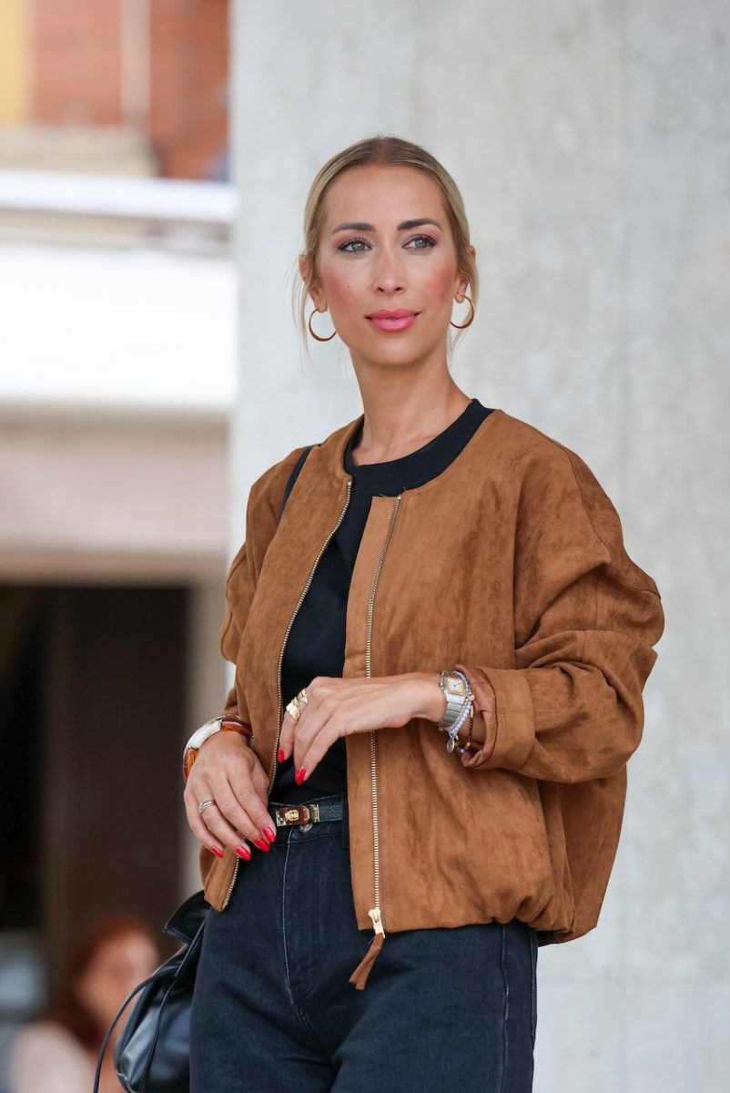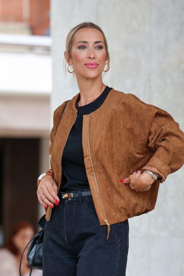 Chaqueta tipo bomber efecto ante de color camel o kaki. Material efecto ante suave y ligero. Diseño corte recto con cremallera frontal, sn cuello para un estilo minimalista y moderno. Terminación elástica en la parte baja para mejor ajuste. Talla doble, SM o ML. La modelo lleva la talla ML. Tallaje hasta XL.