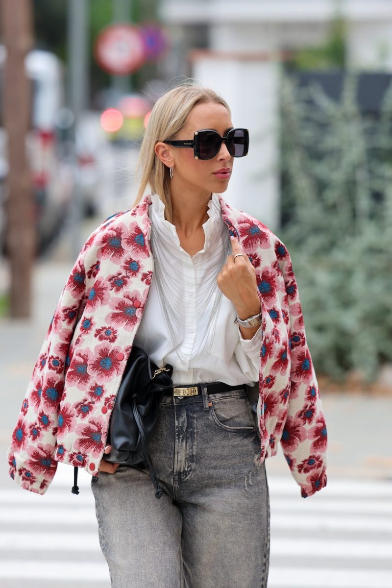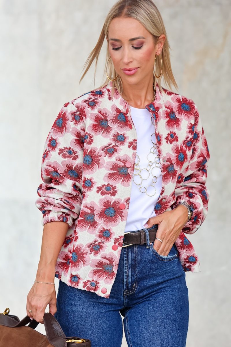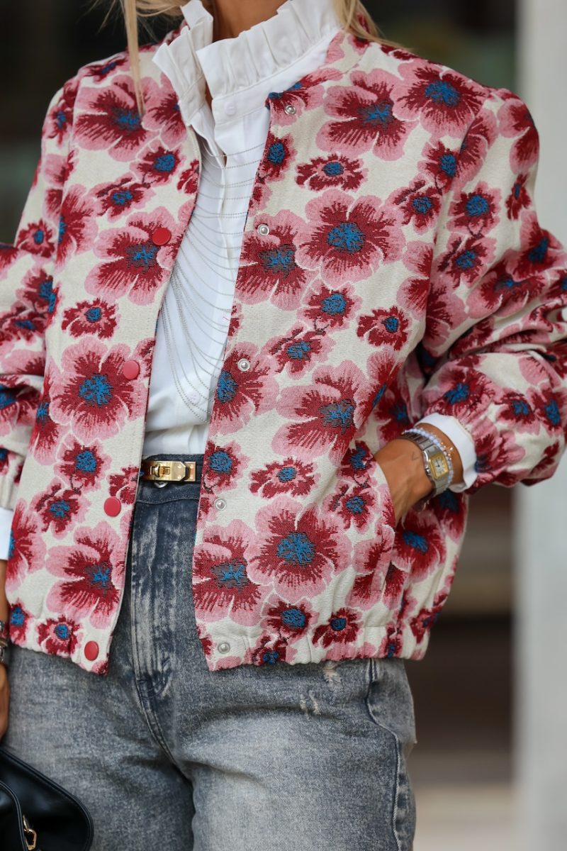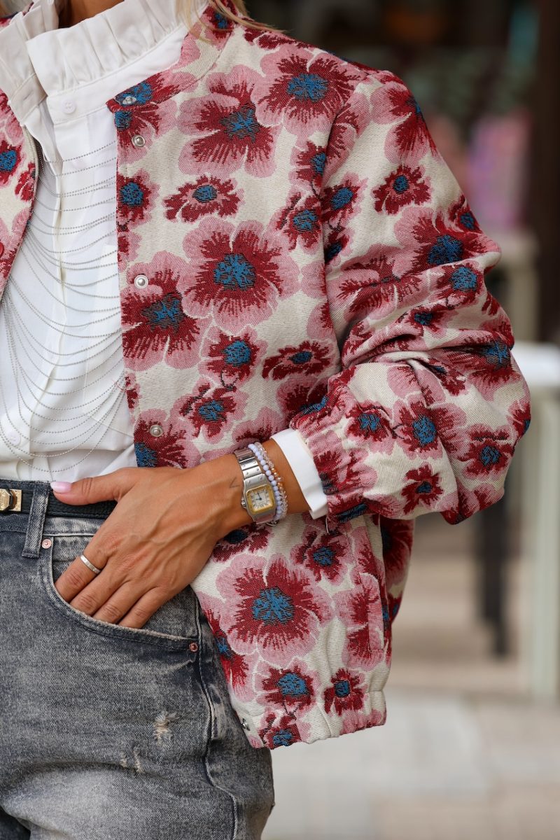 Chaqueta bomber estampada floral. Prenda llamativa versátil que aporta color y estilo. Chaqueta estilo bombeo con corte recto y cómodo. Estampado floral en tonos rojos y azules sobre fondo beige. Cierre frontal con botones a presión. Puños y bajo con acabado elástico para un ajuste perfecto. Talla de la modelo, s.