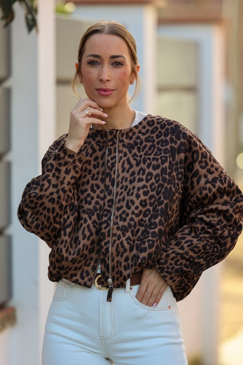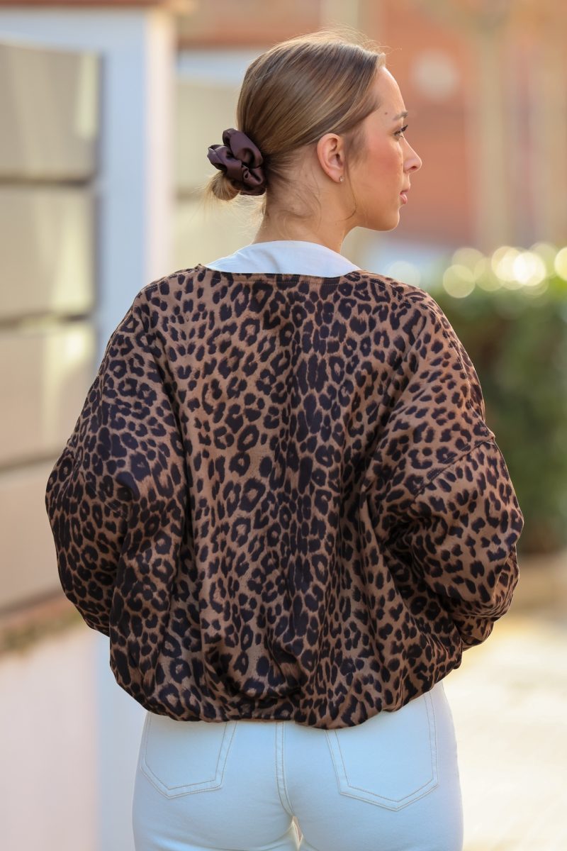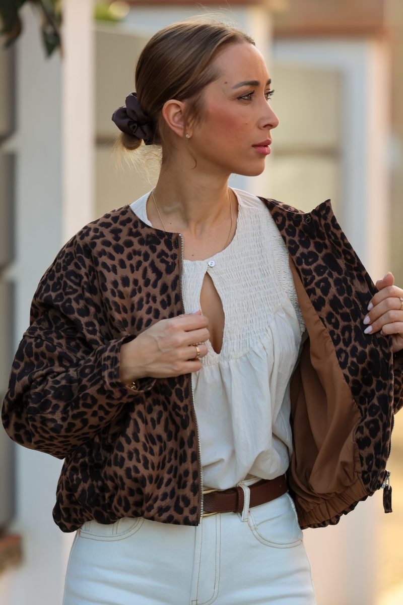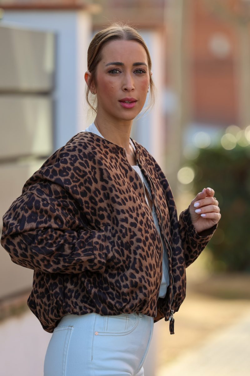 Bomber leopardo de corte relajado, con cierre frontal de cremallera y diseño ligero que aporta estilo y comodidad. Un básico con carácter que eleva cualquier look diario, ideal para combinar con vaqueros, pantalones de vestir o vestidos. Una prenda versátil y atemporal para dar un toque trendy a tus outfits.