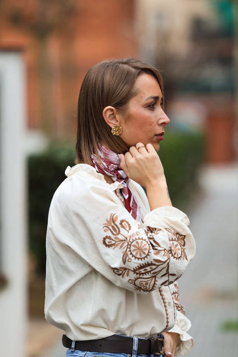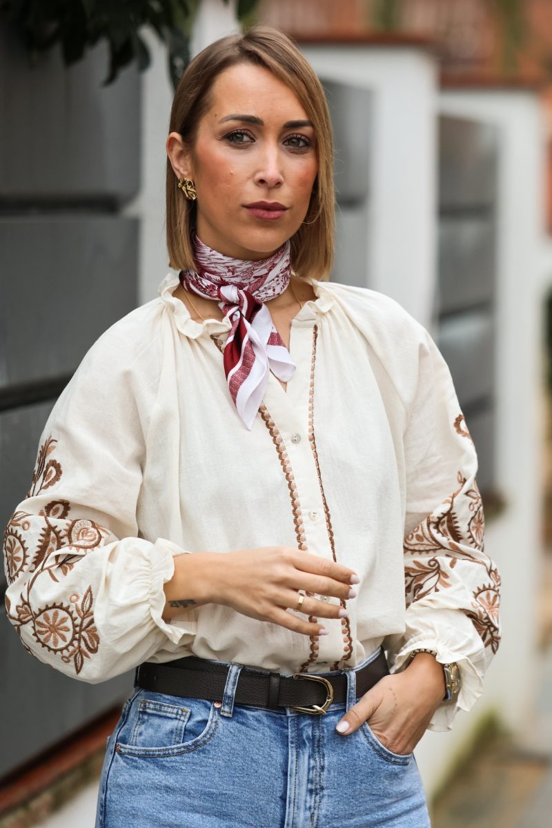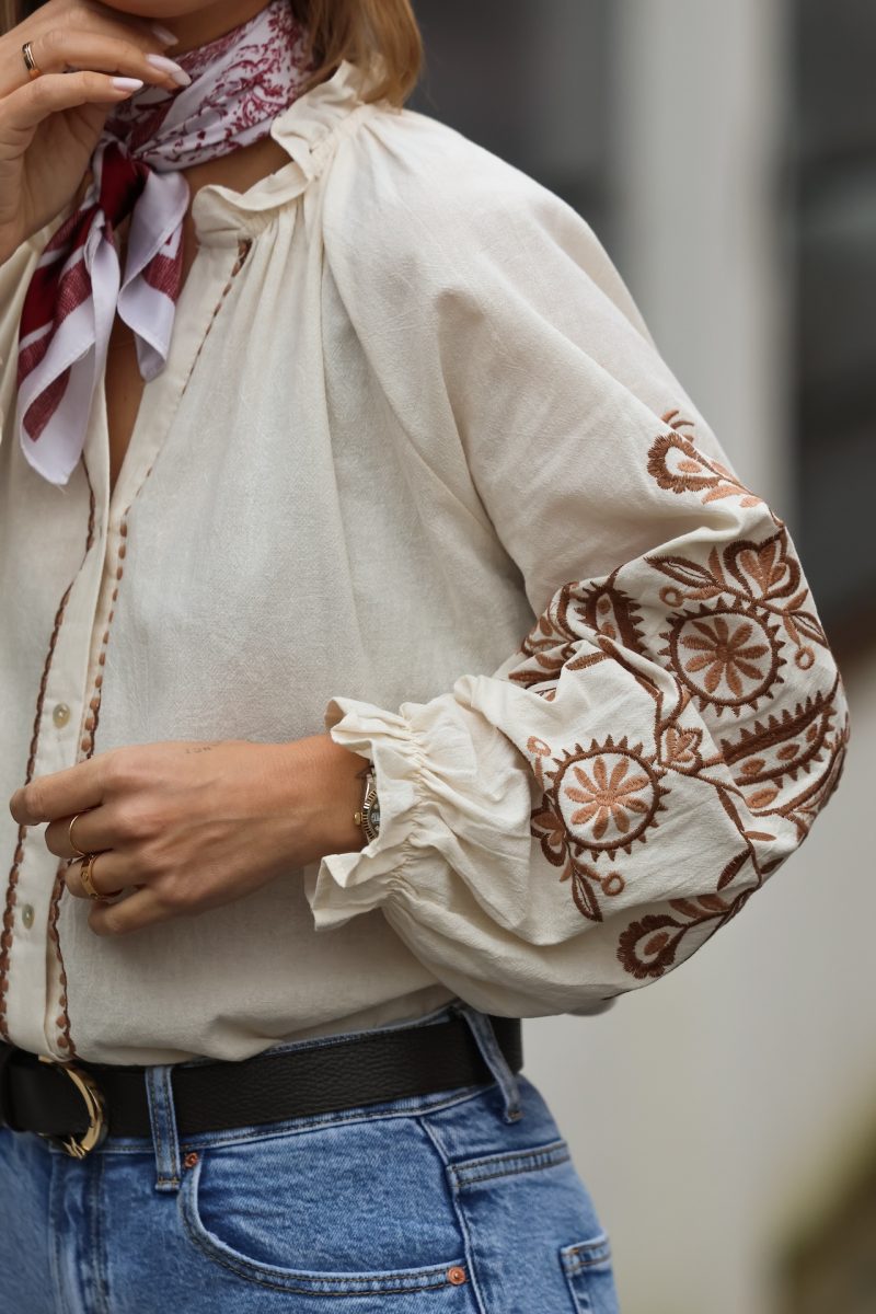 Camisa bordada en tono crudo, una prenda con encanto artesanal que aporta personalidad y elegancia a cualquier look. Confeccionada en un tejido ligero y natural, destaca por sus bordados en contraste en mangas y frontal, que aportan un aire bohemio y sofisticado.