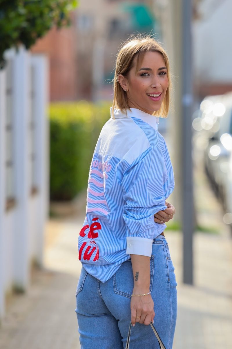 Camisa de rayas azul y blanco con detalles que la hacen única. En la parte delantera incorpora bordado en rojo “Club Lovers”, aportando un toque divertido y diferente.
