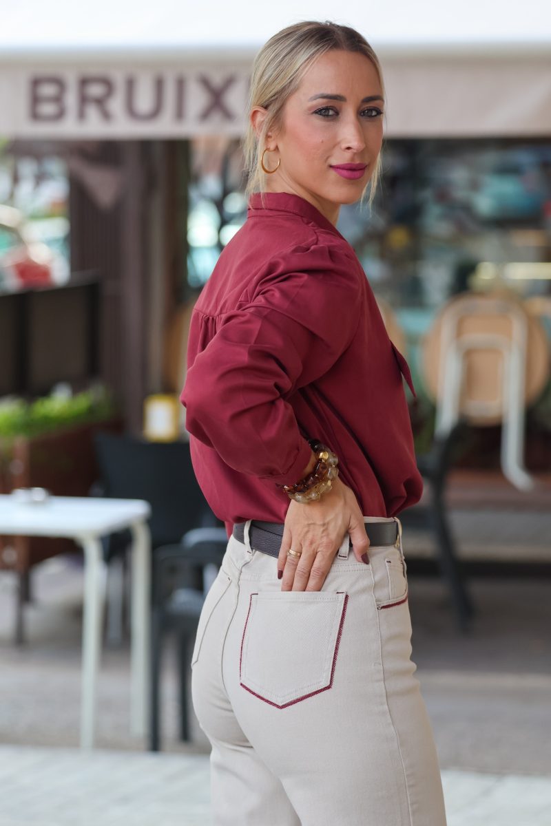 Confeccionada en un tejido suave y fluido, destaca por su cuello anudado que aporta un toque sofisticado y femenino. Su diseño combina a la perfección con vaqueros, faldas o pantalones de vestir, adaptándose tanto a looks de día como de noche.