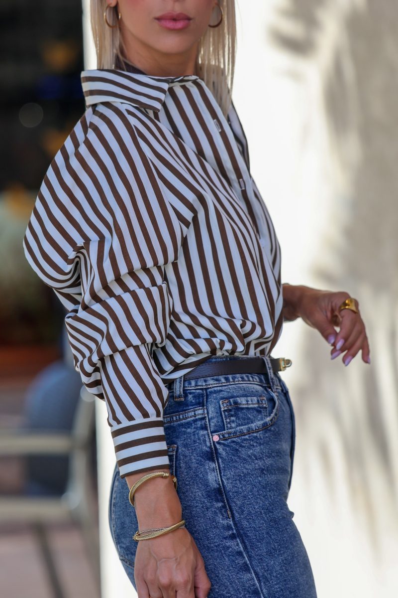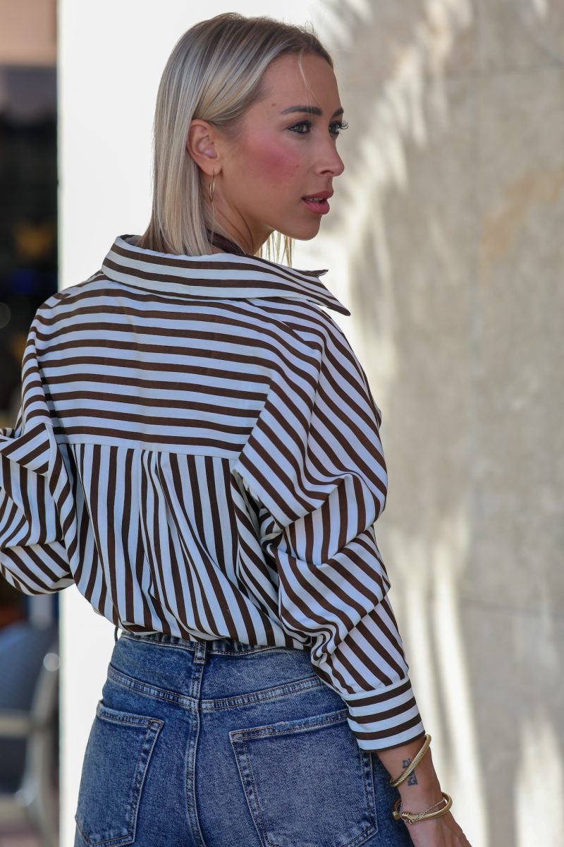 Camisa de manga larga con estampado de rayas verticales en marrón y blanco. Presenta cuello camisero, cierre frontal con botones y puños abotonados. Su corte recto y ligeramente suelto la convierte en una prenda versátil y cómoda, perfecta tanto para looks de oficina como para un estilo casual chic combinada con jeans o pantalones de vestir.