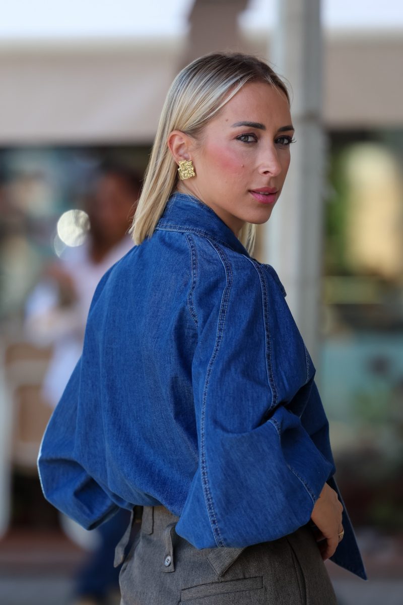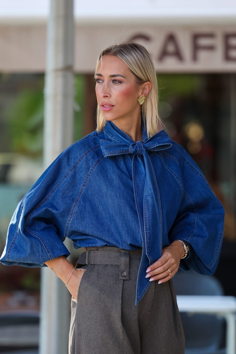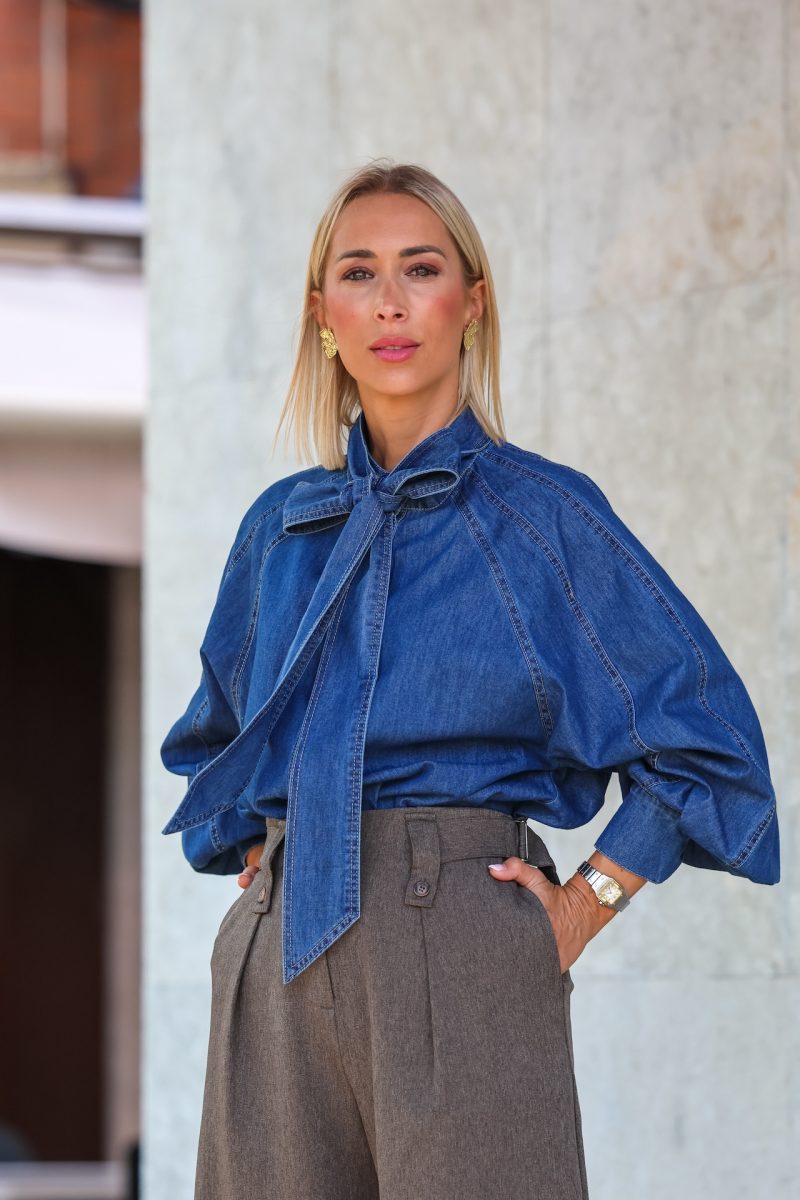 Camisa denim con lazada estilo romántico y versátil. Color azul denim clásico, con cuello con lazada grande desmontable para un look elegante y original. Manga larga con puño de botones. Corte recto y fluido que se adapta a cualquier figura. Cierre frontal con botones marrón. Modelo lleva talla s.