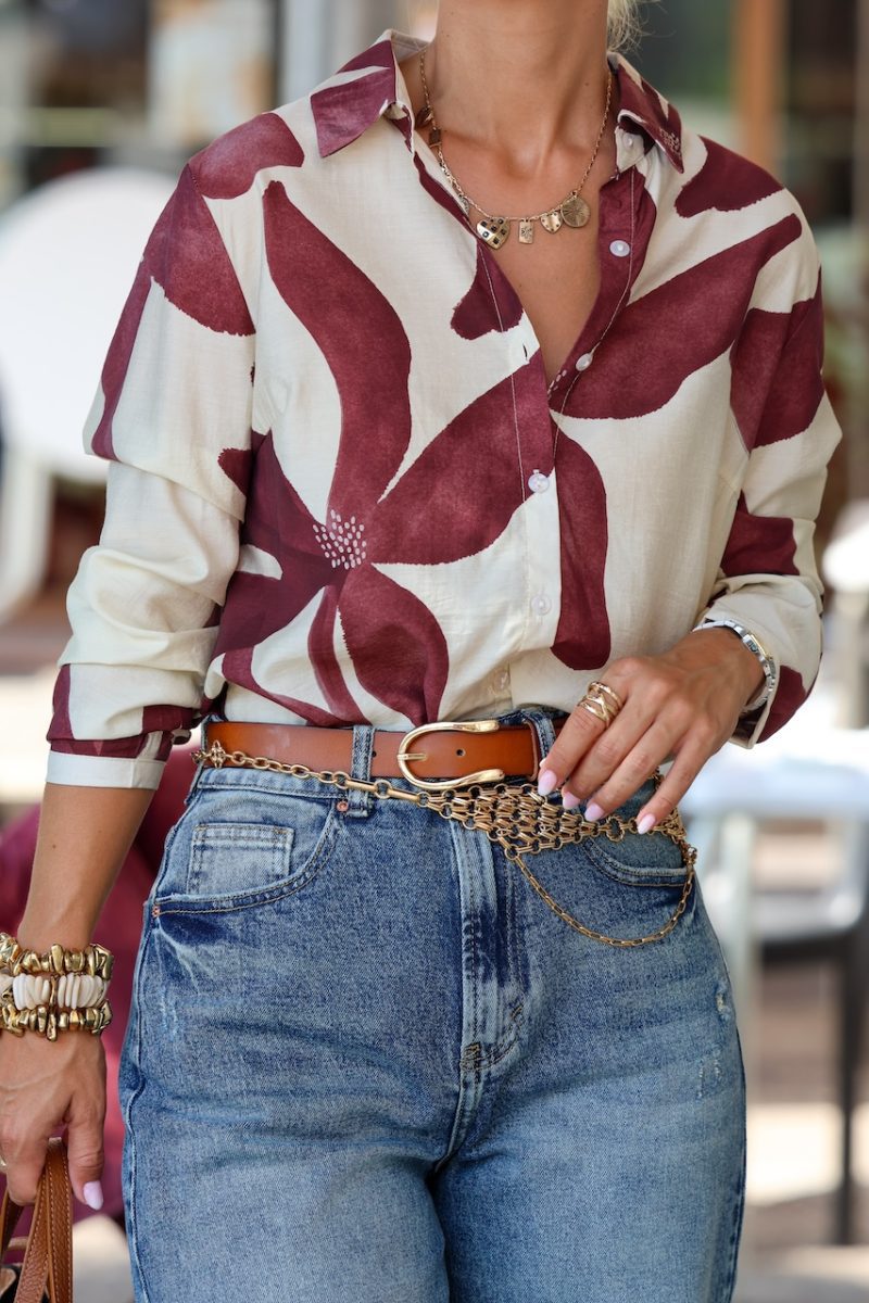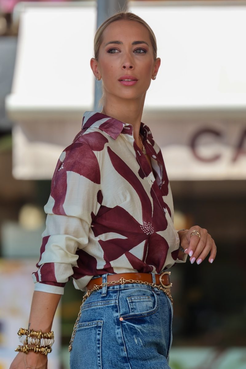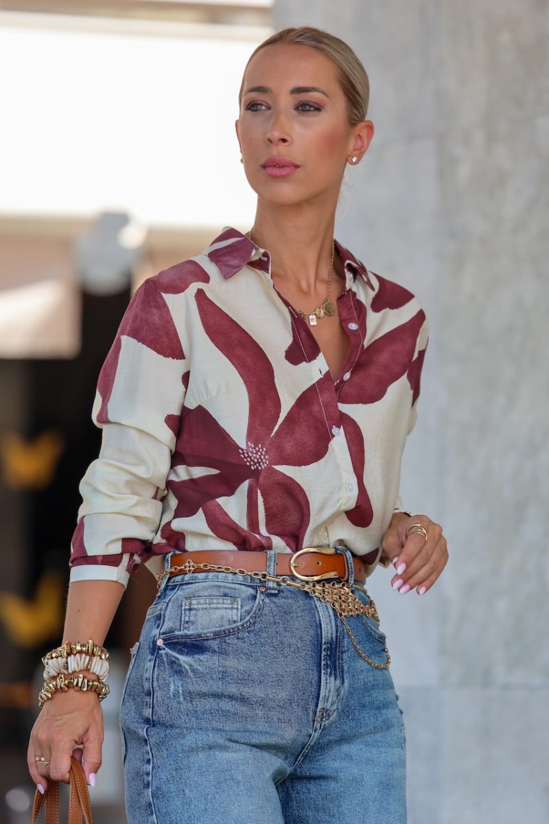 Camisa de manga larga con estampado floral abstracto en tonos burdeos y beige. Su diseño único combina frescura y elegancia, perfecta para darle un aire artístico a tus looks. Color de base beige claro, corte recto con cuello clásico camisero. Cierre con botones frontales. La talla de la modelo es la S.