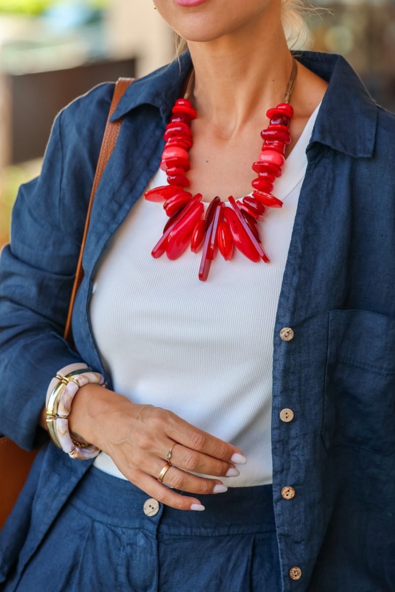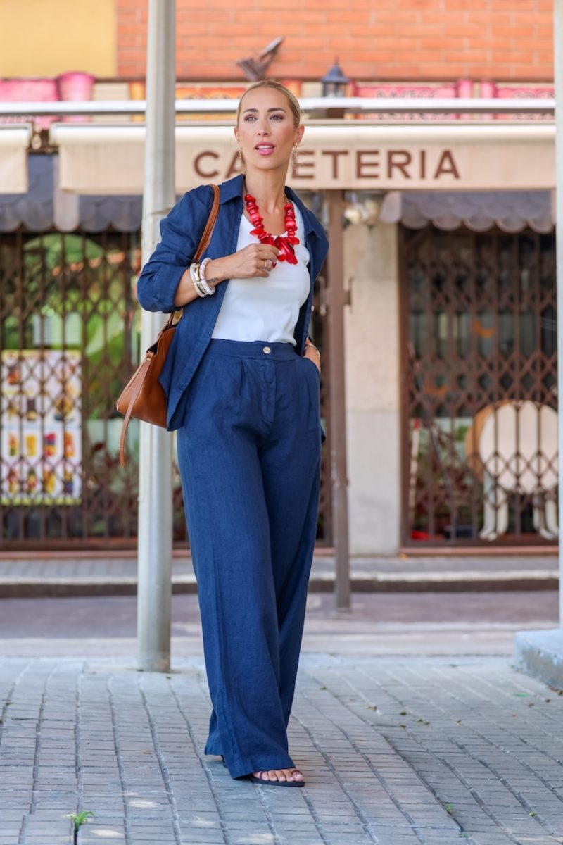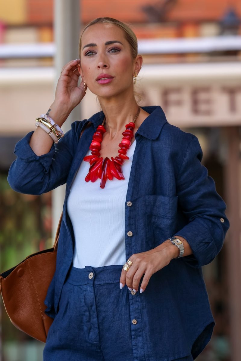 Camisa de lino en color azul marino. Corte holgado, estilo oversize. Mangas largas, con posibilidad de doblarlas hacia arriba con botón. Parte delantera con botones y cuello tradicional. Bolsillo en el lado izquierdo. Tallaje S M L. La modelo lleva talla S.