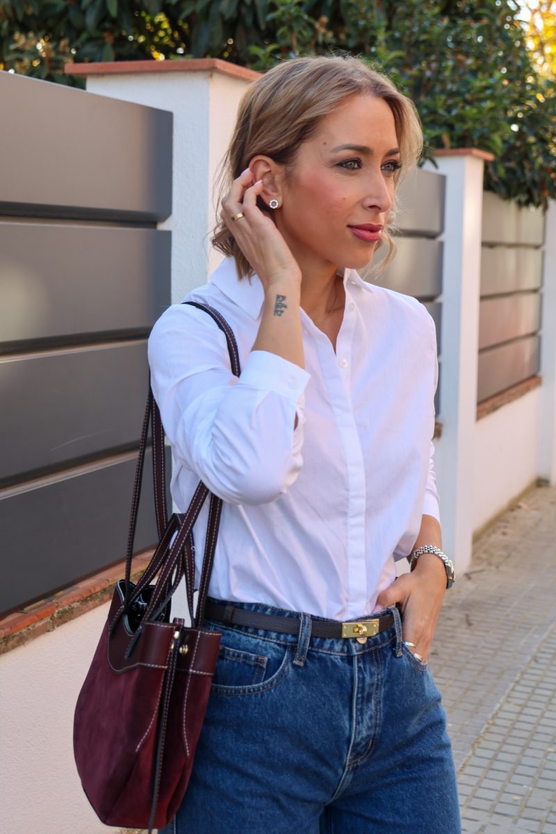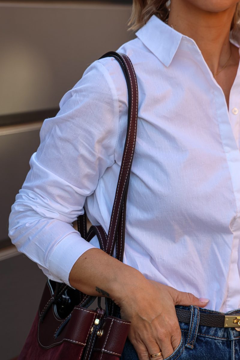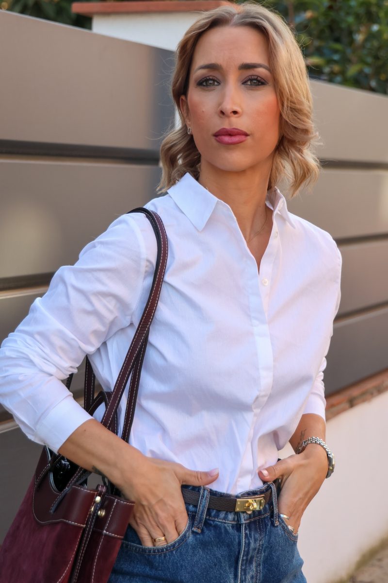 Camisa blanca de tejido plumeti, ligera y con un acabado delicado. Diseño clásico con cuello camisero y botonadura frontal, perfecta para combinar con jeans, faldas o sastrería.