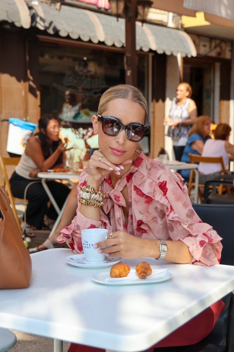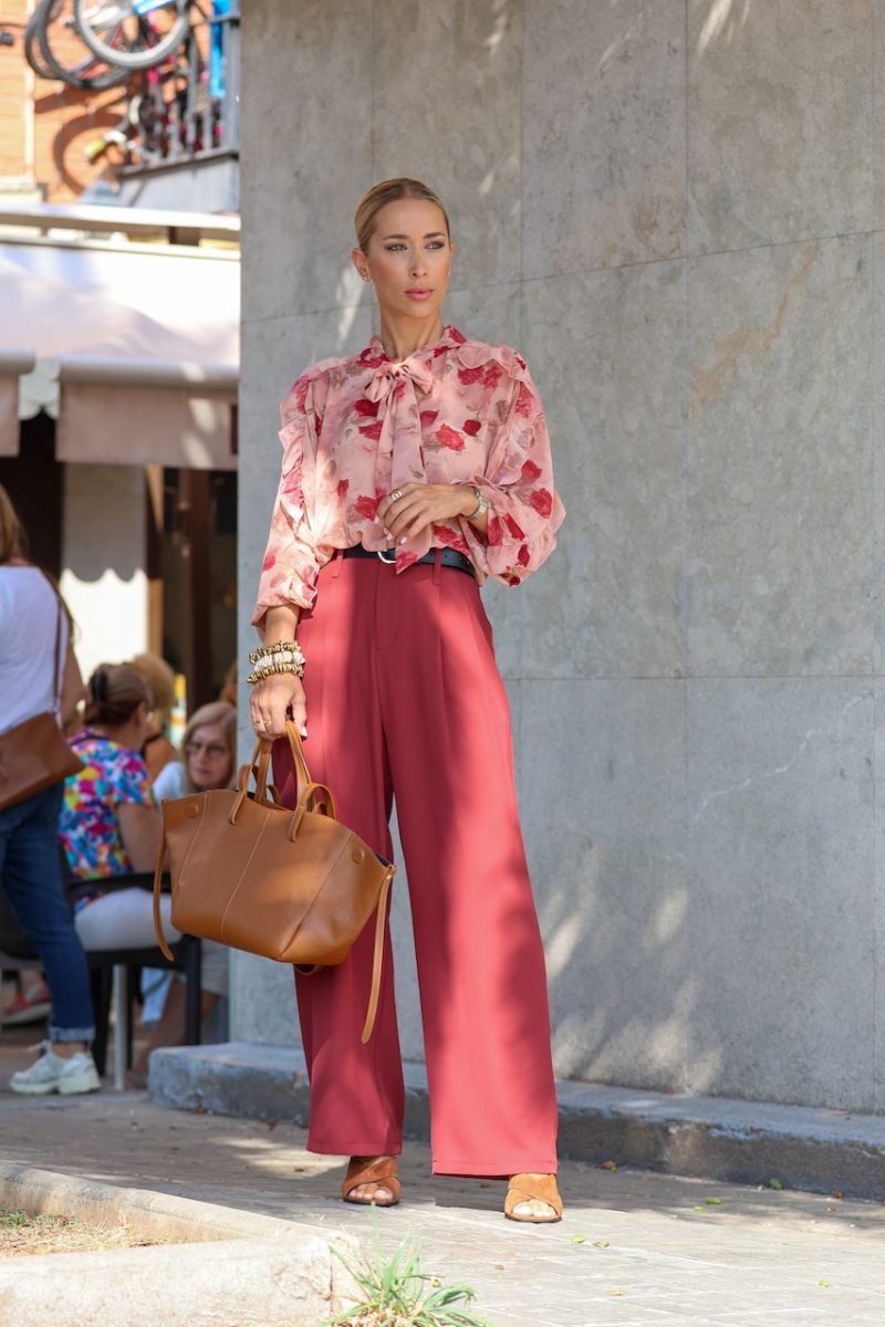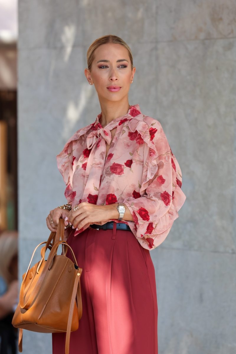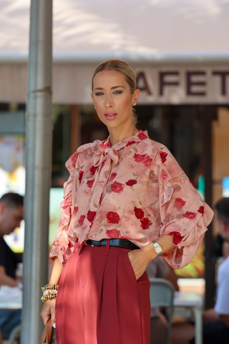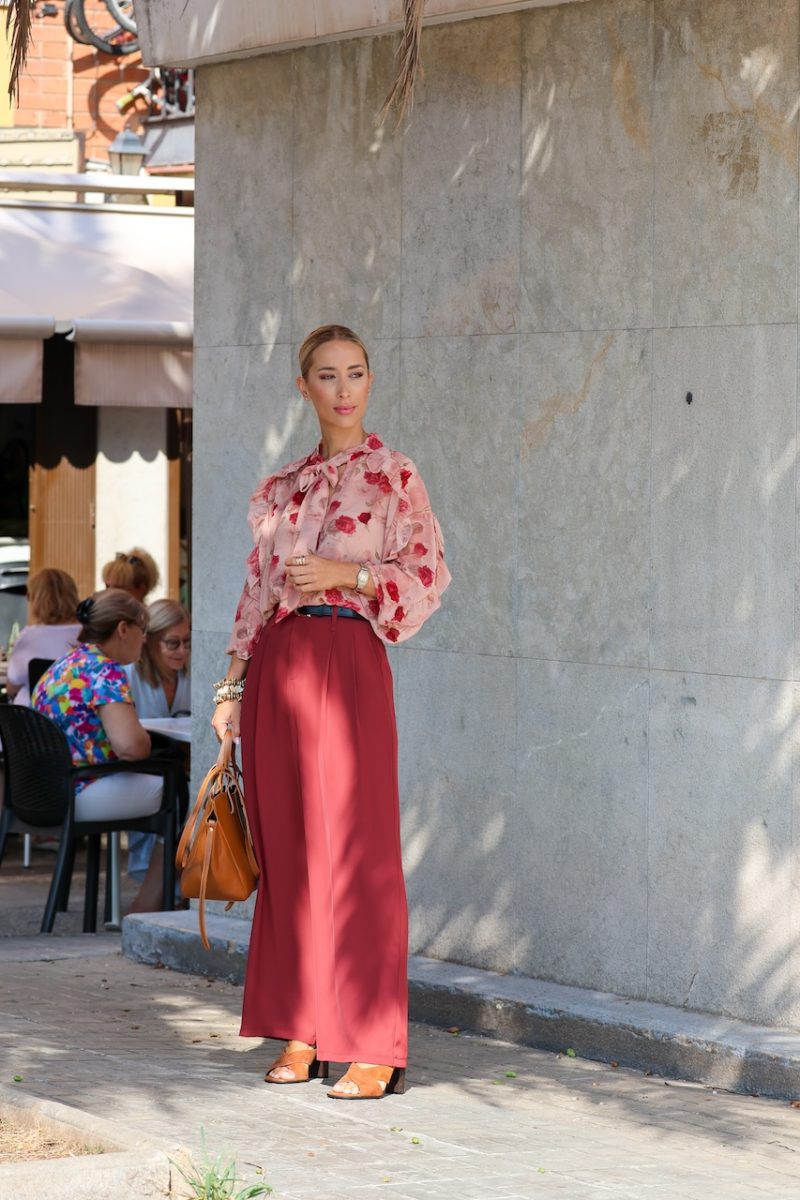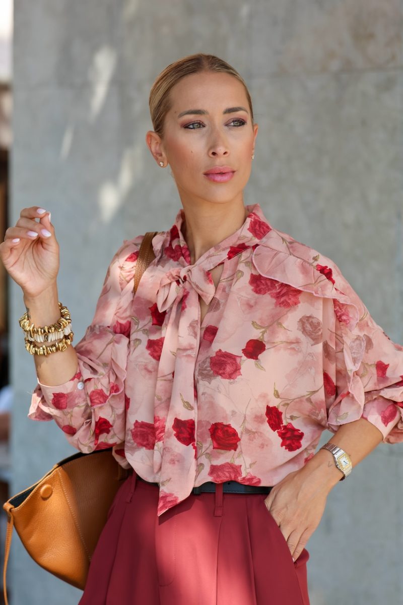 Camisa elegante en color nude y estampado de flores grandes en tonos rojos y rosados, con detalles en marrón claro. El cuello está cerrado con un lazo en la parte frontal. Las mangas largas, ligeramente sueltas y con puños ajustados en la muñeca. Tea muy ligera, fluida y satinada. Talla completa, la modelo lleva la talla SM.