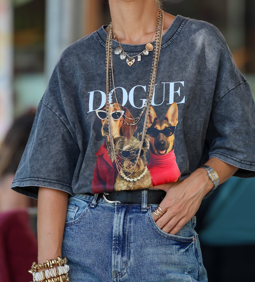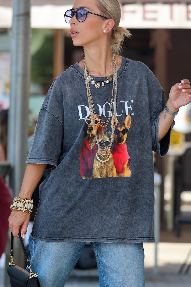 Camiseta casual urban, Color gris oscuro con efecto desgastado, tipo vintage. Diseño frontal estampado de tres perros con accesorios y ropa llamativa, en estilo divertido y moderno. Corte overisize, suelta y de manga corta amplia. Cuello redondo clásico. Estilo streetwear, con un aire relajado y juvenil. Tallaje único, hasta talla xxl.