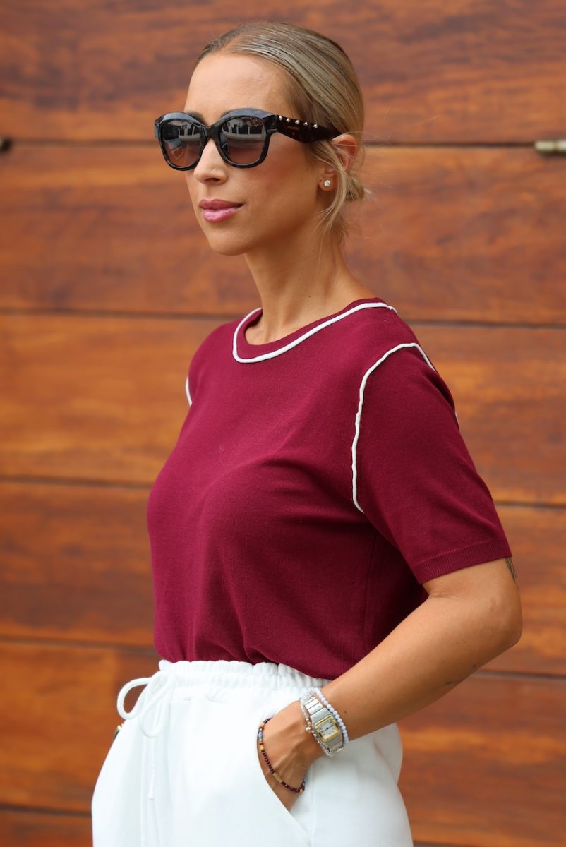 Camiseta básica imprescindibile con un toque sofisticado que eleva cualquier look. Tres colores disponibles: blanco con ribete negro en cuello hombros, marrón y burdeos con ribete blanco. Corte recto, manga corta y cuello redondo. Tejido ligero y cómodo. Talla doble, la modelo lleva la talla SM.
