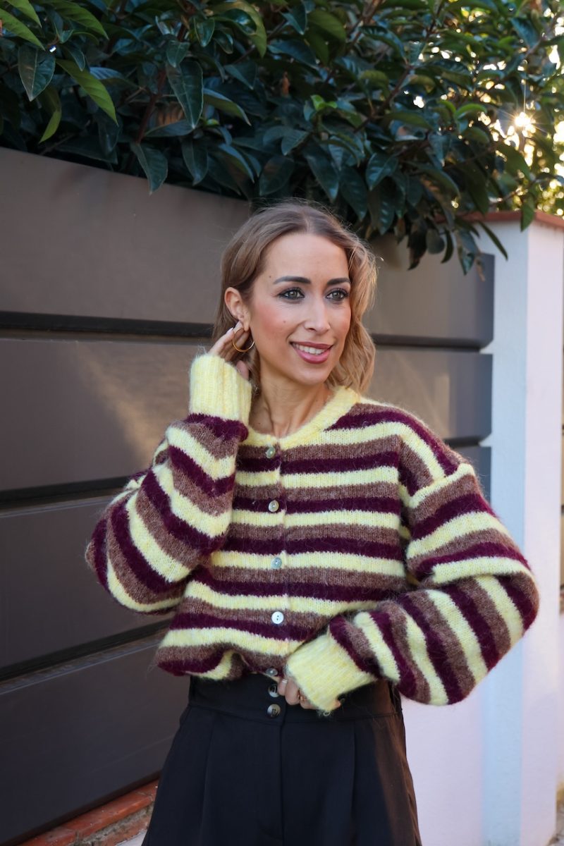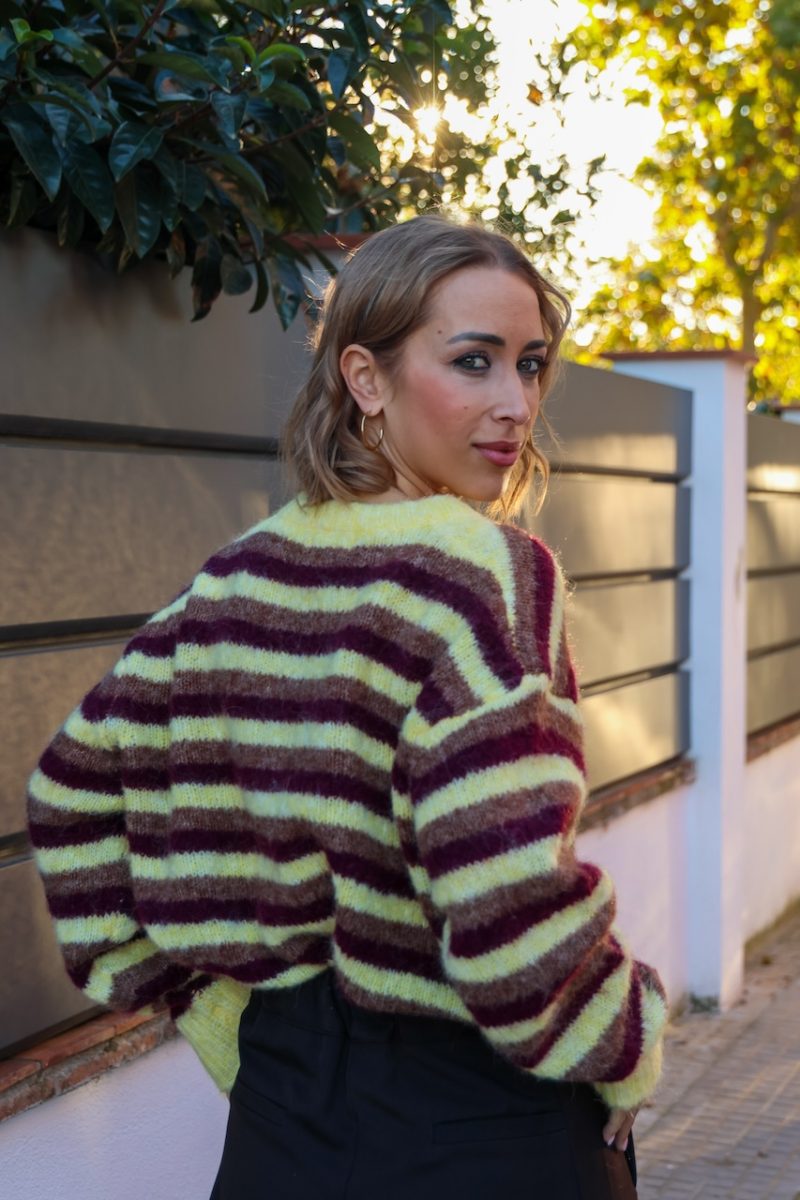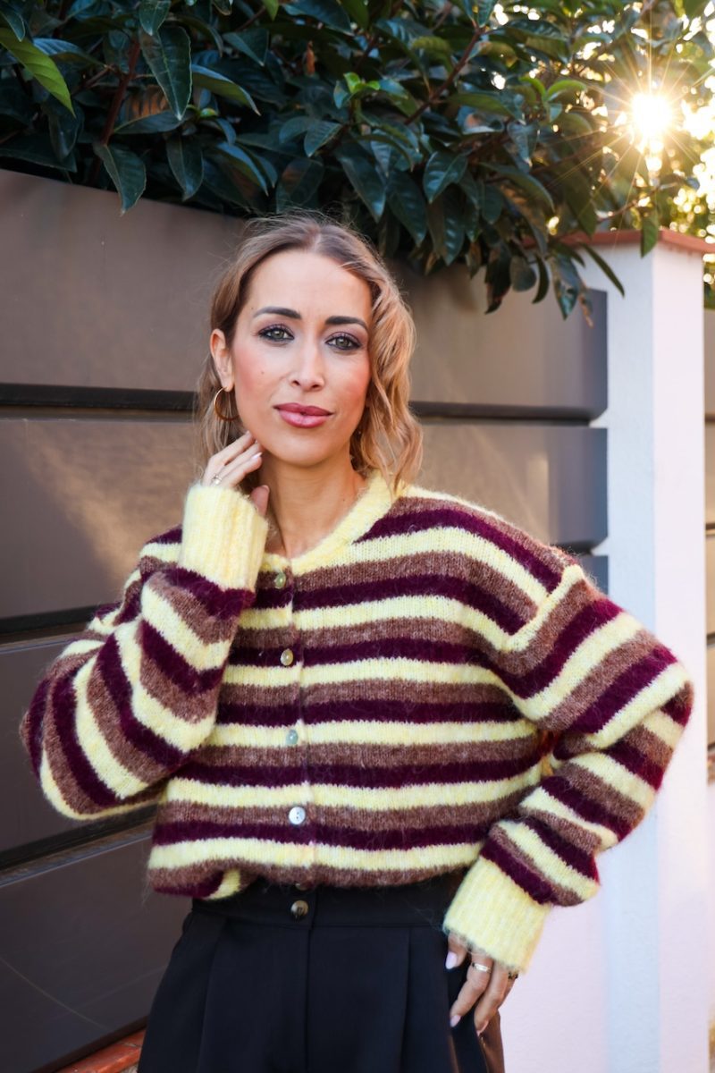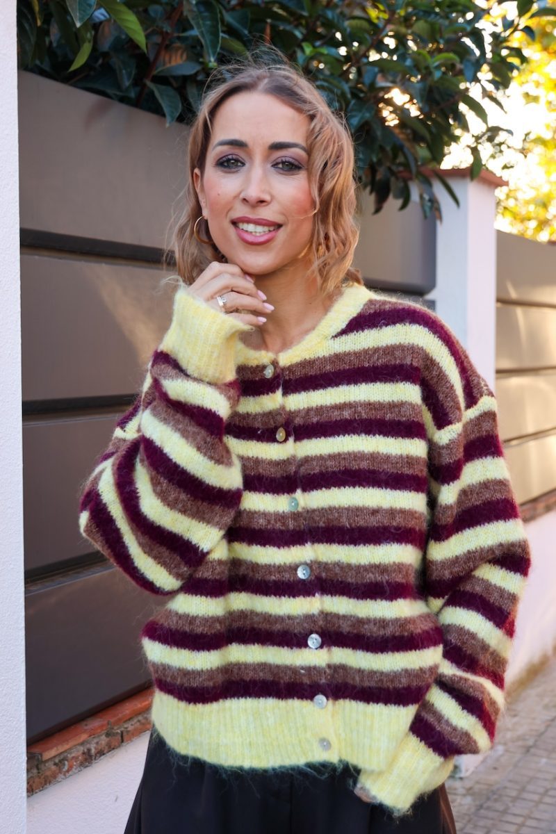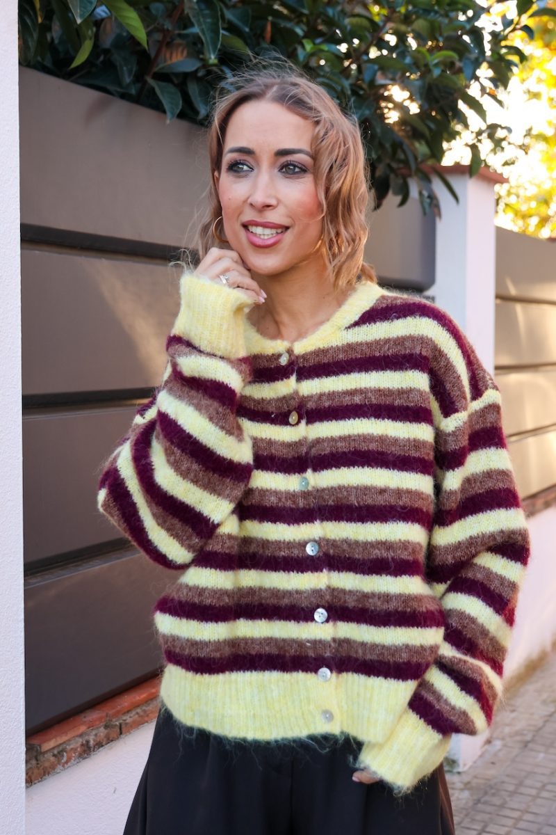 Su diseño a rayas en tonos amarillos y burdeos aporta un toque alegre y diferente a cualquier look. Perfecto para combinar con jeans, pantalón de vestir o faldas esta temporada.