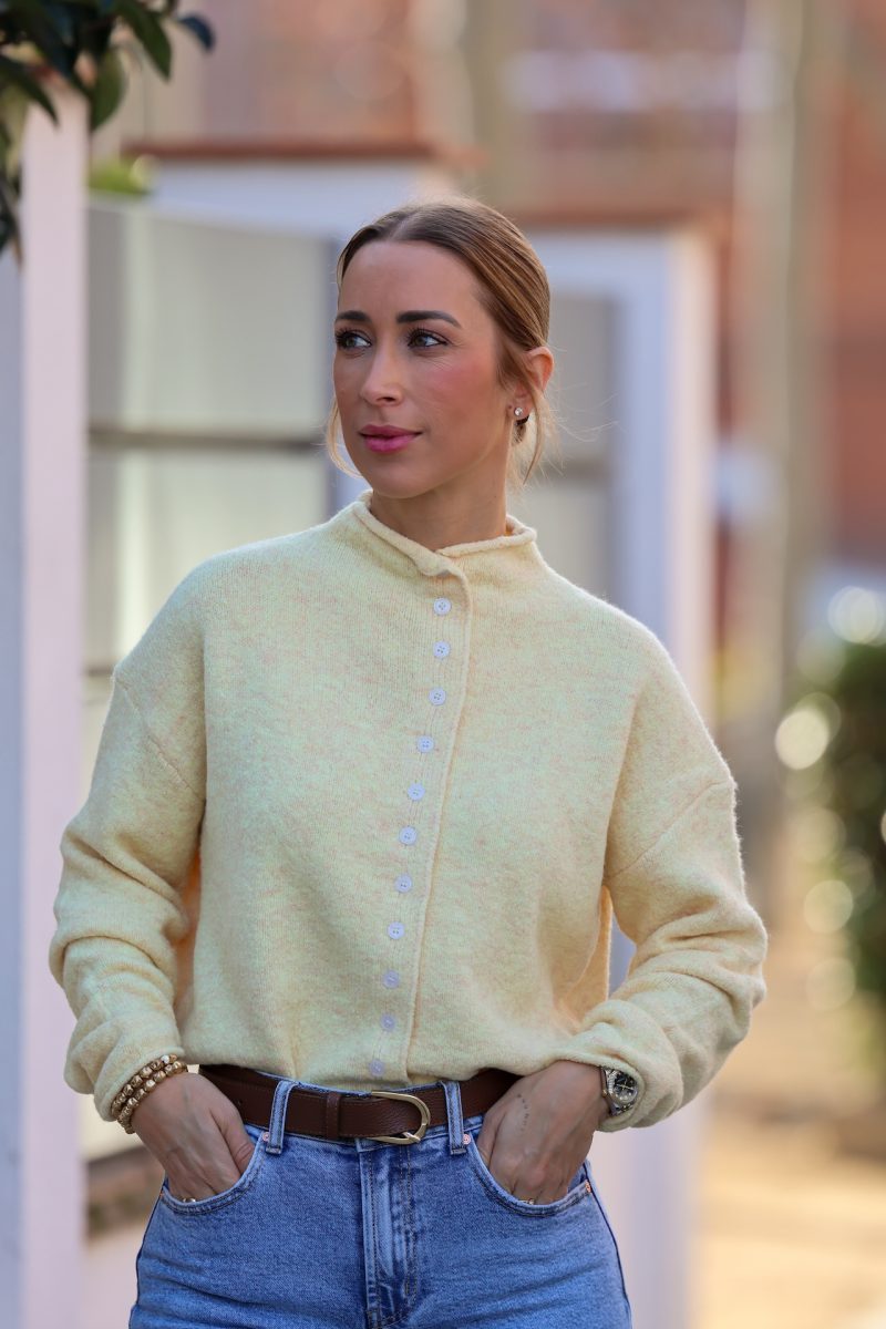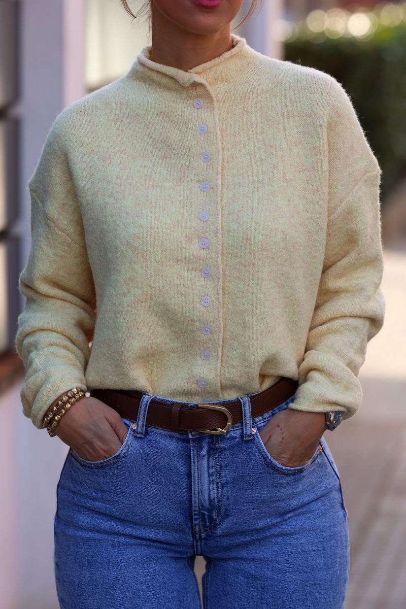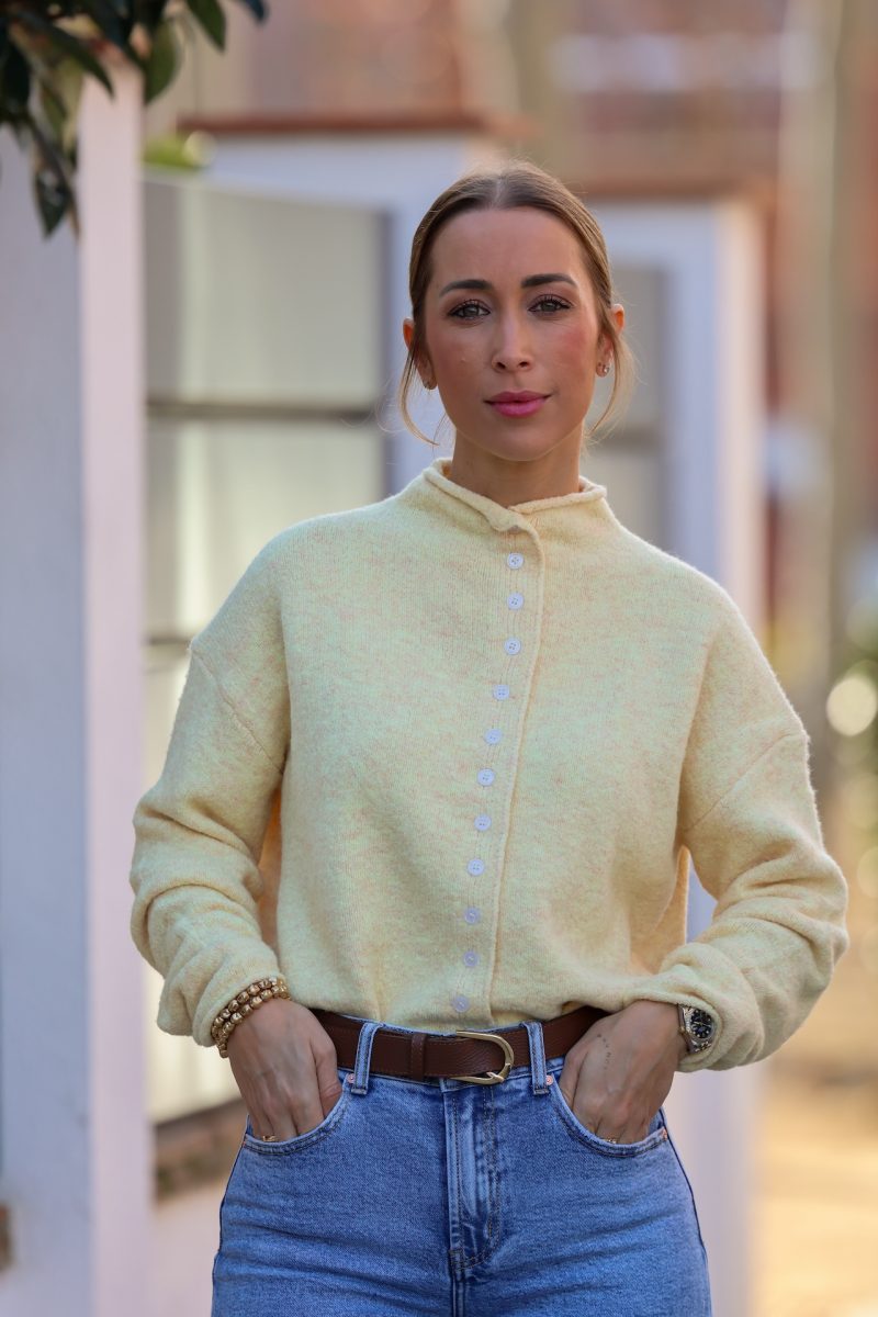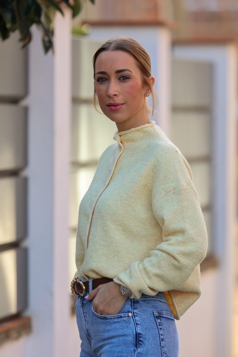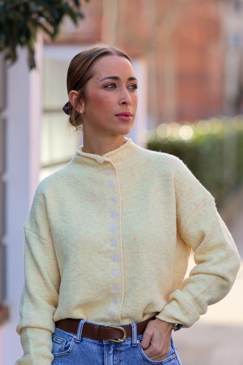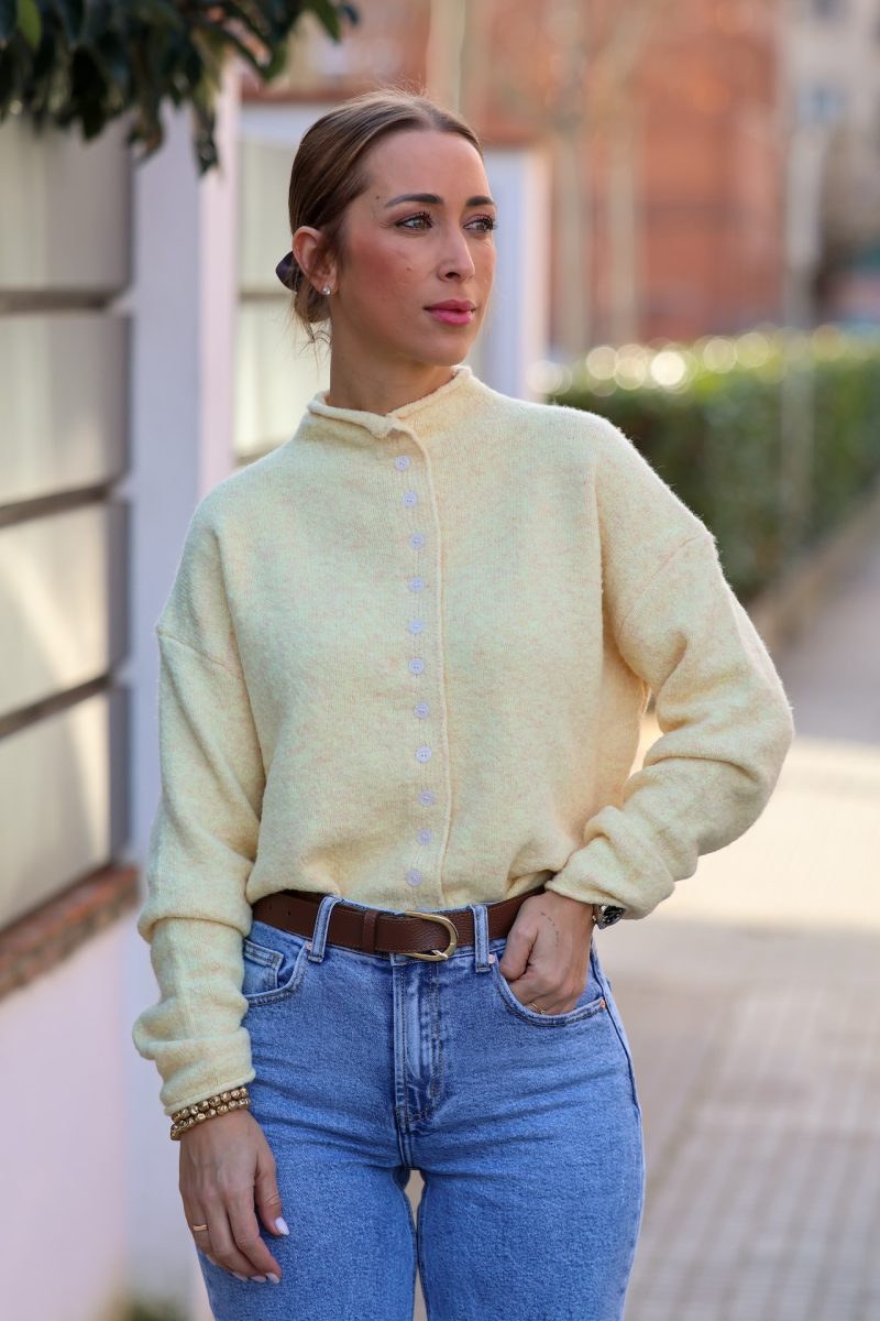 Cardigan en tono amarillo pastel, suave y luminoso, perfecto para aportar un toque fresco y elegante a tus looks de diario. Confeccionado en un tejido agradable y calentito, destaca por su diseño cómodo y su corte relajado, ideal para llevar tanto cerrado como abierto.