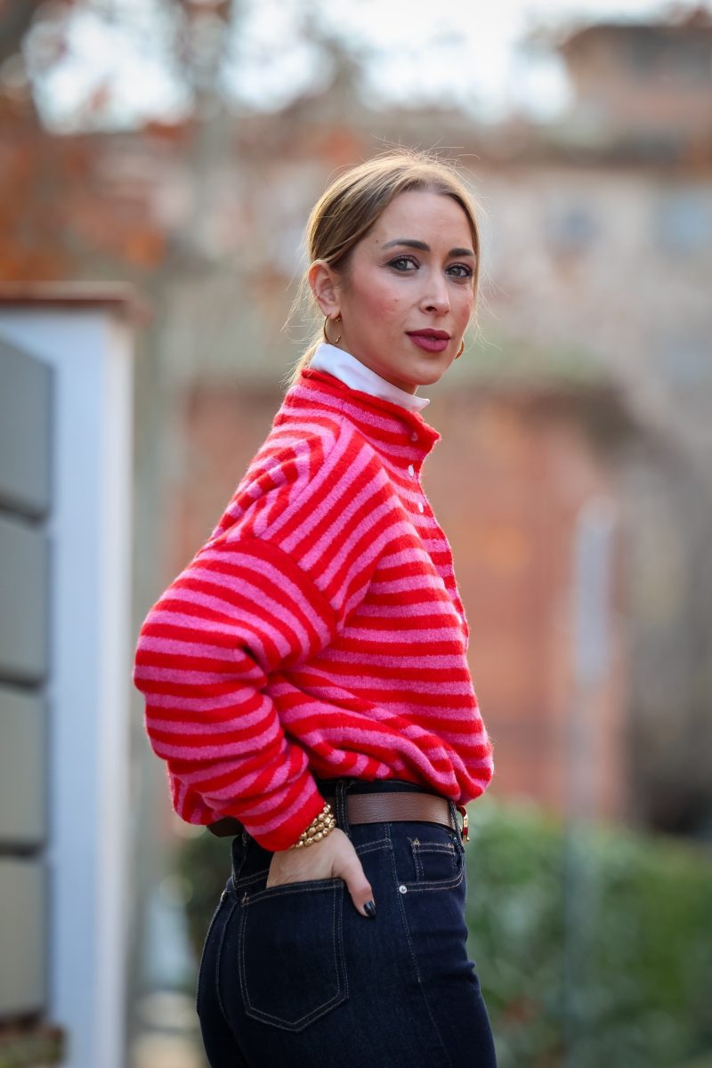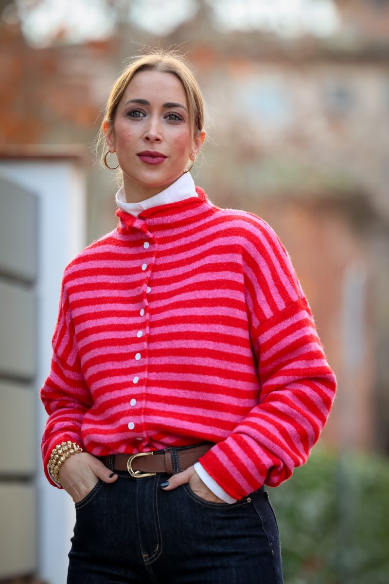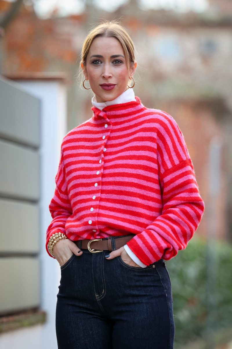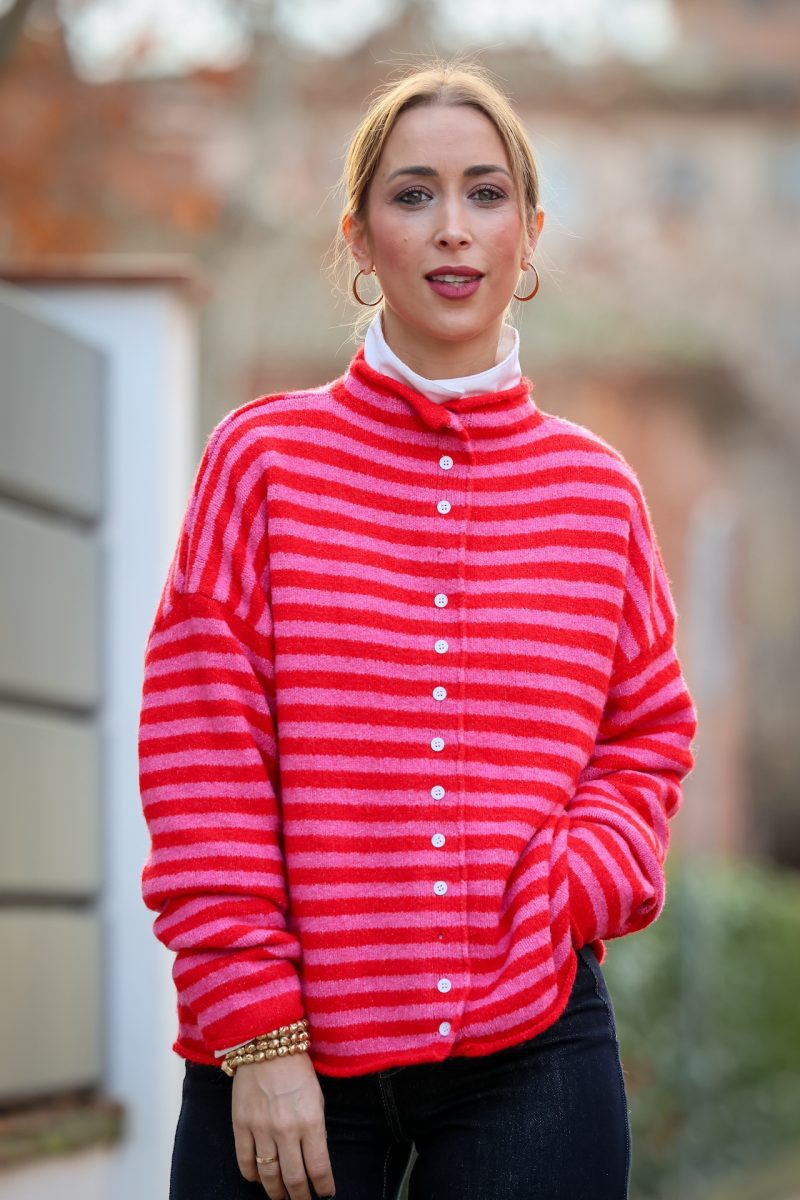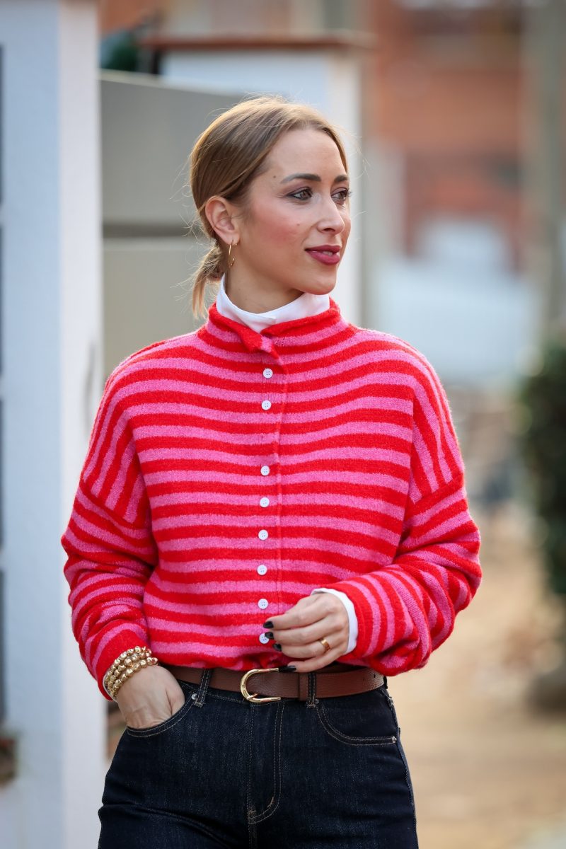 Cárdigan de punto con diseño a rayas en tonos fucsia y rojo, una combinación vibrante que aporta carácter y frescura al look.