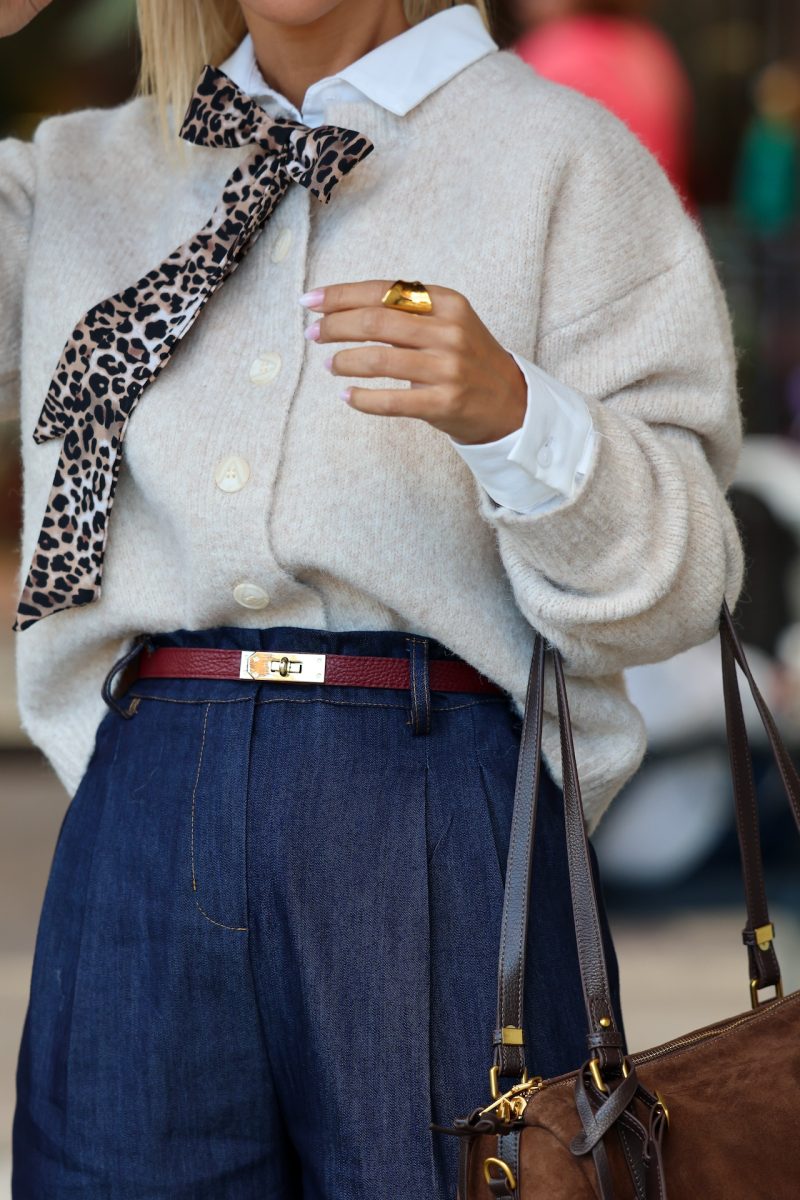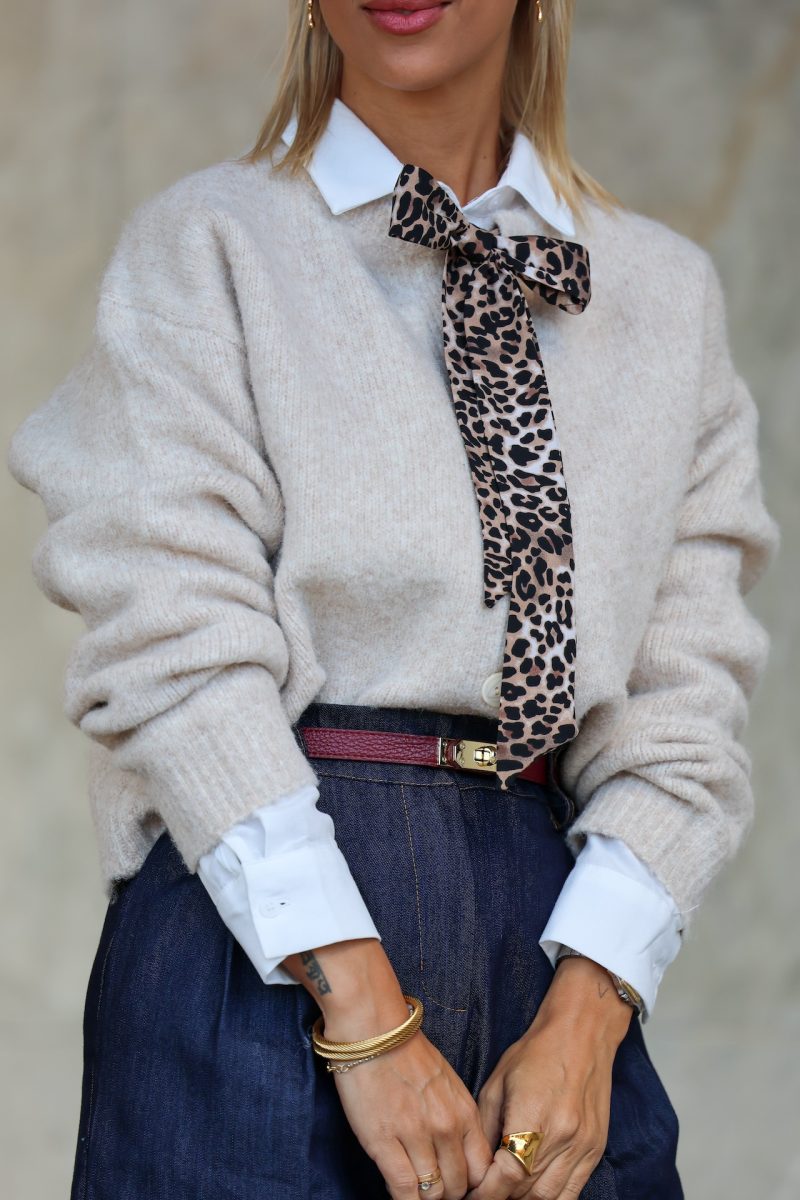 Cárdigan de color beige clásico con detalle de lazo y de tacto suave y abrigado, con botones frontales al tono y corte recto. El diseño se realza con un lazo estampado animal print en el cuello, que aporta un toque de estilo único y sofisticado. Sus mangas largas de cafa relajada y puños ajustados lo convierten en un aprenda comodatos, versátil y facultad de combinar con jeans, faldas o pantalones de vestir