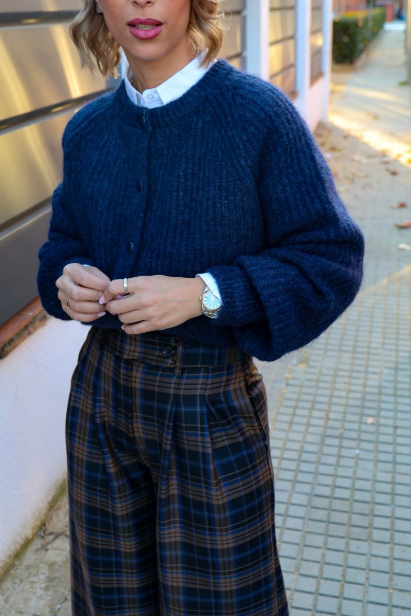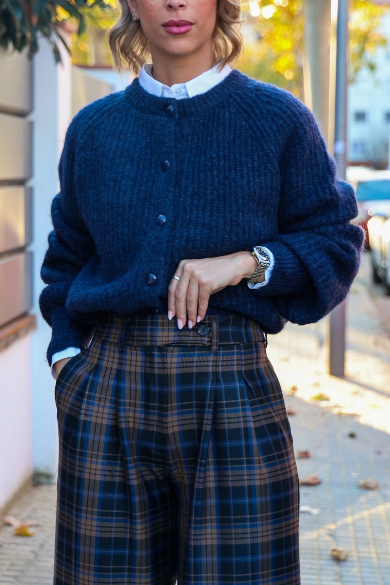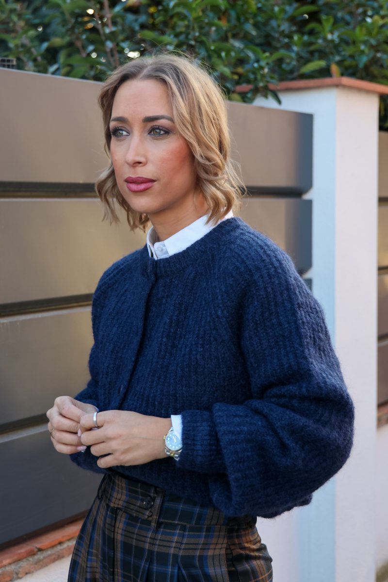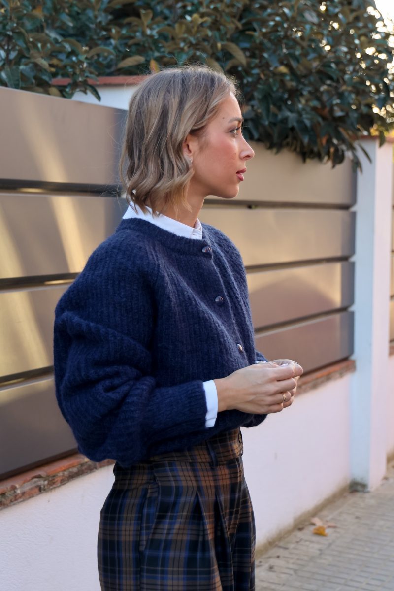 Cárdigan de punto suave en color azul marino, con acabado esponjoso y botones al tono. Diseño cómodo, ligeramente oversize y muy favorecedor. Ideal para combinar con camisa o camiseta y elevar cualquier look de diario.