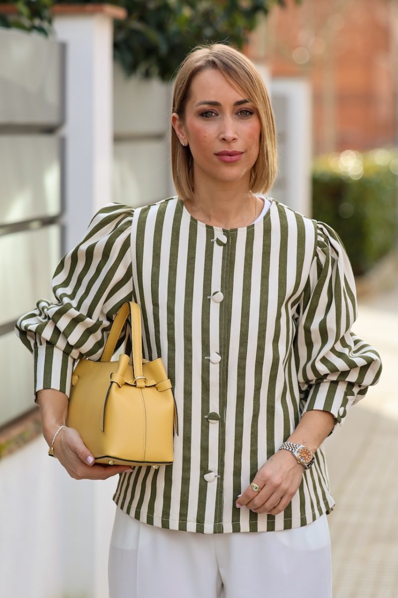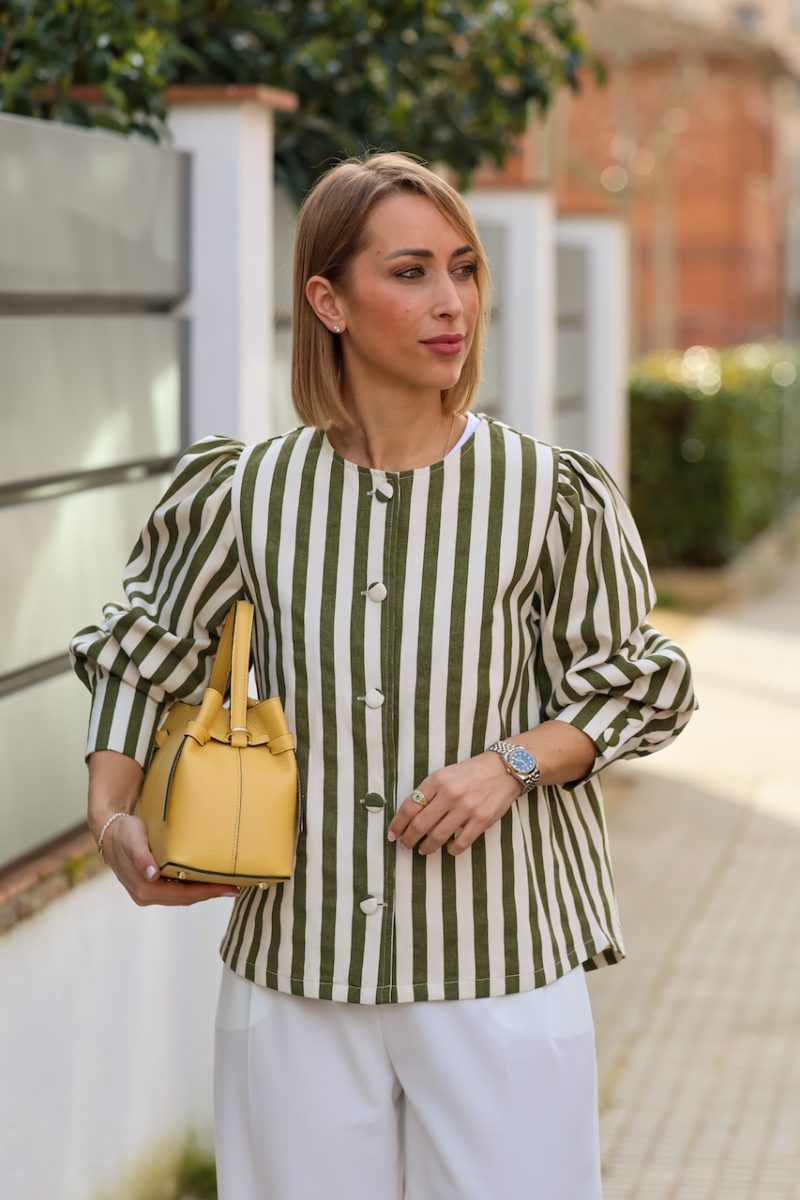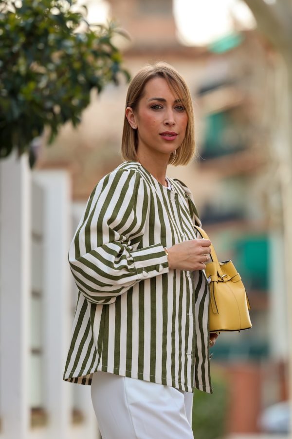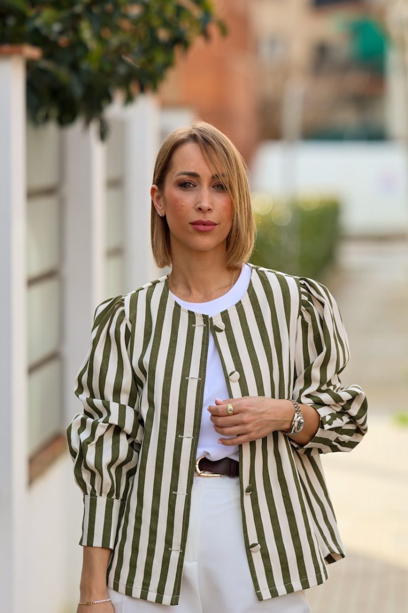 Cazadora de rayas en tonos verde y crudo, con diseño ligero y corte recto. Presenta cierre frontal con botones y mangas ligeramente abullonadas que aportan volumen y un aire femenino a la prenda.