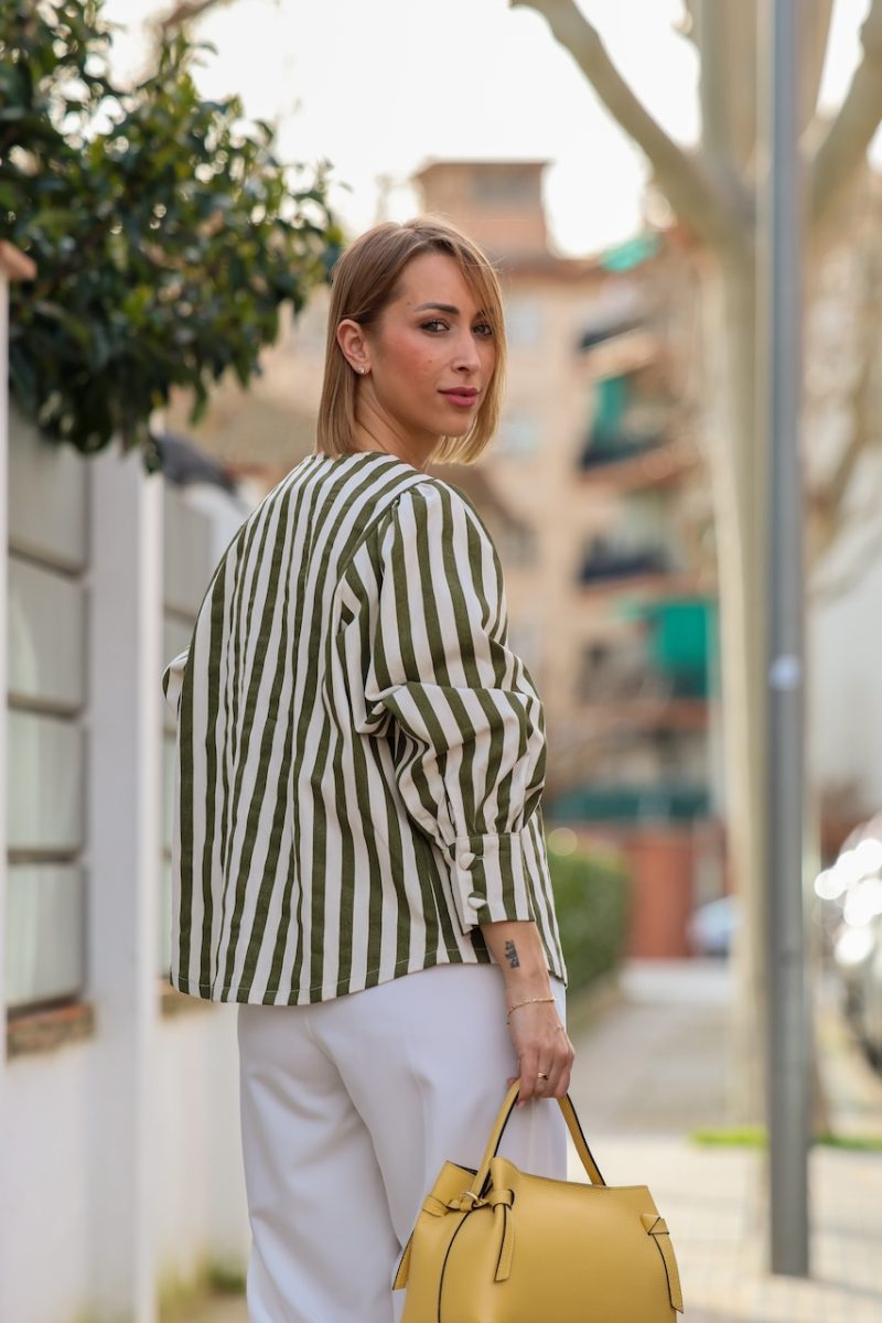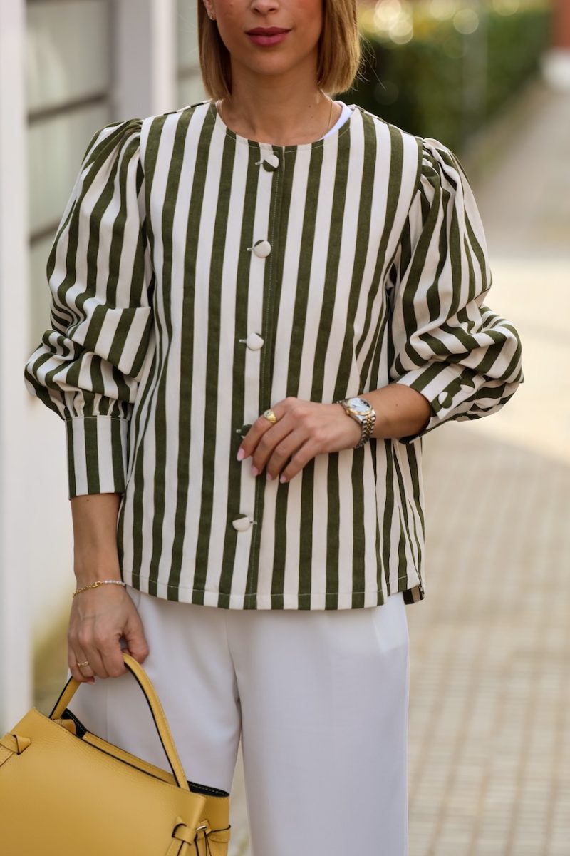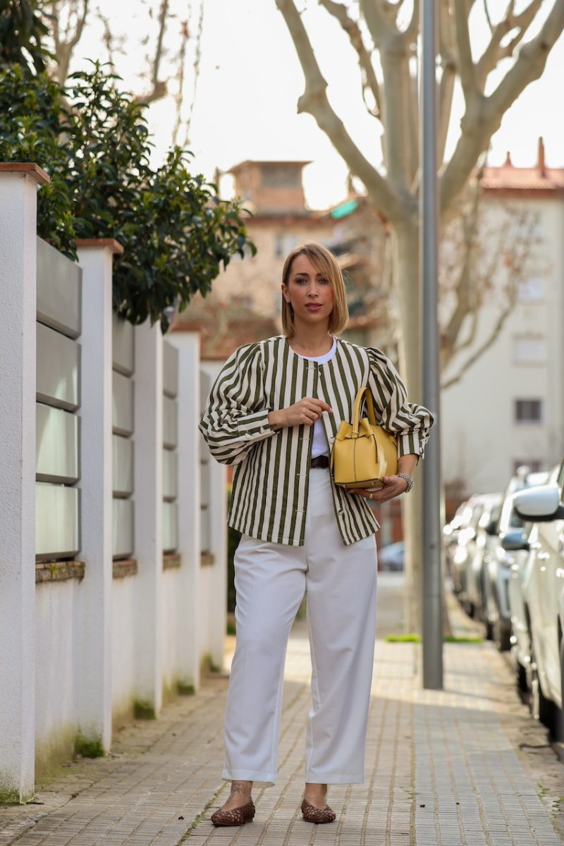 Cazadora de rayas en tonos verde y crudo, con diseño ligero y corte recto. Presenta cierre frontal con botones y mangas ligeramente abullonadas que aportan volumen y un aire femenino a la prenda.