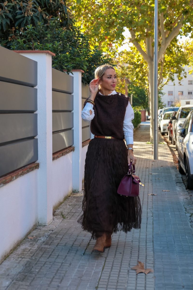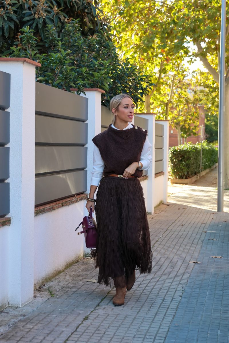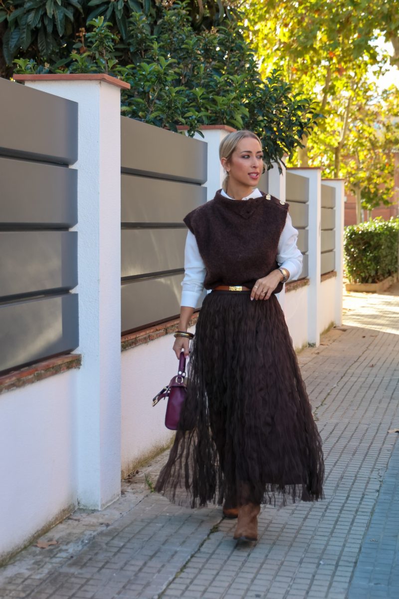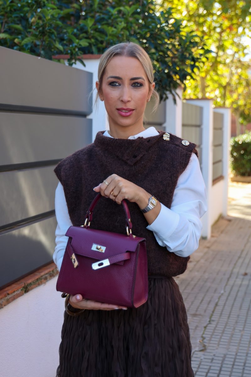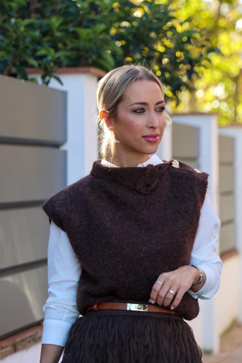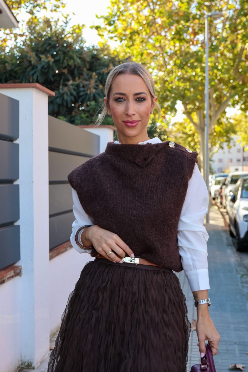 Chaleco de punto en color marrón con botones decorativos en color dorados en la izquierda del hombro.