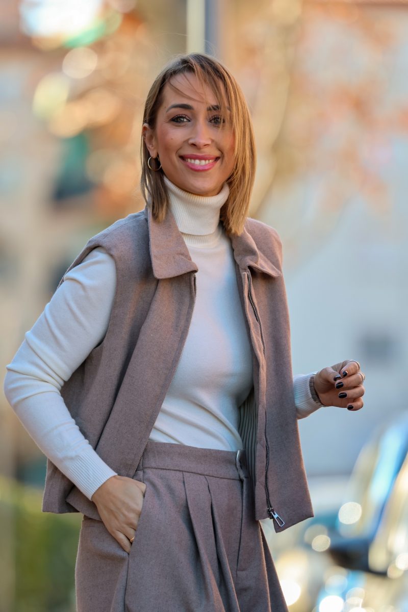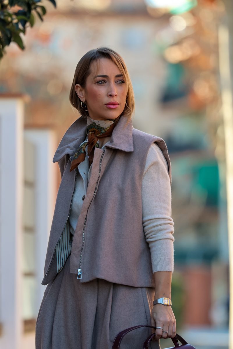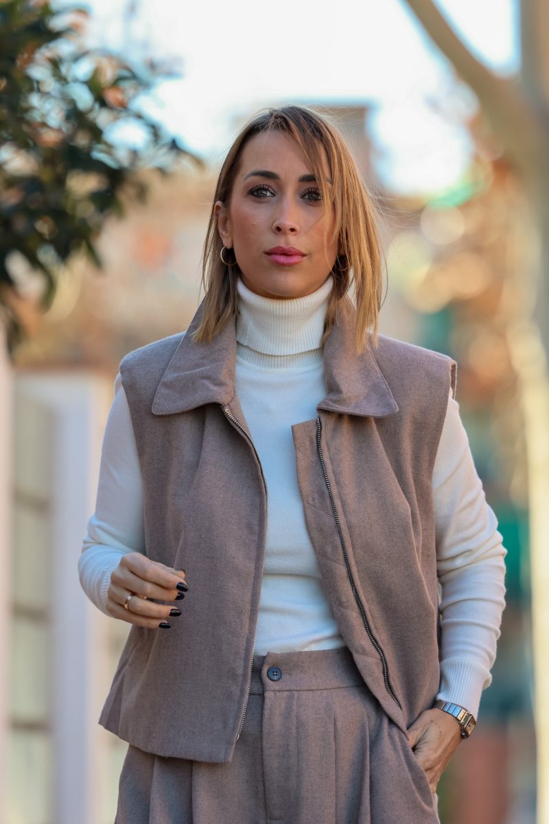 Chaleco de estilo sastre en tono gris, una prenda clave para elevar cualquier look de temporada. Con diseño estructurado y corte recto, aporta elegancia y versatilidad tanto en looks casuales como en estilismos más sofisticados.