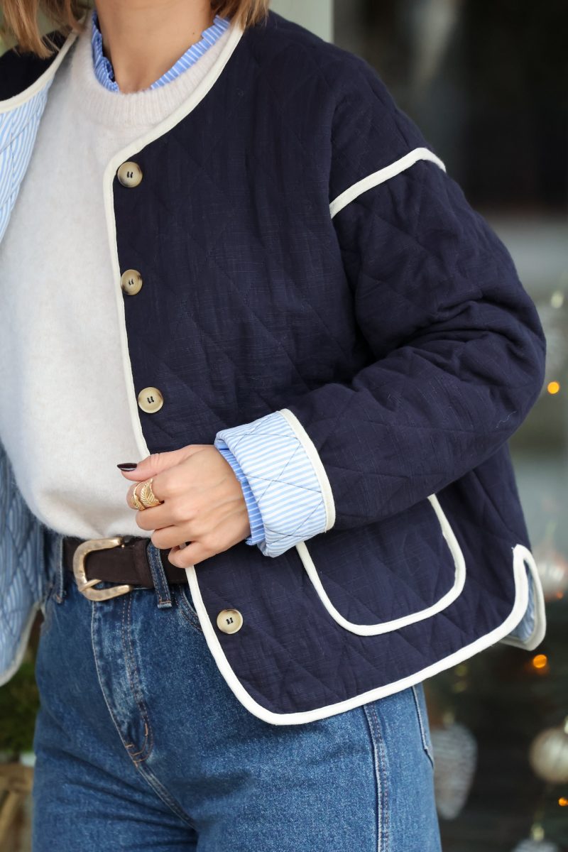 Chaqueta acolchada azul marino con botones y ribete en contraste. Cómoda, ligera y versátil, ideal para looks de entretiempo y otoño-invierno.