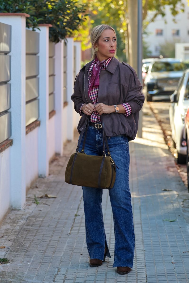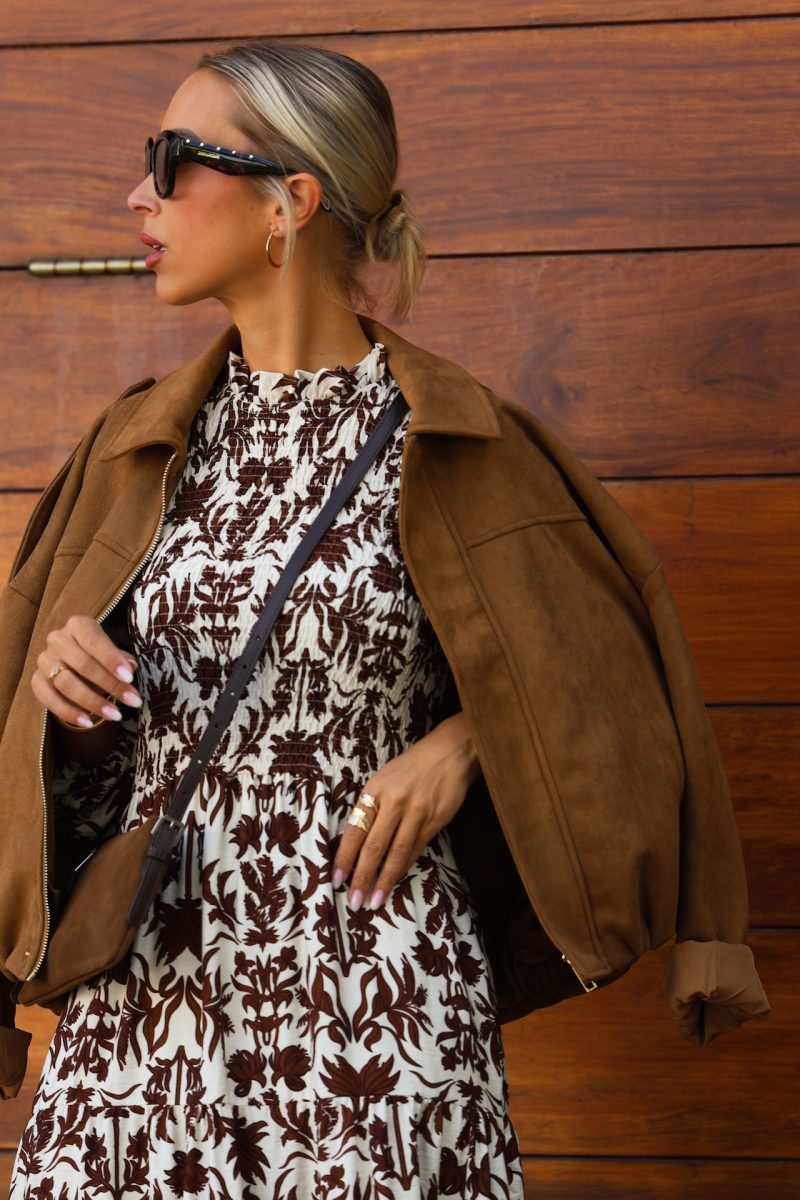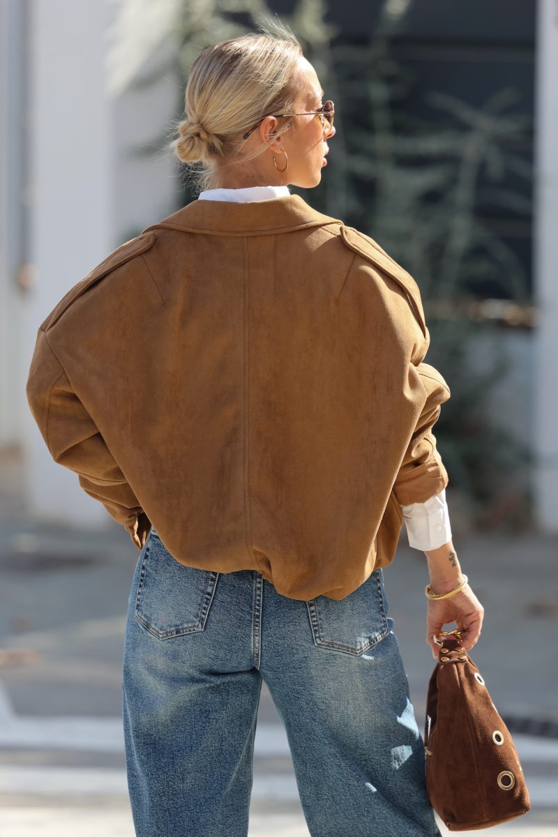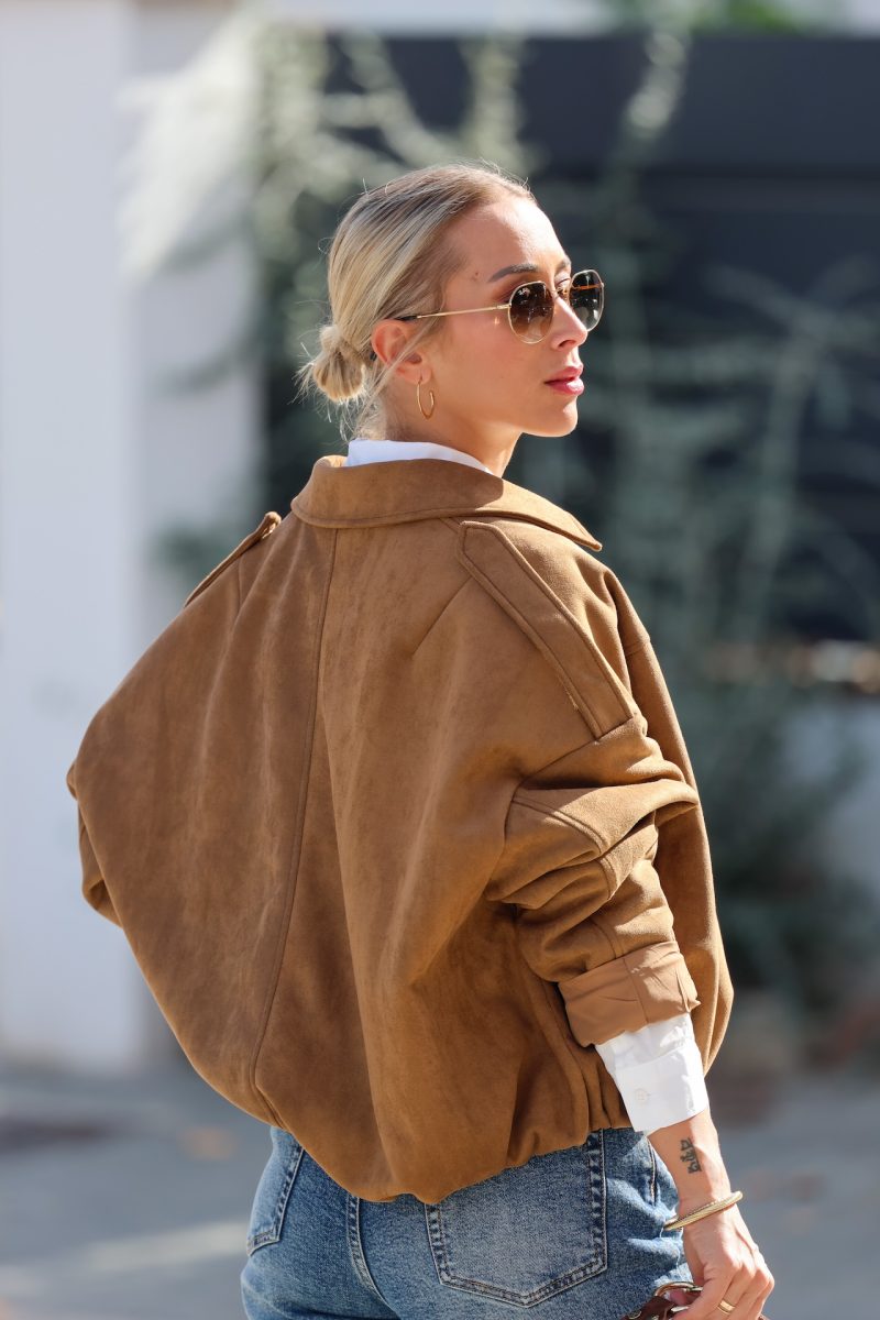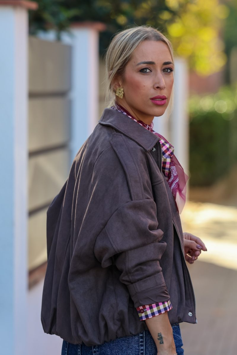 Chaqueta bomber efecto ante, corte bombeo overize, con hombros caídos para un aire relajado. Cremallera frontal. Cuello camisero clásico y mangas largas con acabado recto. Tallaje muy completo, hasta talla XL.