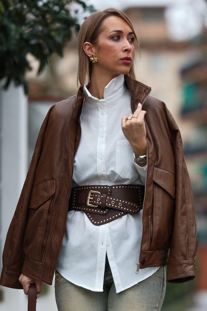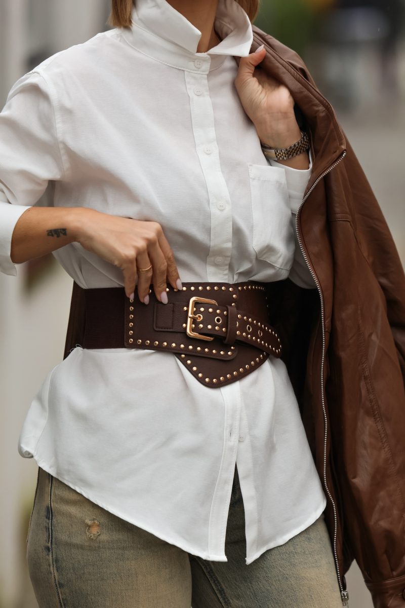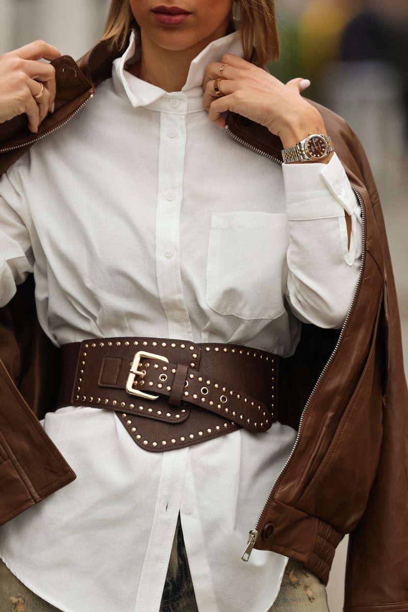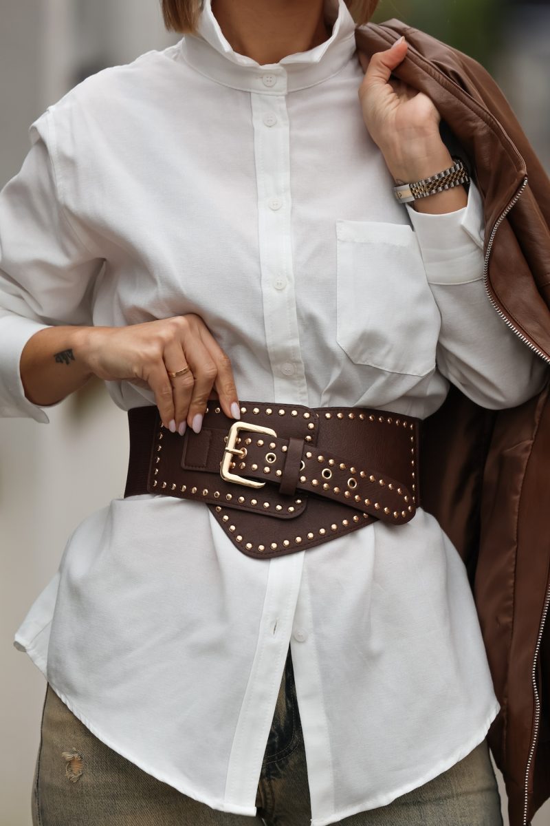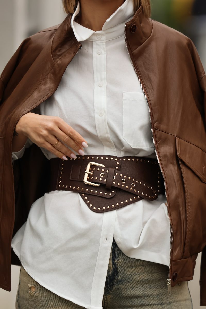 Cinturón de polipiel ancho para cintura con elástico y tachuelas en color dorado.