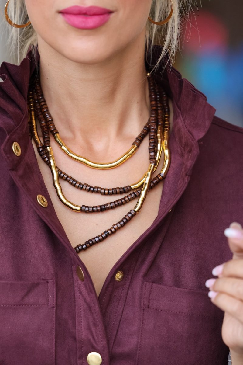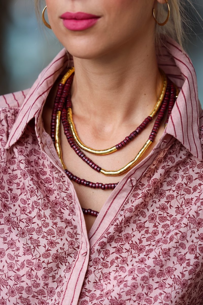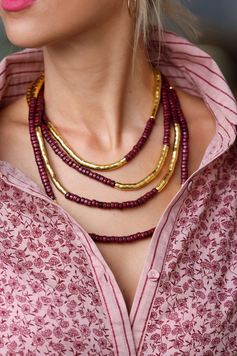 Collar de madera combinado con dorado. Disponible en 3 colores, burdeos, marrón y negro. Cierre con argolla.
