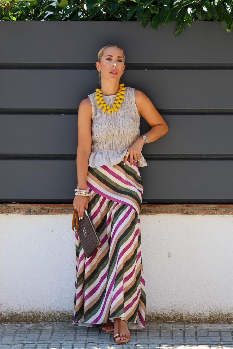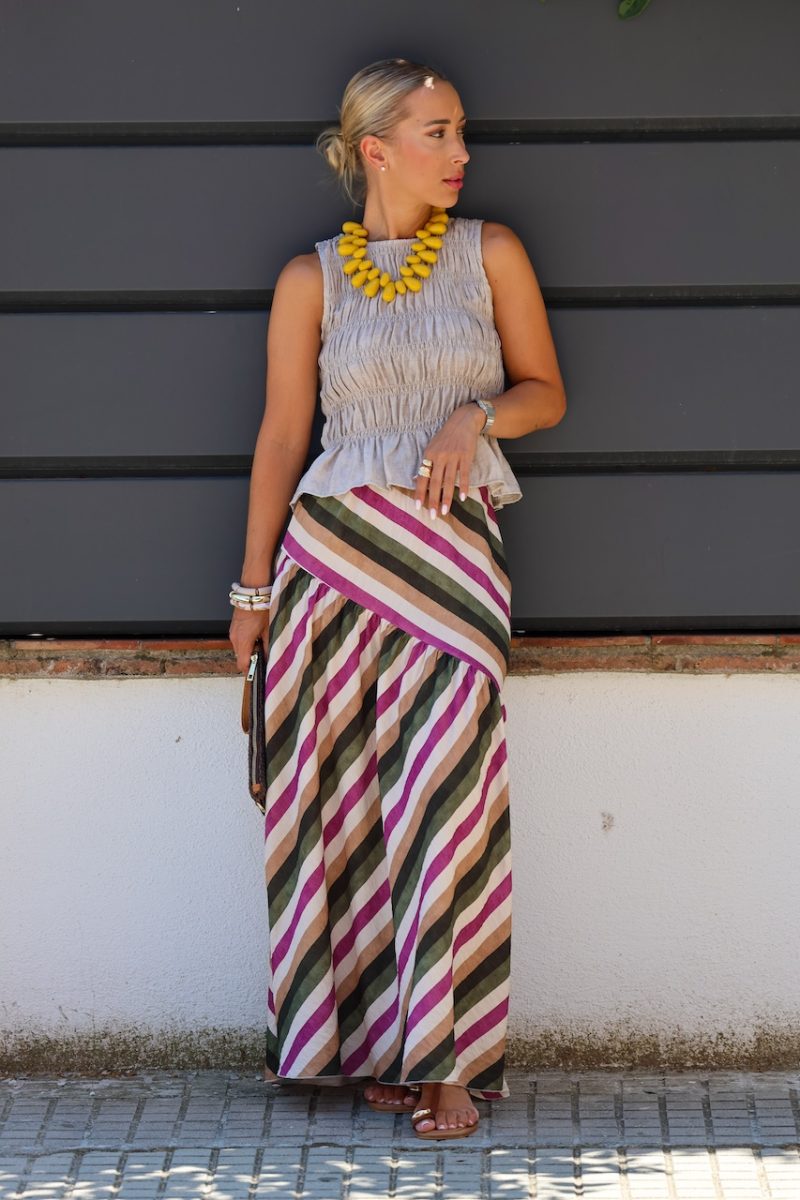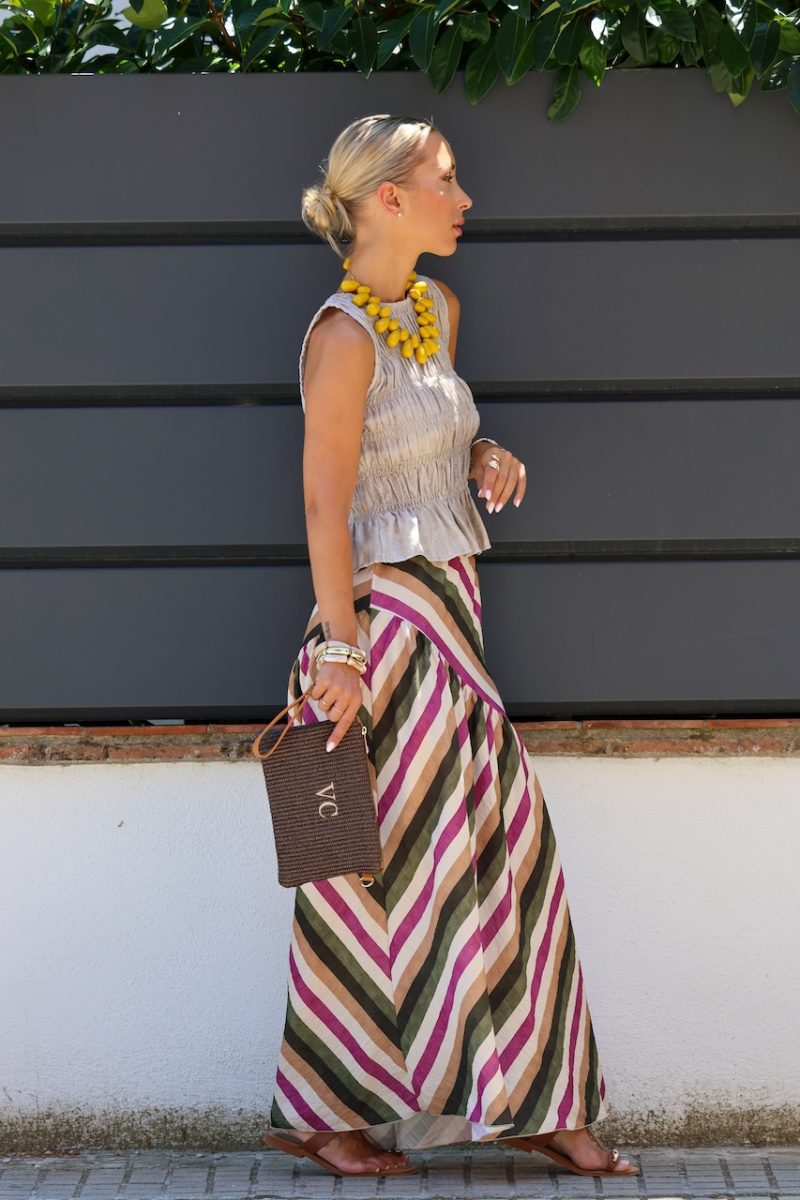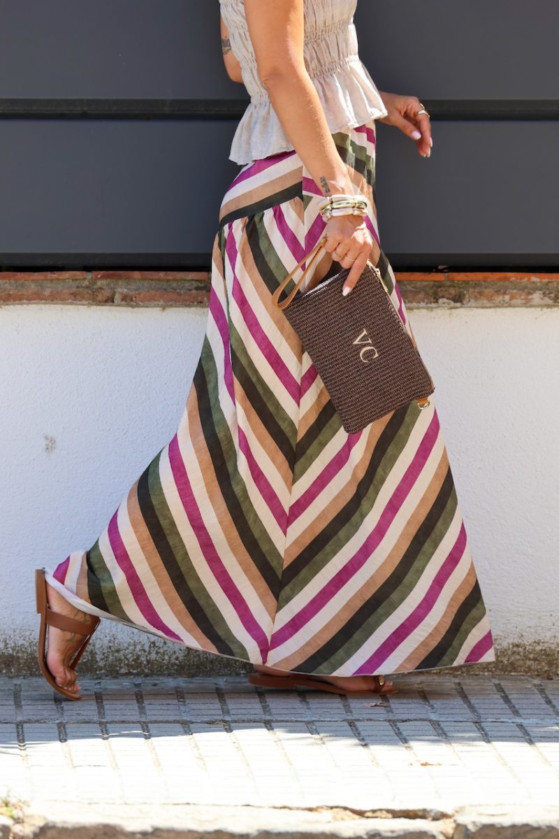 Falda larga estampada de rayas. Cintura con elástico para darle comodidad y ajustarse bien en la cintura. Talla única hasta talla L.