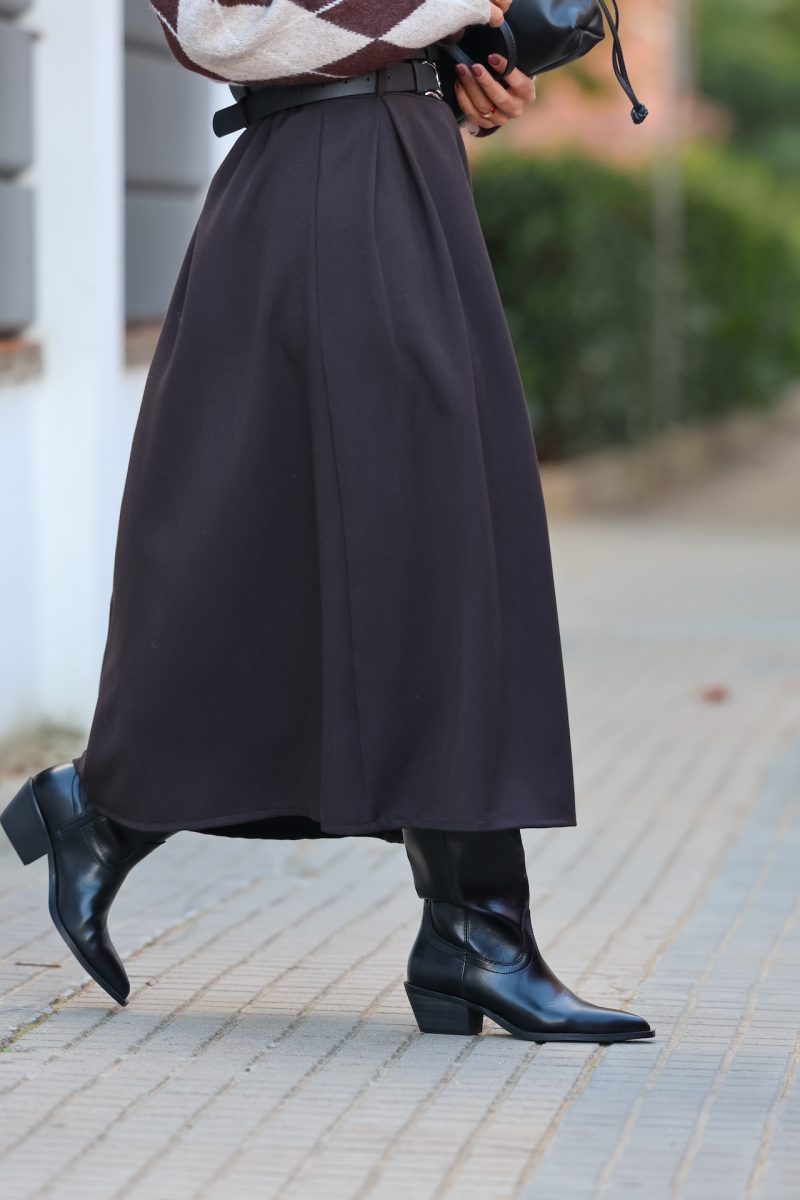 Su diseño de corte midi y pinzas delanteras estiliza la silueta, mientras el cinturón doble integrado aporta un toque moderno y diferencial. Ideal para combinar con jerséis o camisas y elevar tus looks de otoño e invierno con un aire sofisticado.