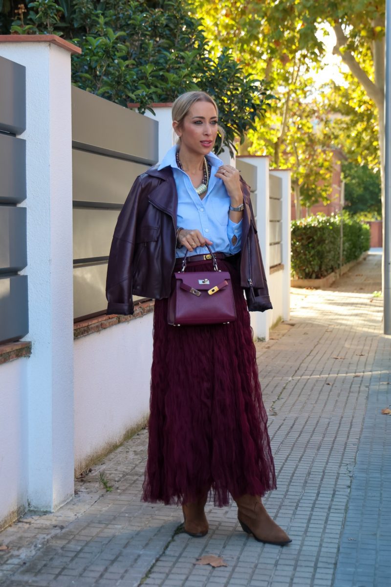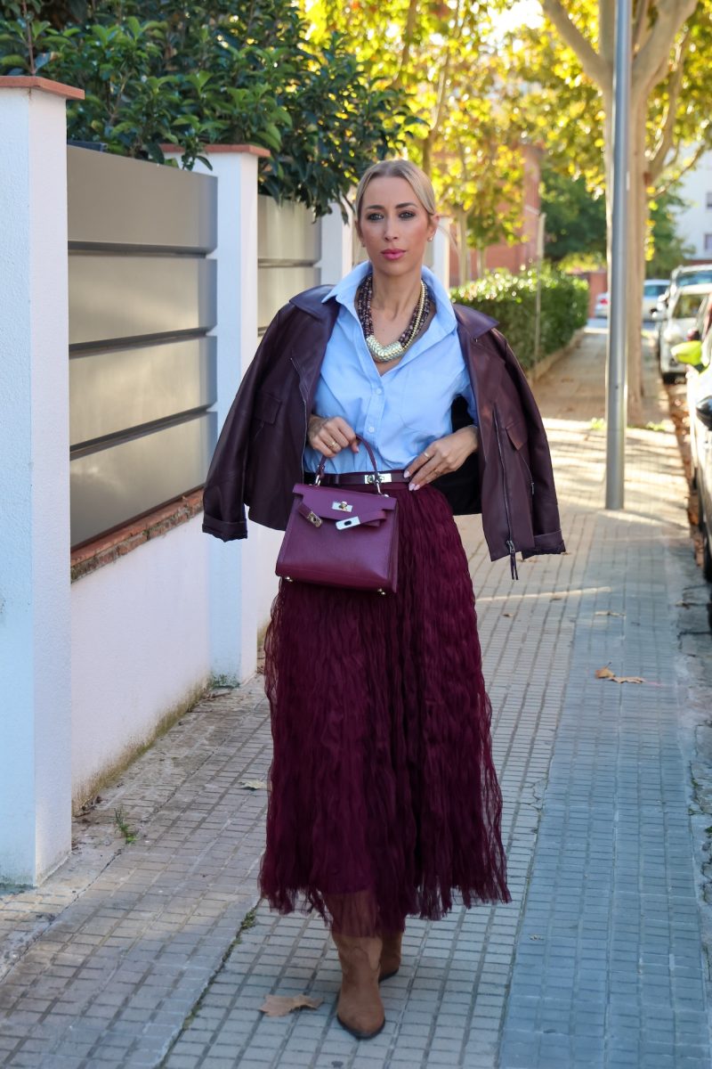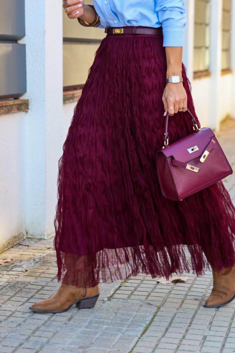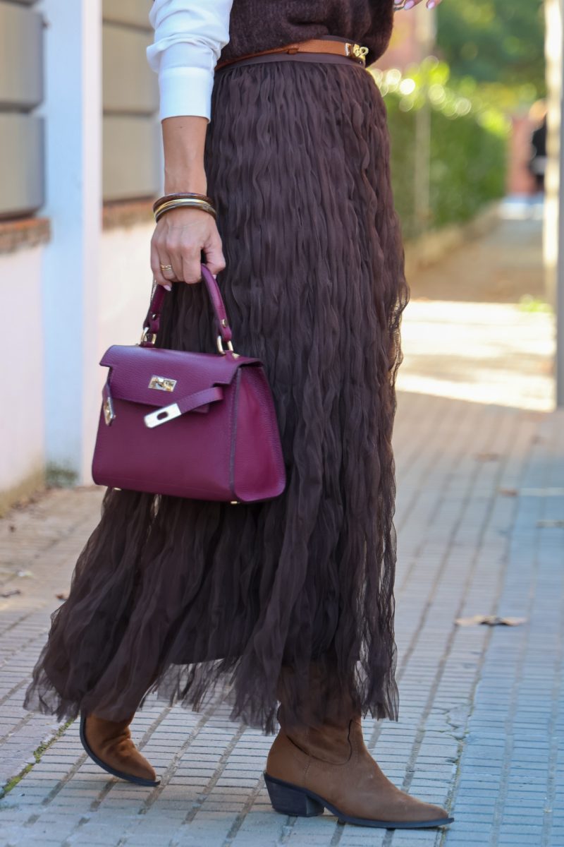 Falda de tul con volantes. Cintura con elástico y forro en el interior. Tallaje único completo. Disponible en dos colores, burdeos y marrón.