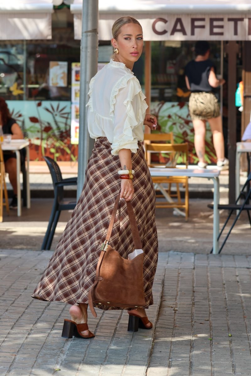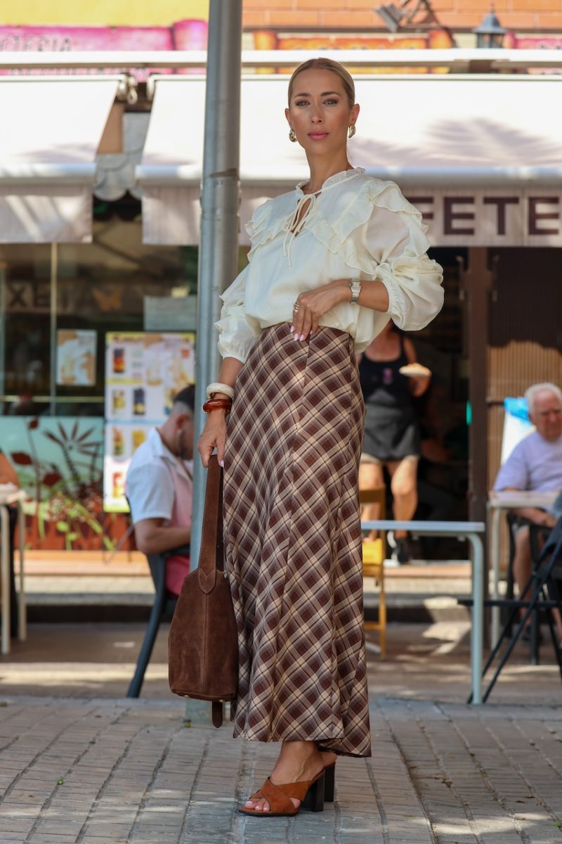 Falda vintage trenza café es la prenda perfecta para quines aman el estilo clásico con un toque moderno.. Su diseño en corte libia A estiliza la silueta y ofrece movimiento fluido al camina. Estampado de cuadros diagonales en tonos marrón y beige aporta un aire retro muy versátil, ideal para combinar con blusas románticas. Cremallera de cierre en el lateral. Talla de la modelo la s.