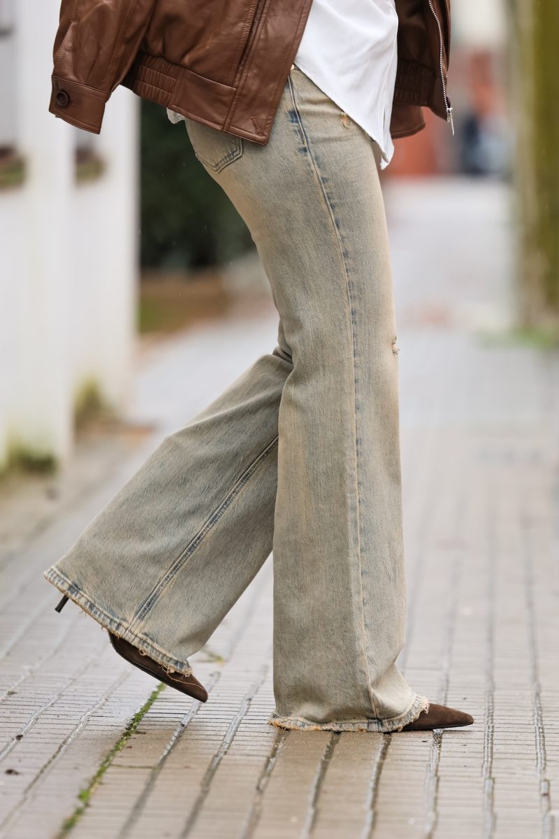 Jean Tito de tiro bajo/medio, inspirado en la estética icónica de los años 90. Un diseño que recupera el espíritu vintage con un aire actual y favorecedor. Confeccionado en denim de lavado claro, presenta un corte recto ligeramente acampanado que estiliza la pierna y aporta movimiento al caminar.