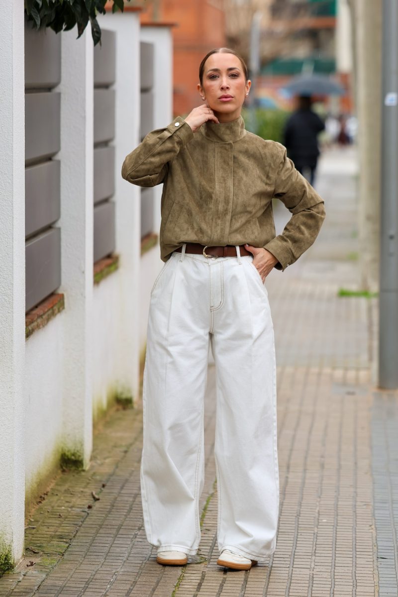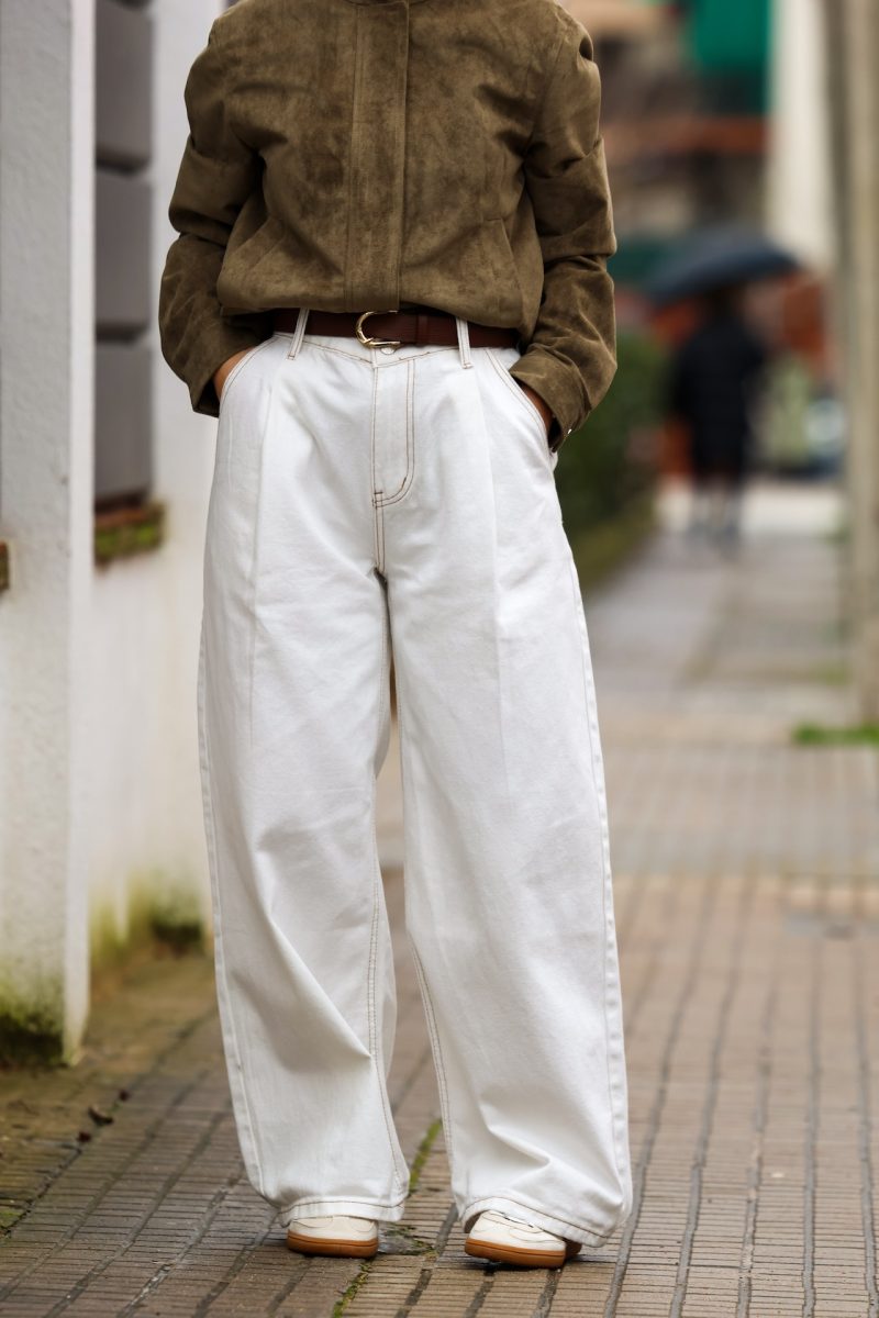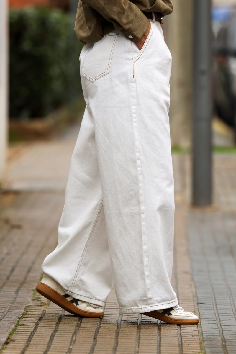 Jeans baggy beige de estilo relajado y actual. Diseño de pernera ancha, tiro medio y tejido denim cómodo que se adapta al movimiento. Su tono beige los convierte en una prenda muy fácil de combinar, perfecta para looks casuales con un punto moderno.
