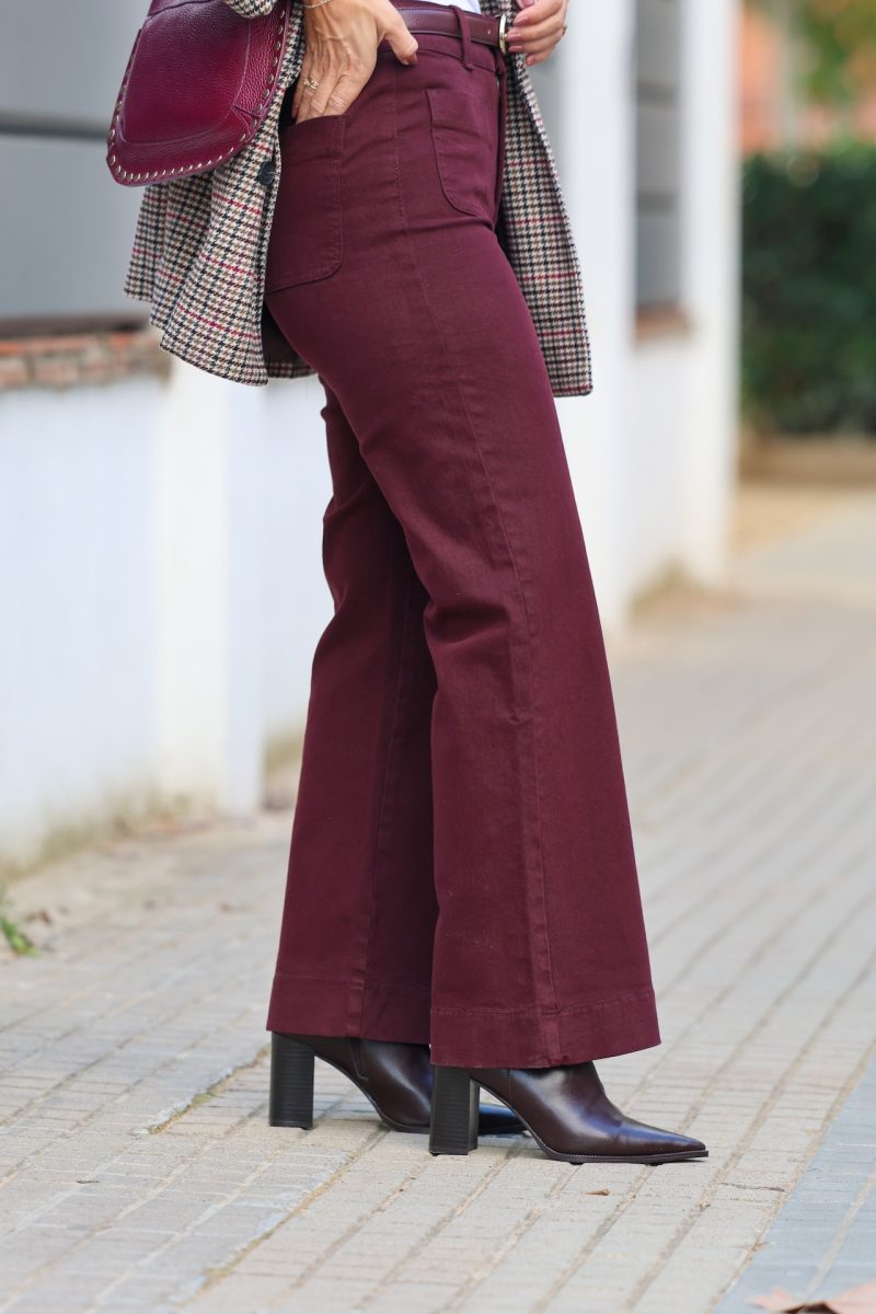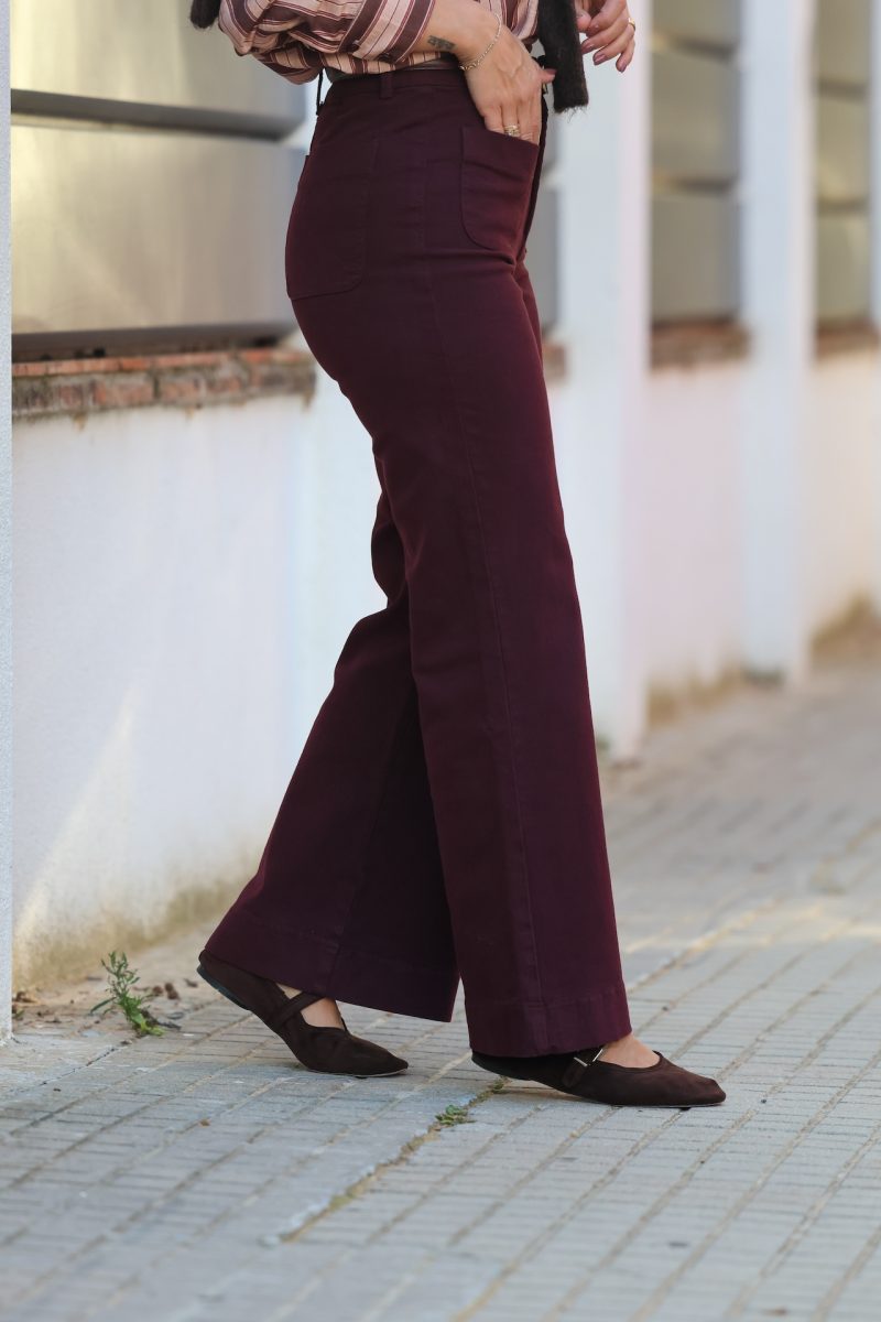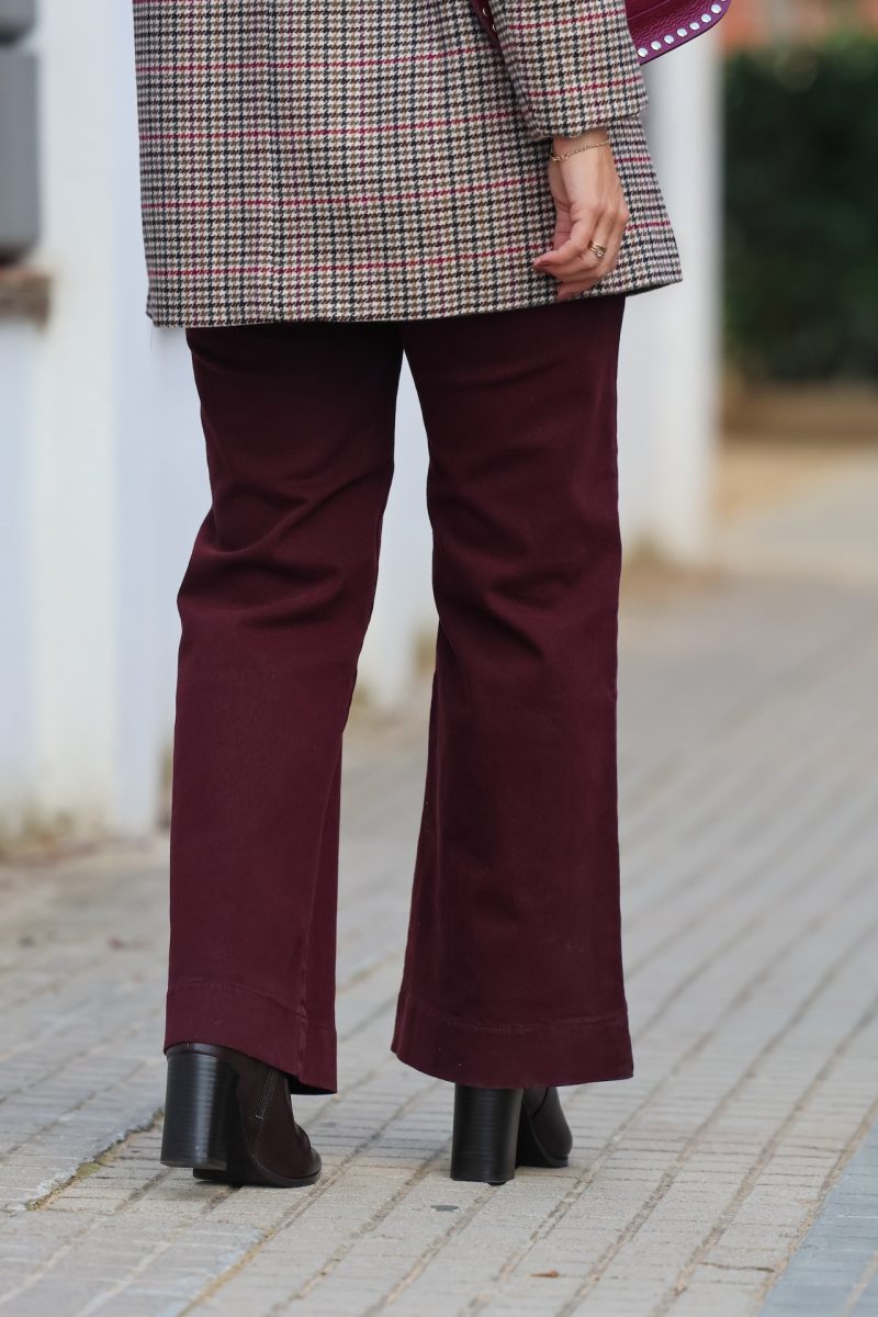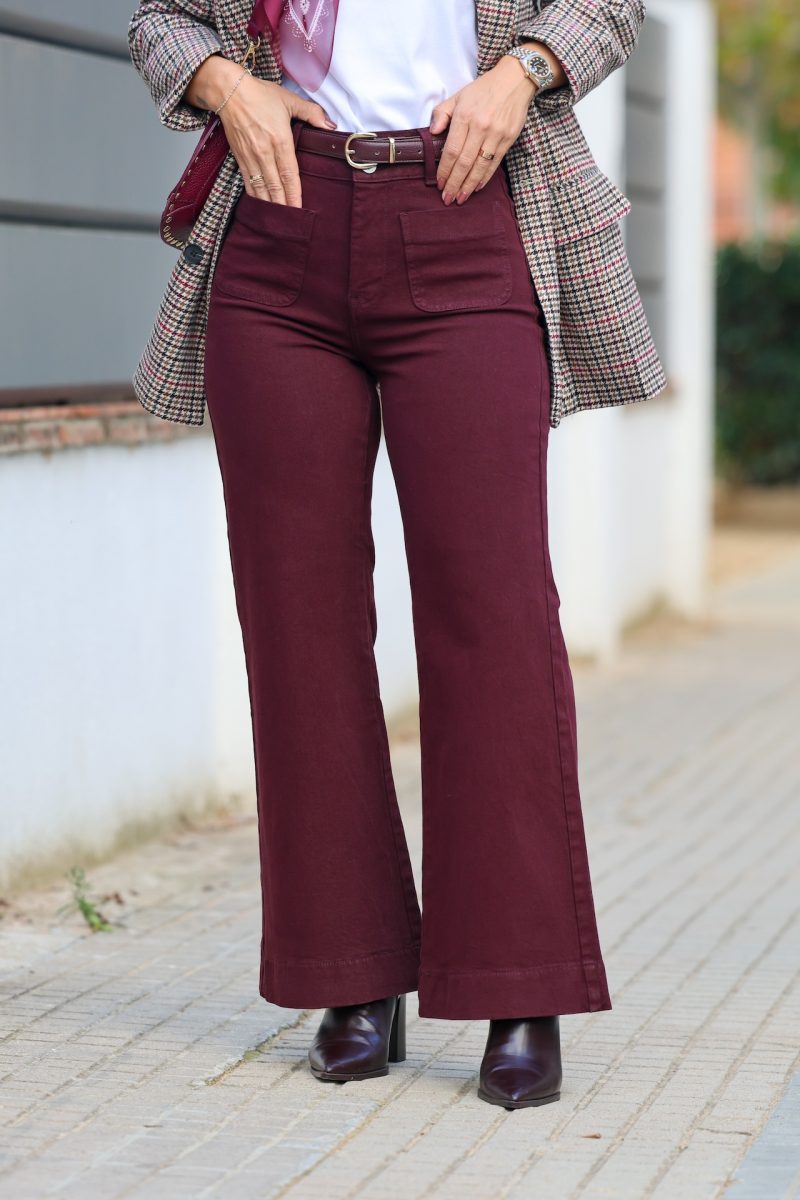 Jeans tiro alto en color burdeos. Largo tipo tobillero, pierna recta que abre levemente al final. Bolsillos frontales tipo “utility”. Talla de la modelo 36.