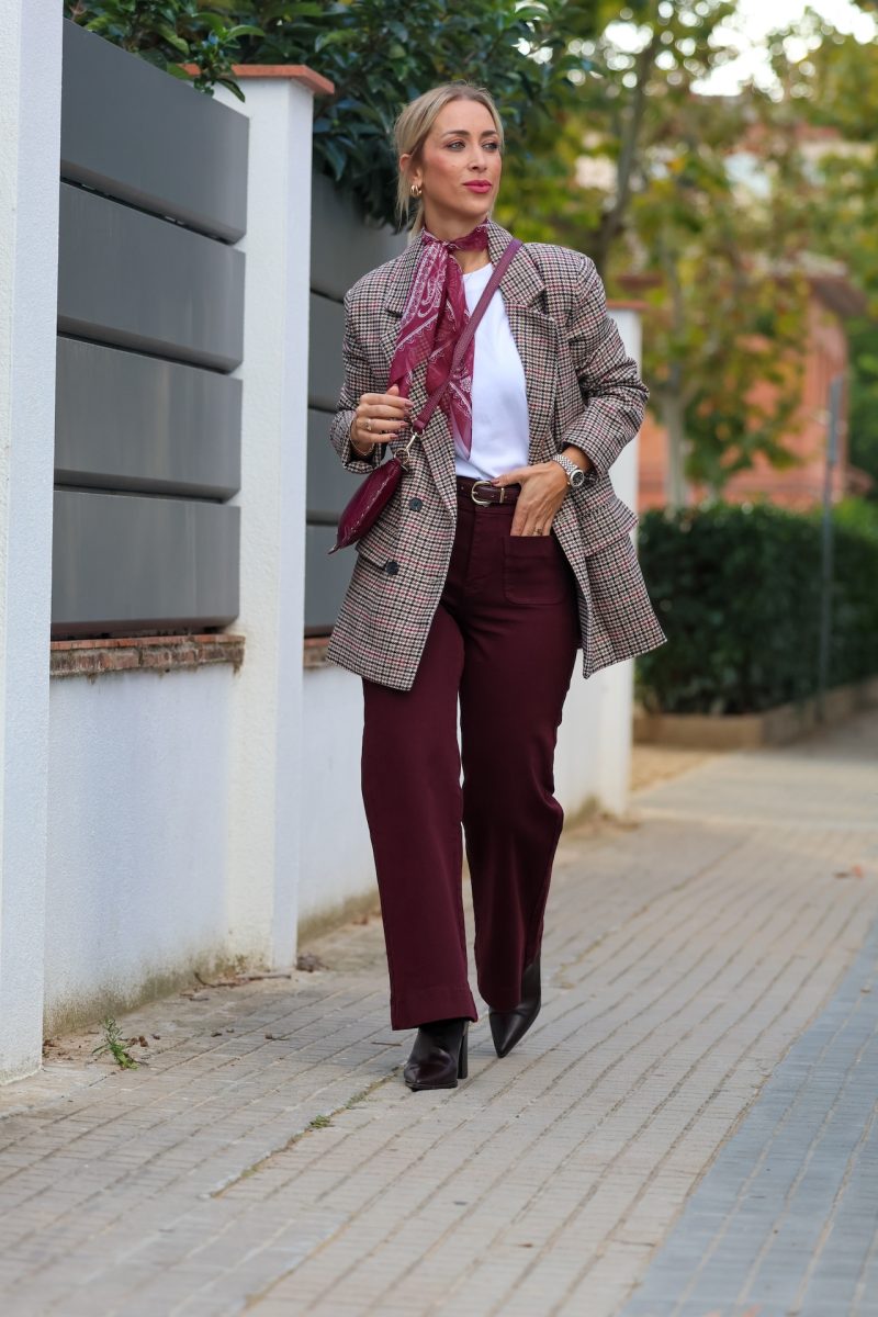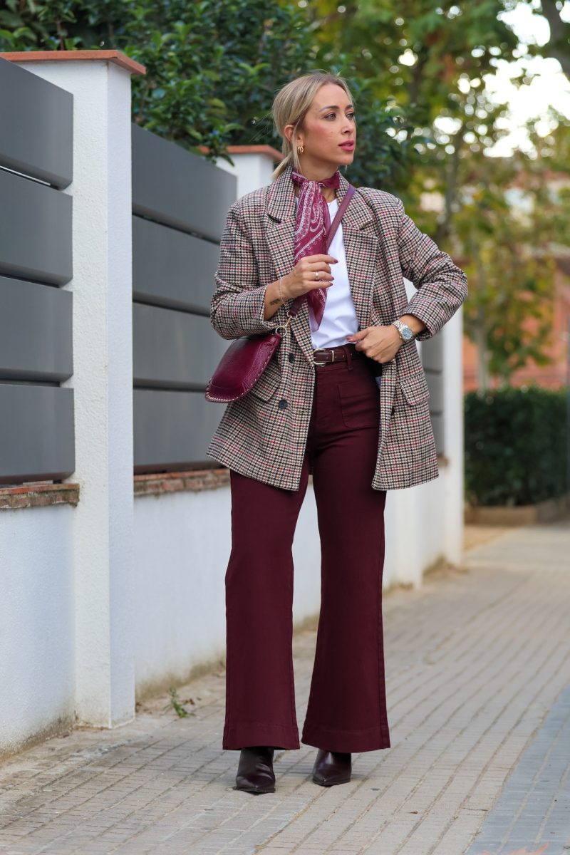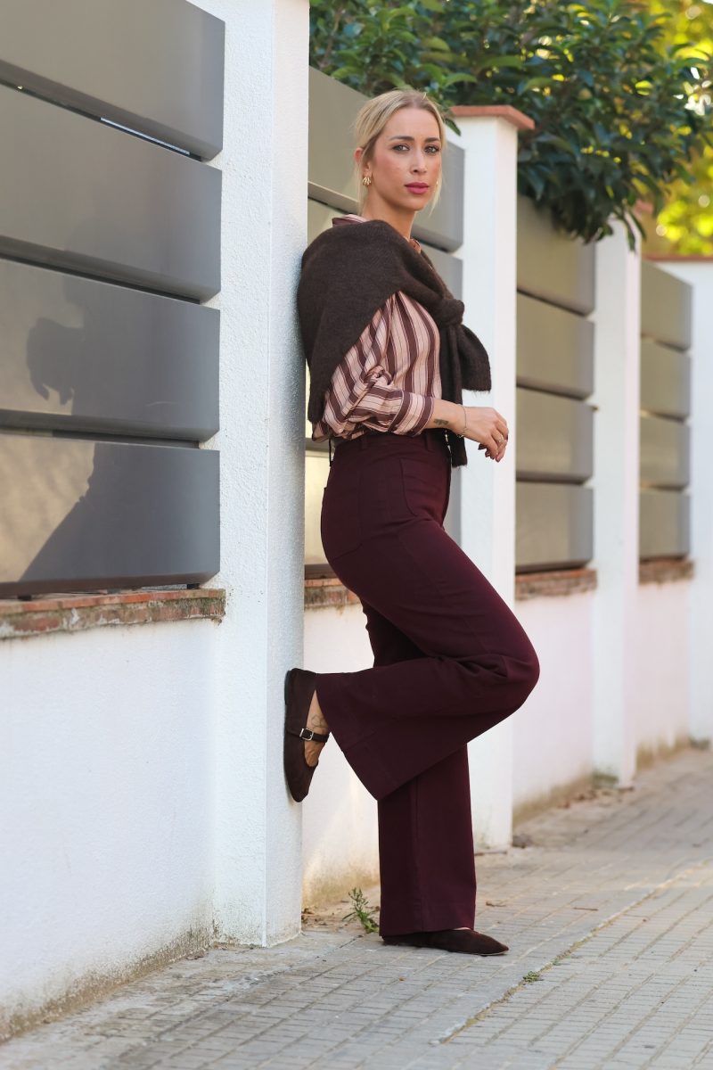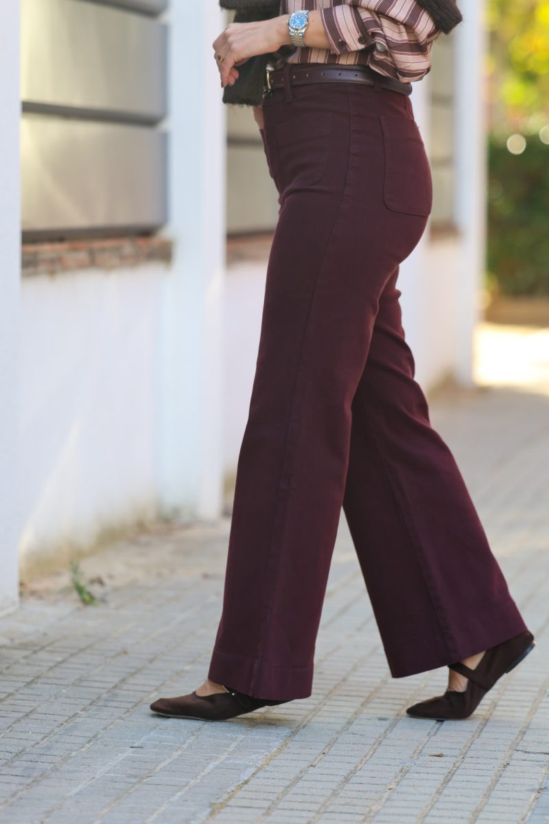 Jeans tiro alto en color burdeos. Largo tipo tobillero, pierna recta que abre levemente al final. Bolsillos frontales tipo “utility”. Talla de la modelo 36.