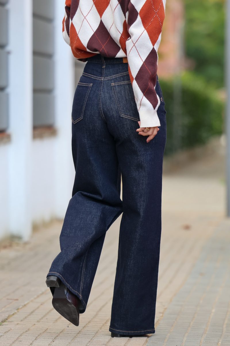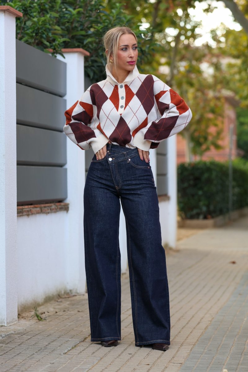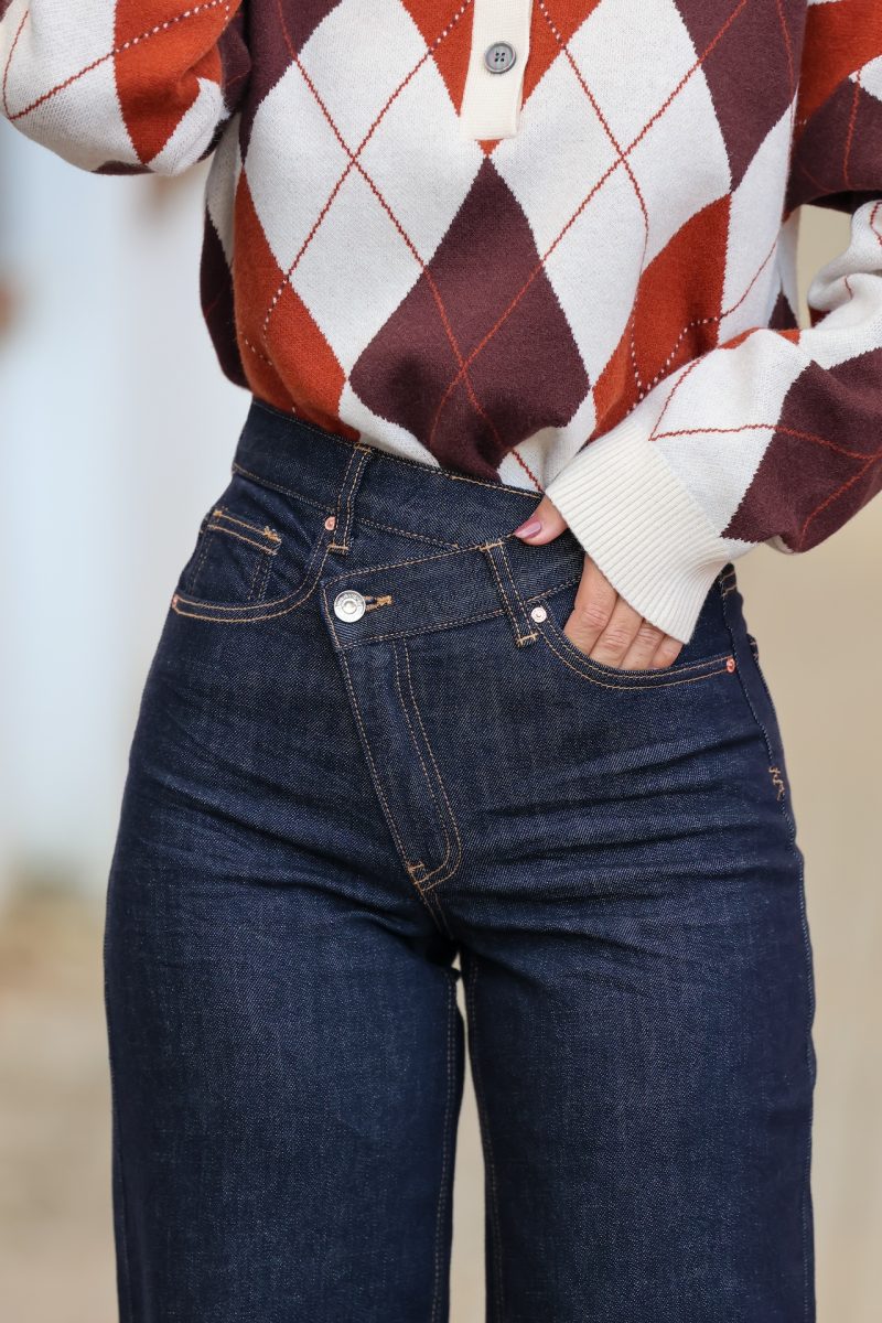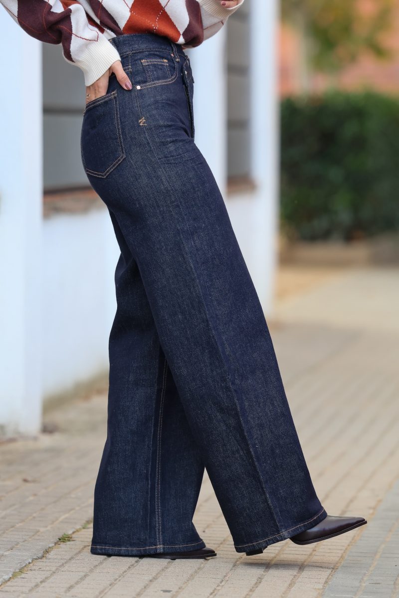 Jeans denim de tiro medio alto, recto y ancho desde la cadera hasta abajo. ESTILIZA LA CINTURA Y ALARGA LA PIERNA. TALLA NORMAL.