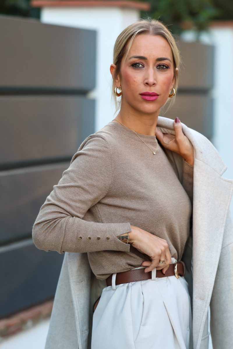 Jersey básica en color camel. Cuello redondo y botones decorativos en el puño. Tallaje doble.