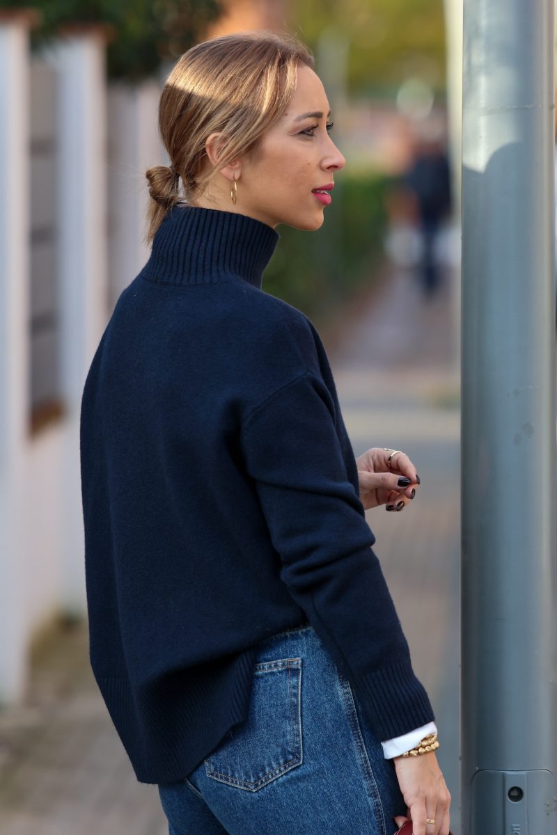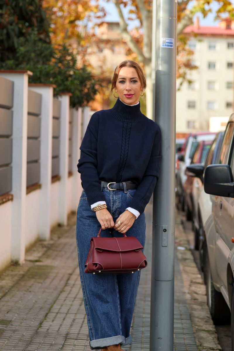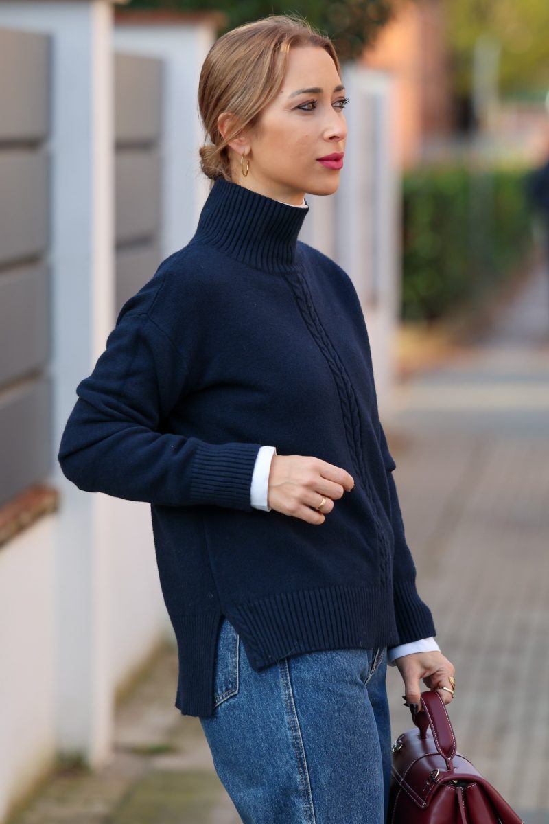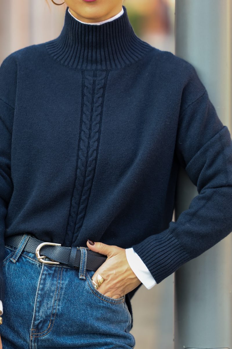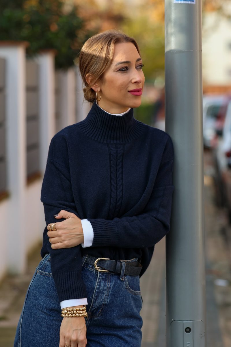 Jersey Bolonia marino de punto suave y agradable, con cuello alto y detalle de trenza central que aporta un toque clásico y elegante. Su diseño atemporal lo convierte en un básico imprescindible para el día a día, perfecto para combinar con jeans, pantalones de vestir o faldas. Ideal para los meses más fríos por su calidez y comodidad.