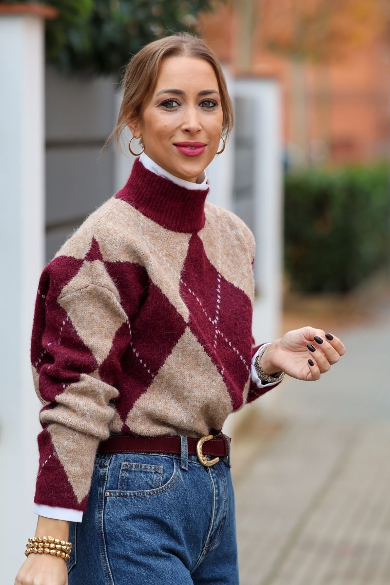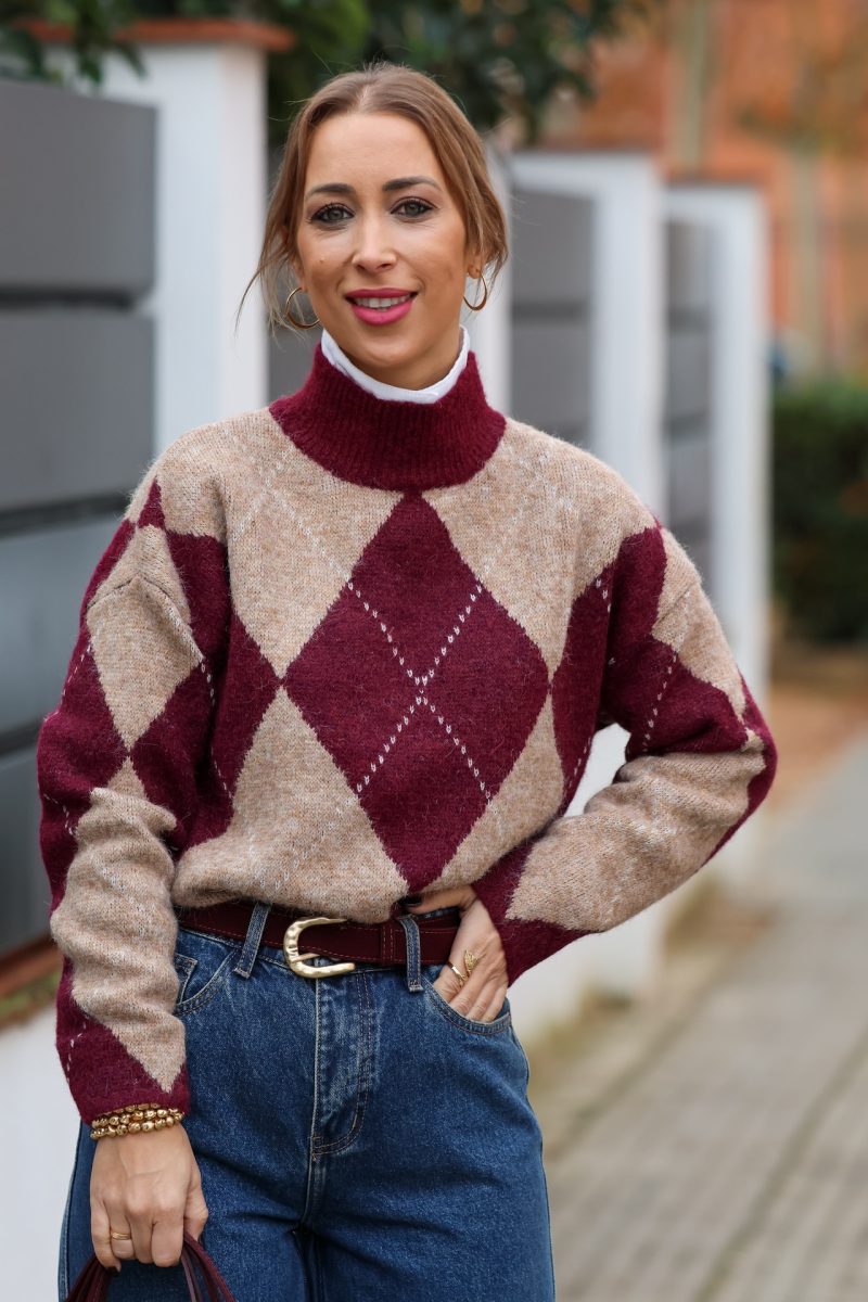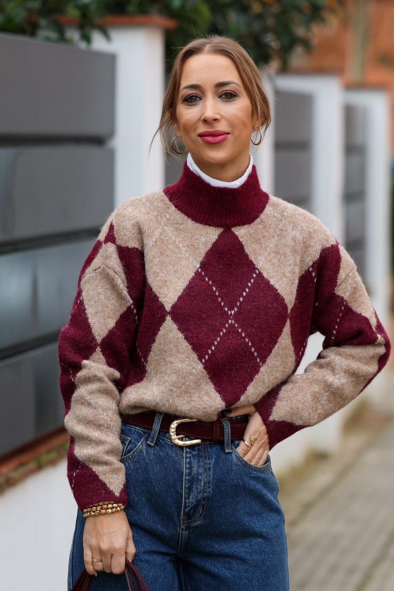 Jersey de punto suave con diseño de rombos en tonos burdeos y beige. Cuello alto y corte cómodo que combina estilo clásico y tendencia. Ideal para looks de diario con vaqueros o pantalón sastre. Atemporal y muy favorecedor.