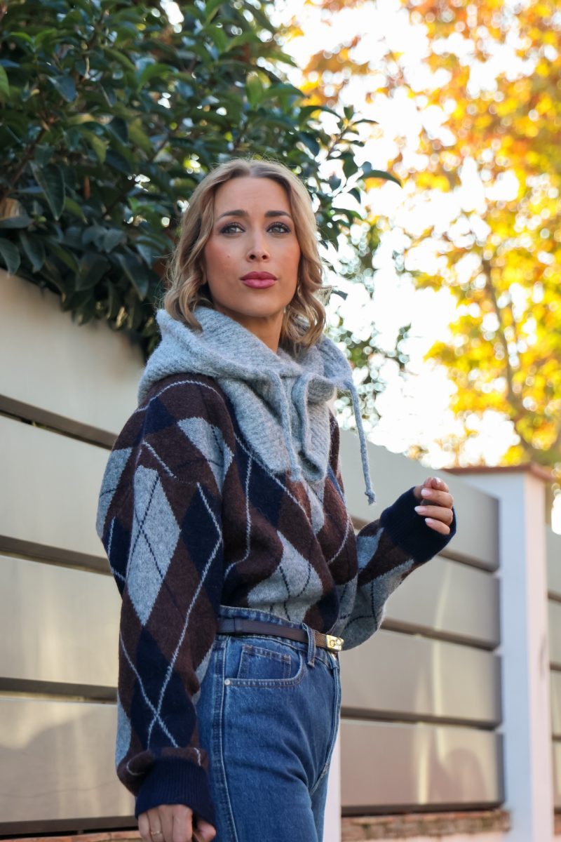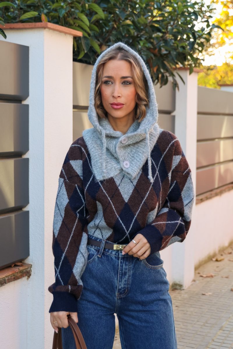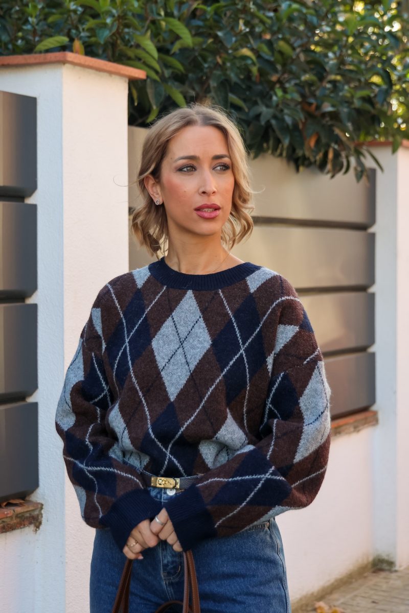 Jersey de punto suave con diseño clásico de rombos en tonos tierra, azul y gris. Cómodo, calentito y con fit ligeramente oversize. Perfecto para combinar con jeans o pantalón de vestir y darle un toque elegante a tus looks de diario.