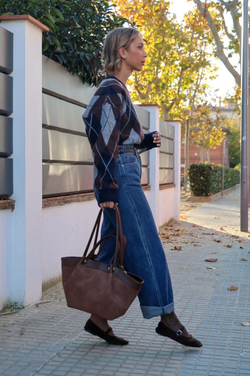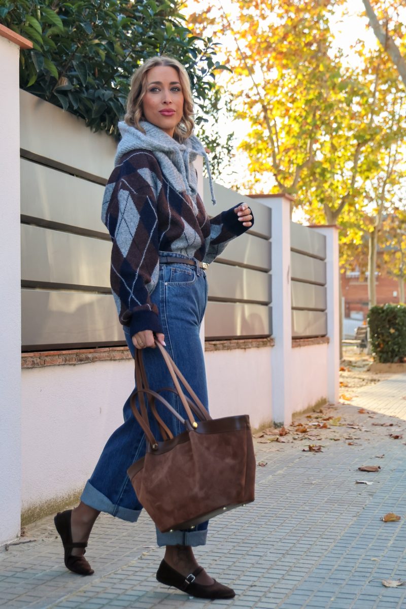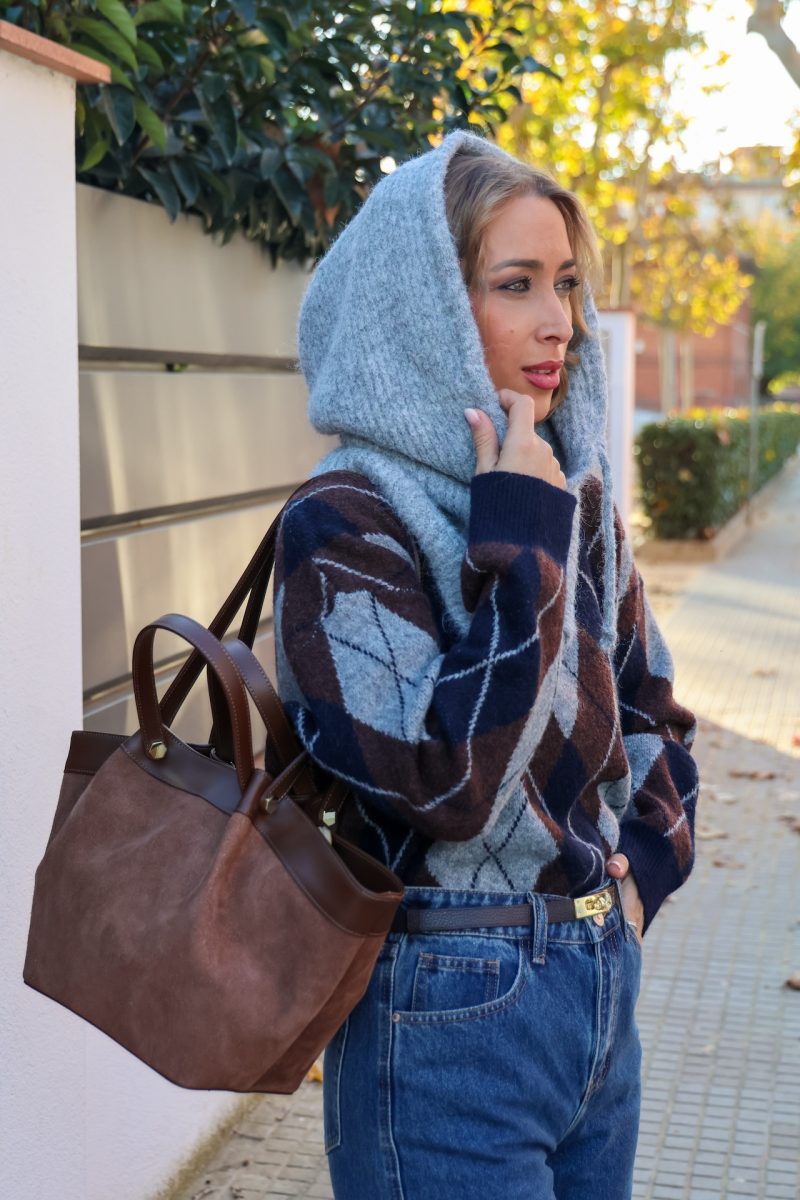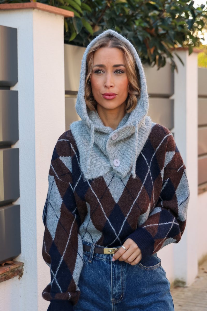 Jersey de punto suave con diseño clásico de rombos en tonos tierra, azul y gris. Cómodo, calentito y con fit ligeramente oversize. Perfecto para combinar con jeans o pantalón de vestir y darle un toque elegante a tus looks de diario.